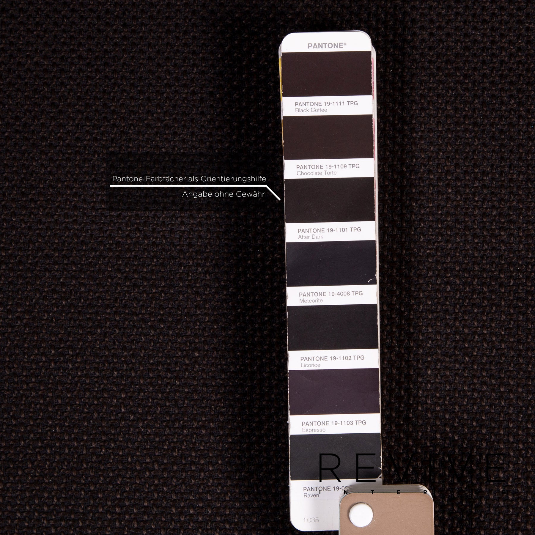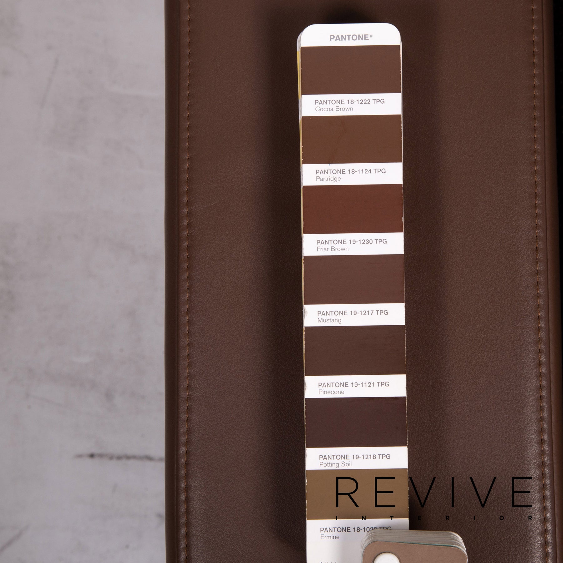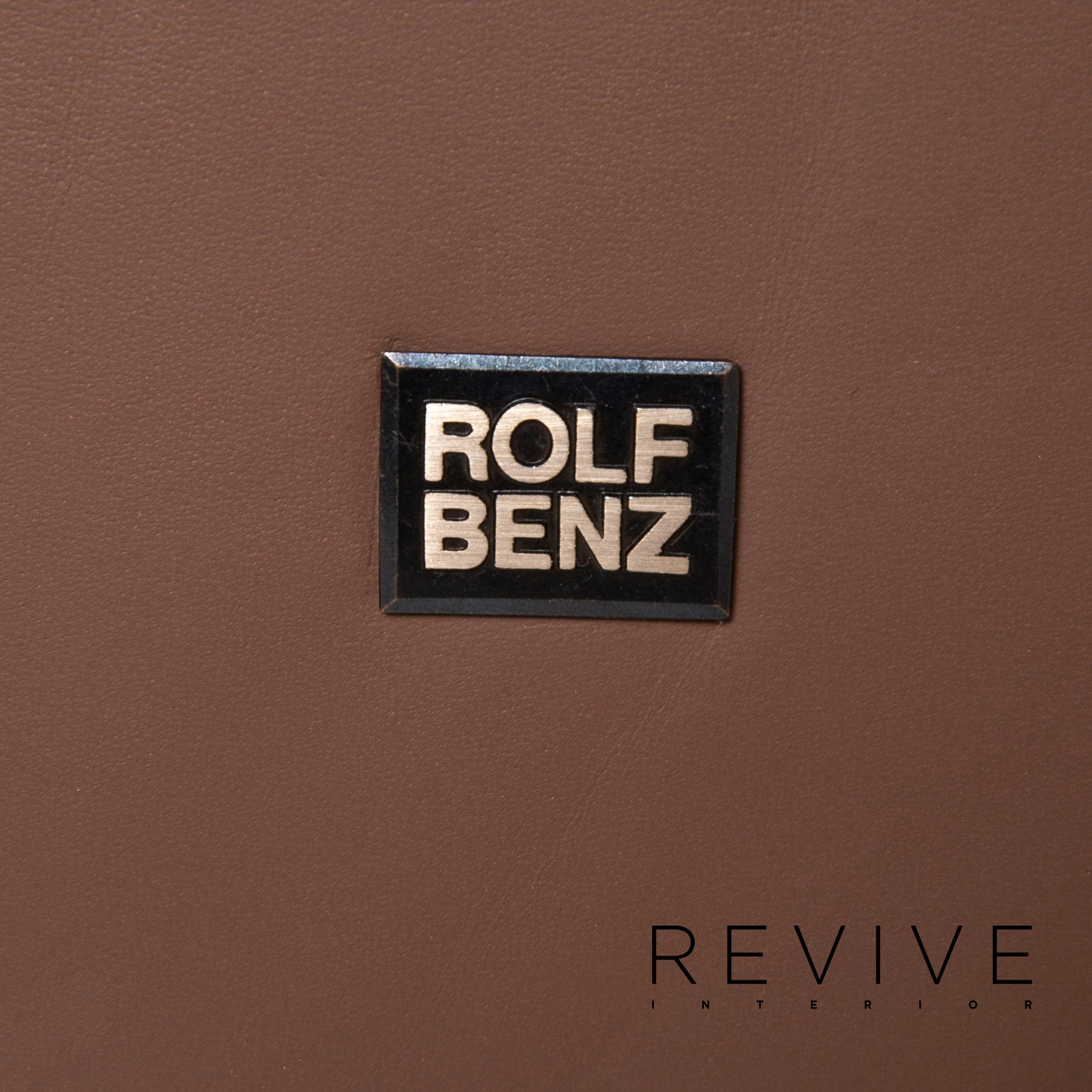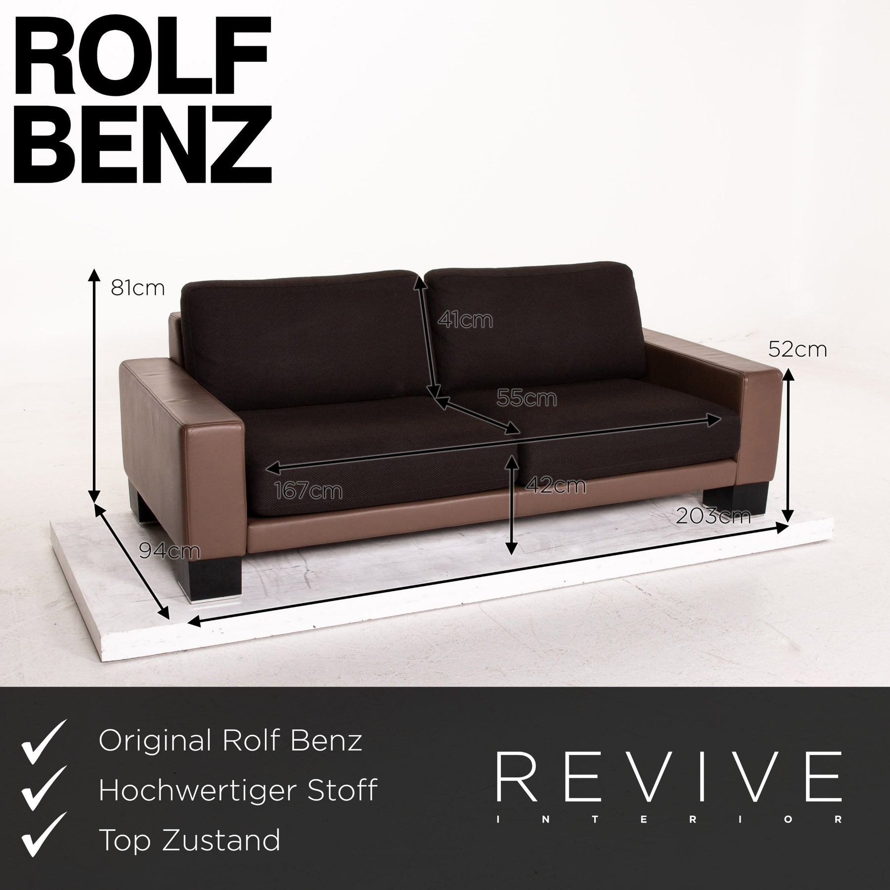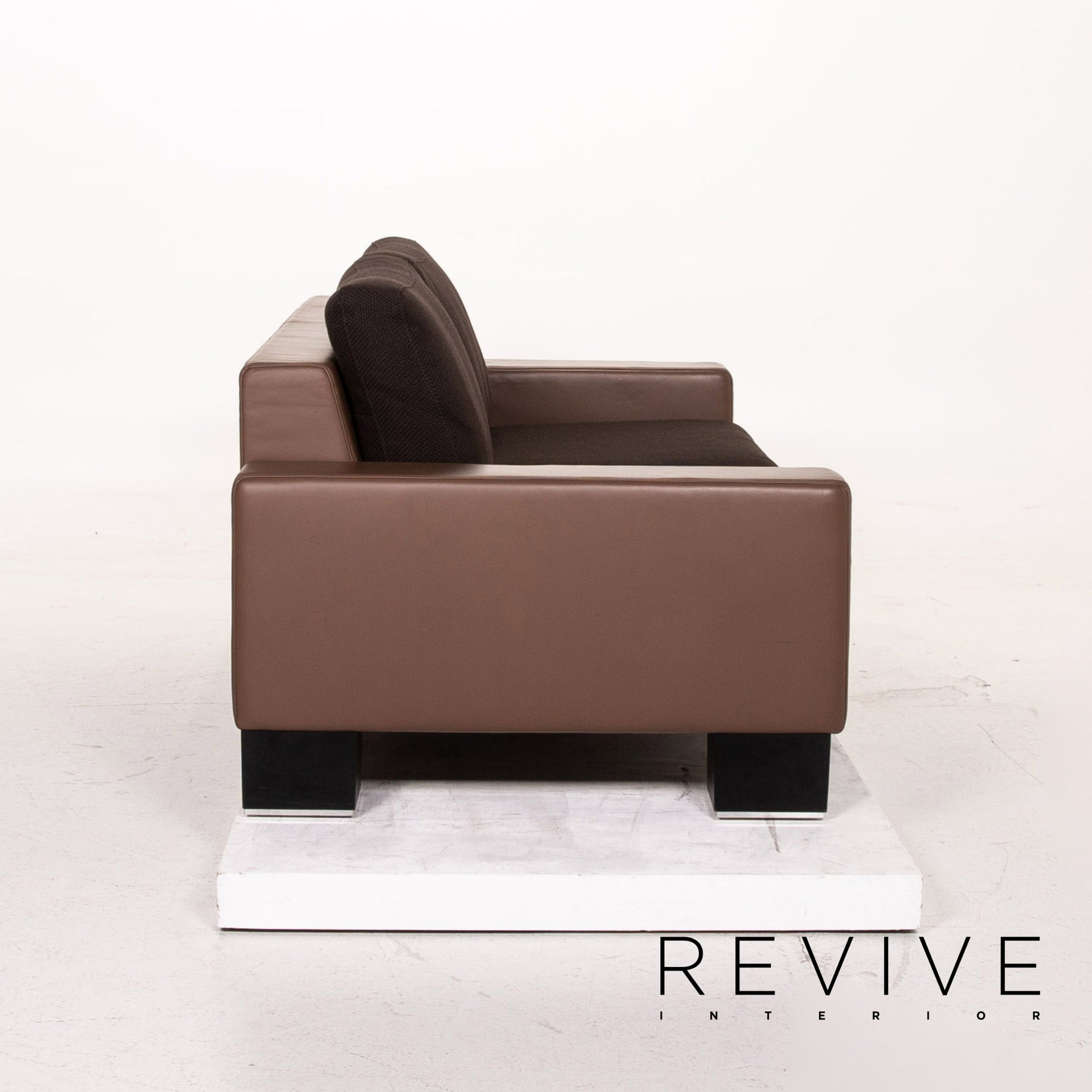 The three-seater from Rolf Benz is upholstered in brown genuine leather and dark brown fabric. It stands on dark feet with metal accents. The sofa is characterized by its cubic, linear design and the comfortable upholstery.