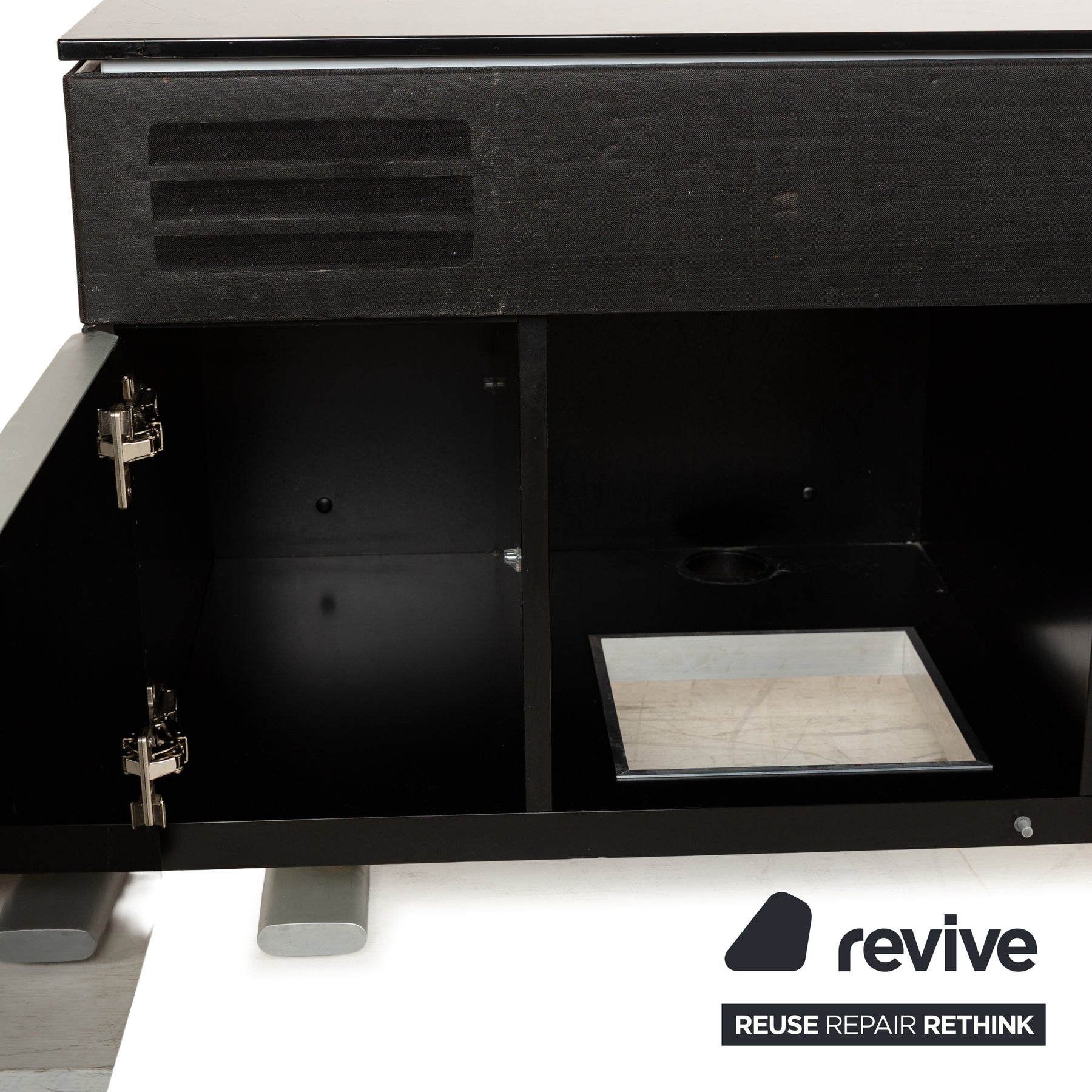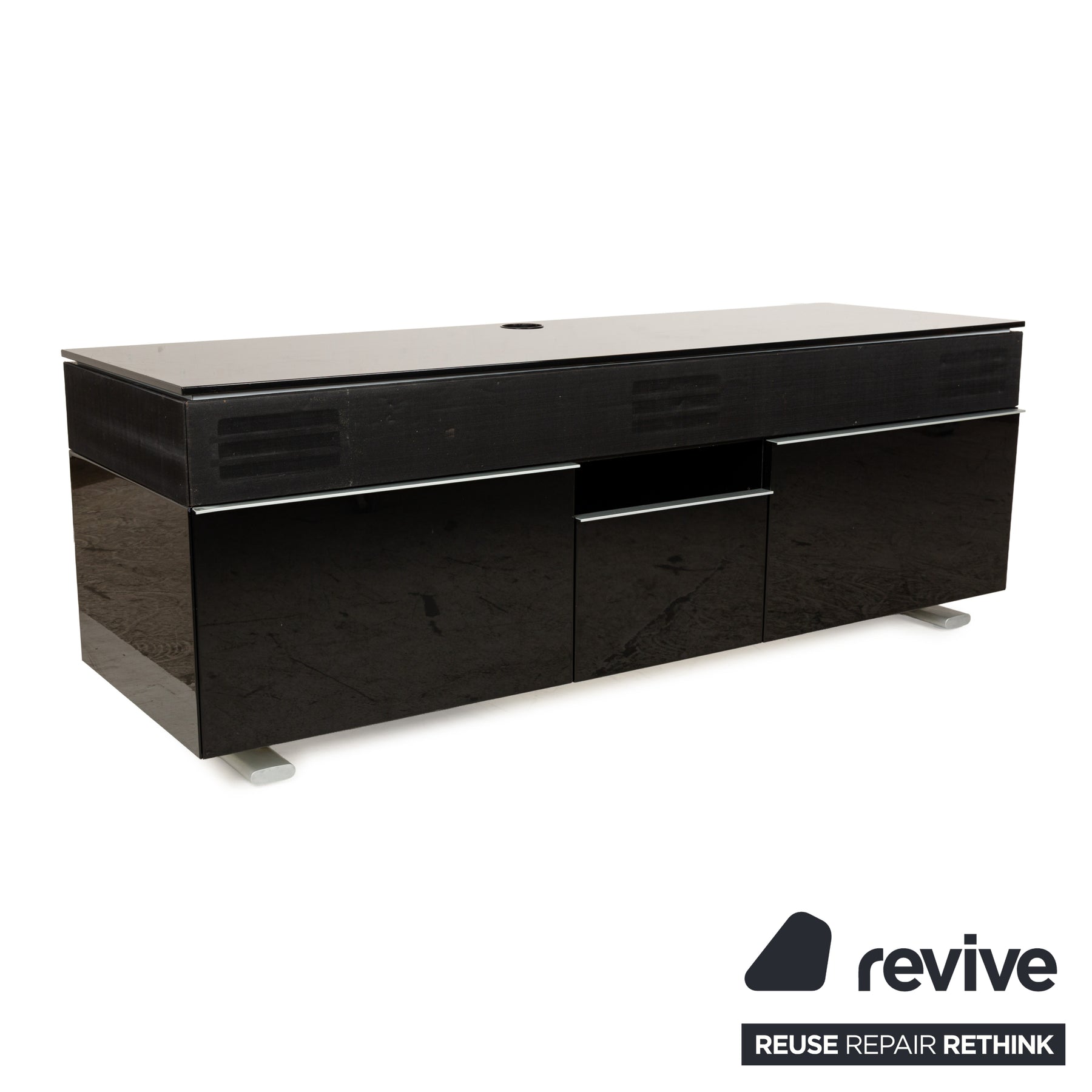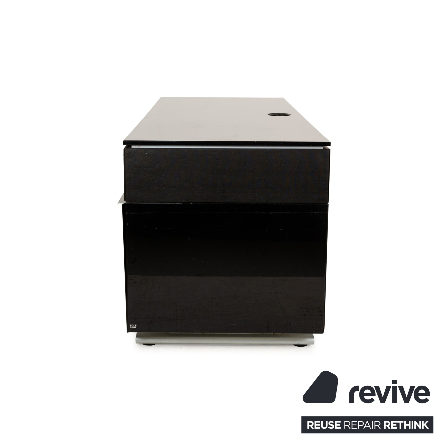 The Rolf Benz sideboard is made of high-gloss black wood and stands on low metal elements. It features a classic, angular design and offers ample storage space behind a cabinet door and in two large drawers. Thanks to cable cutouts in the top and base, the lowboard also makes an excellent media board.