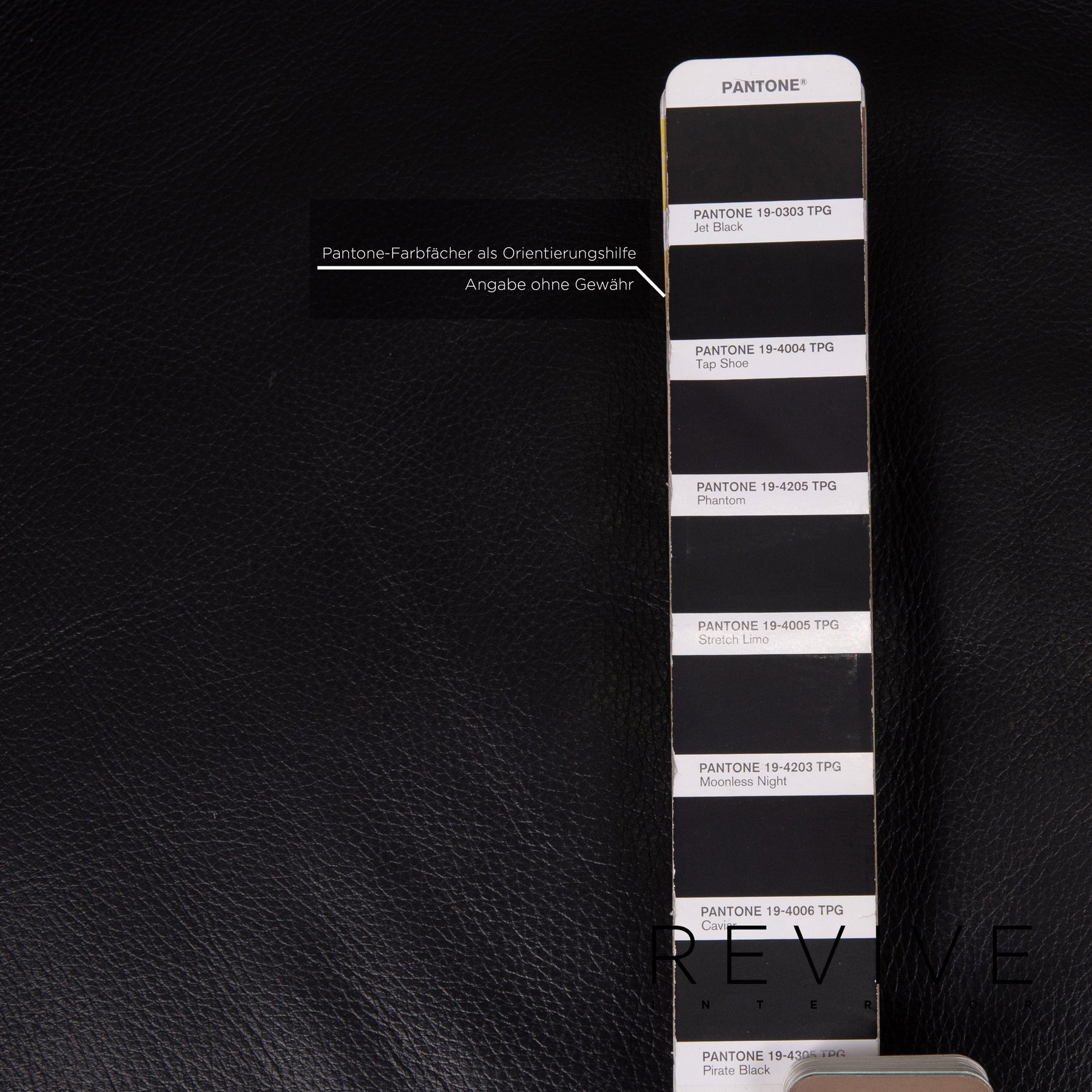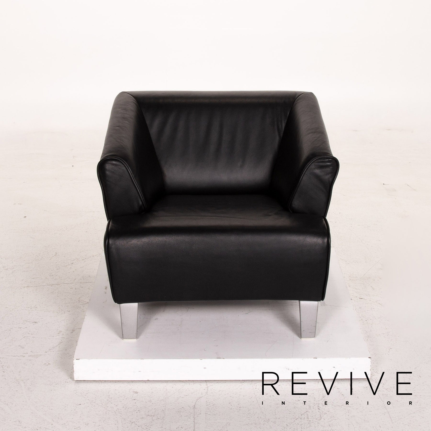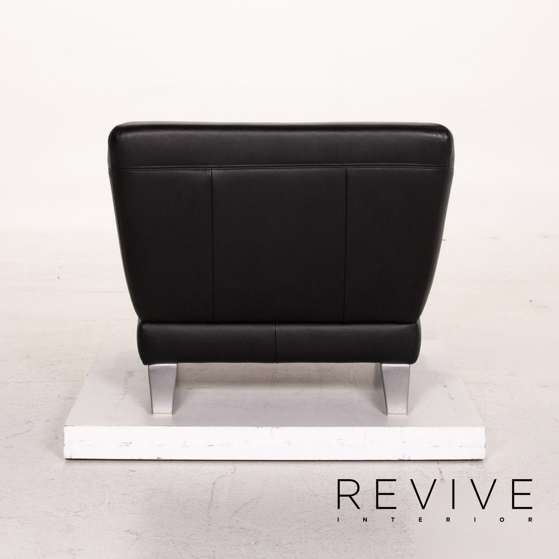 The armchair by Rolf Benz is upholstered in black genuine leather and stands on high metal feet. The armrests sloping forward and the cubic design characterize the sofa.