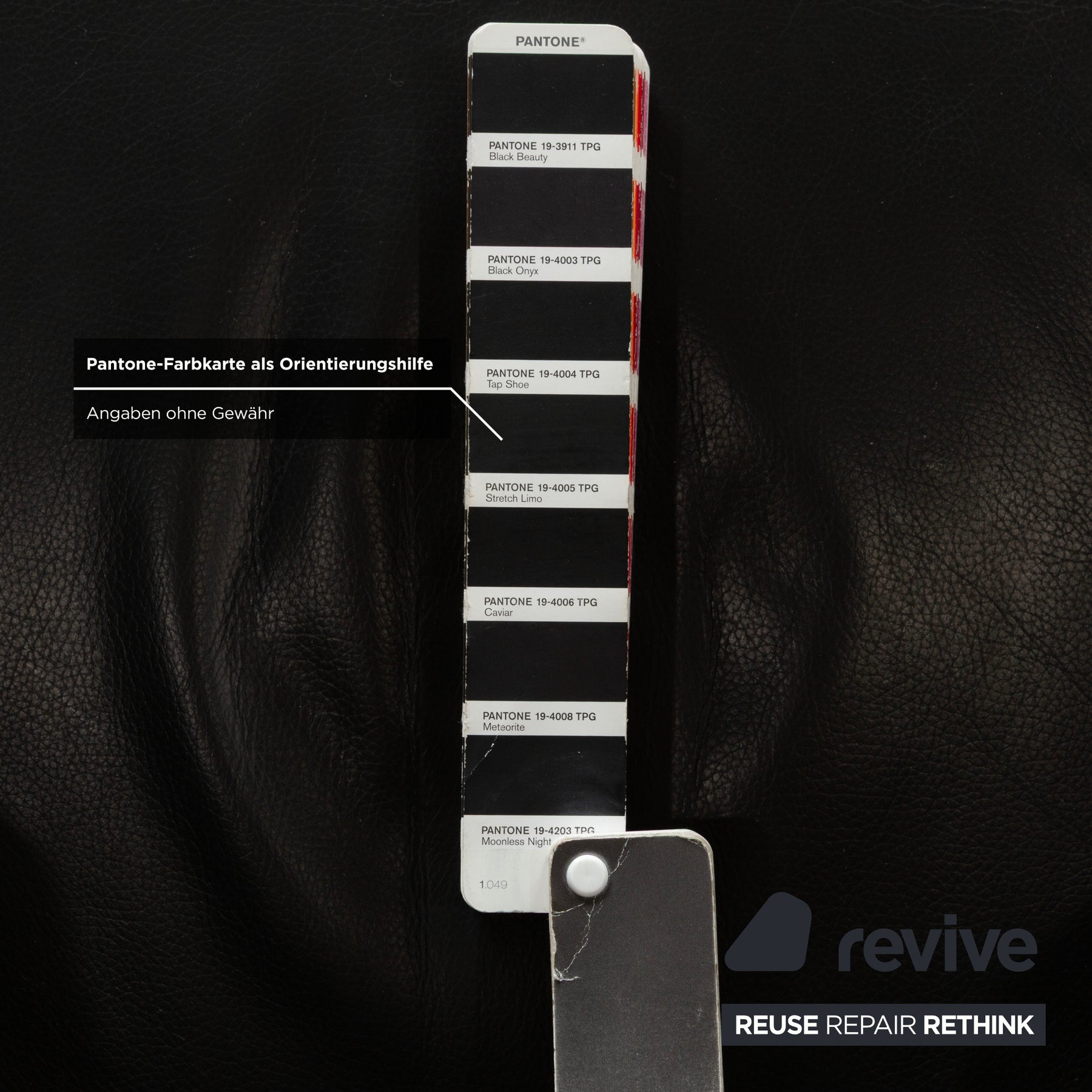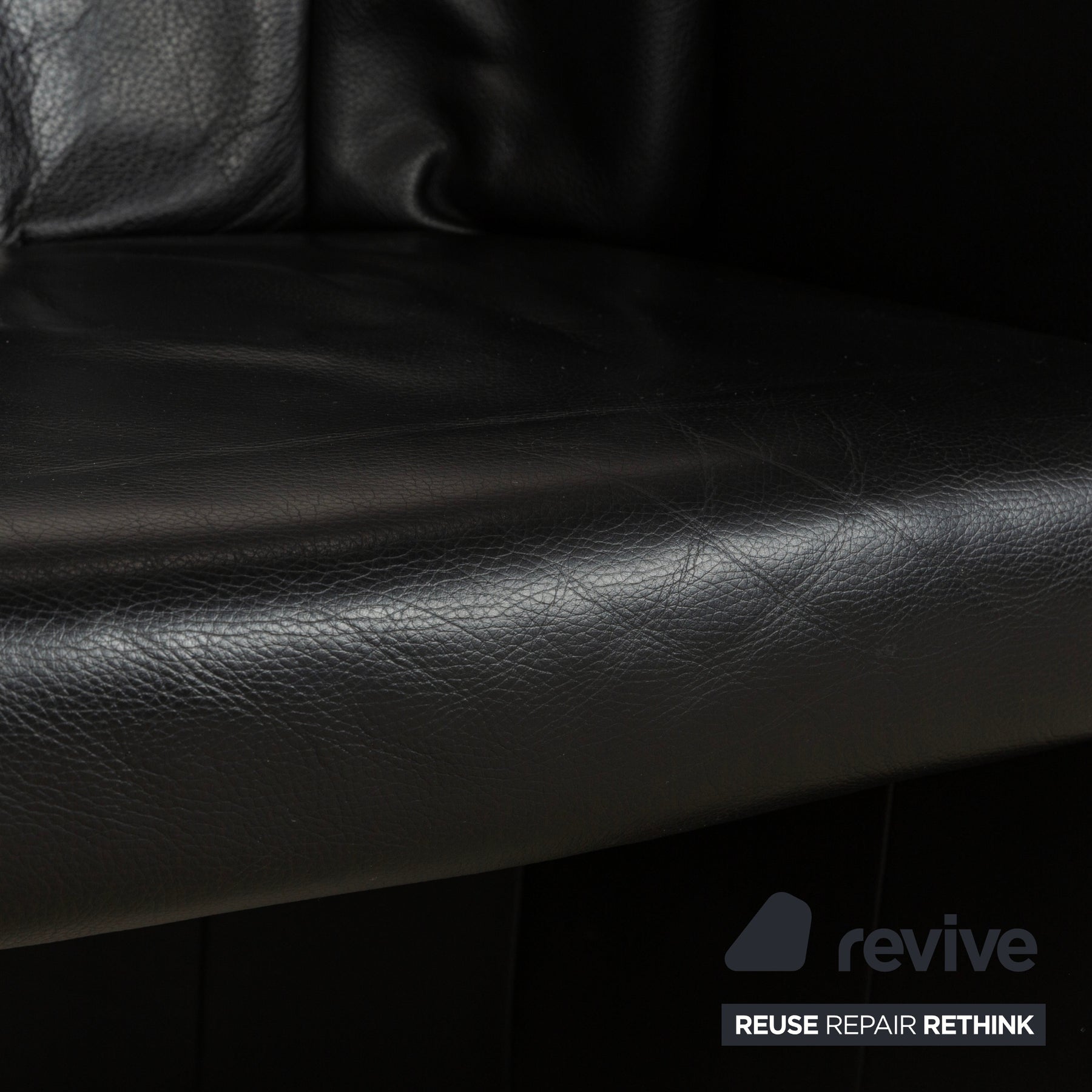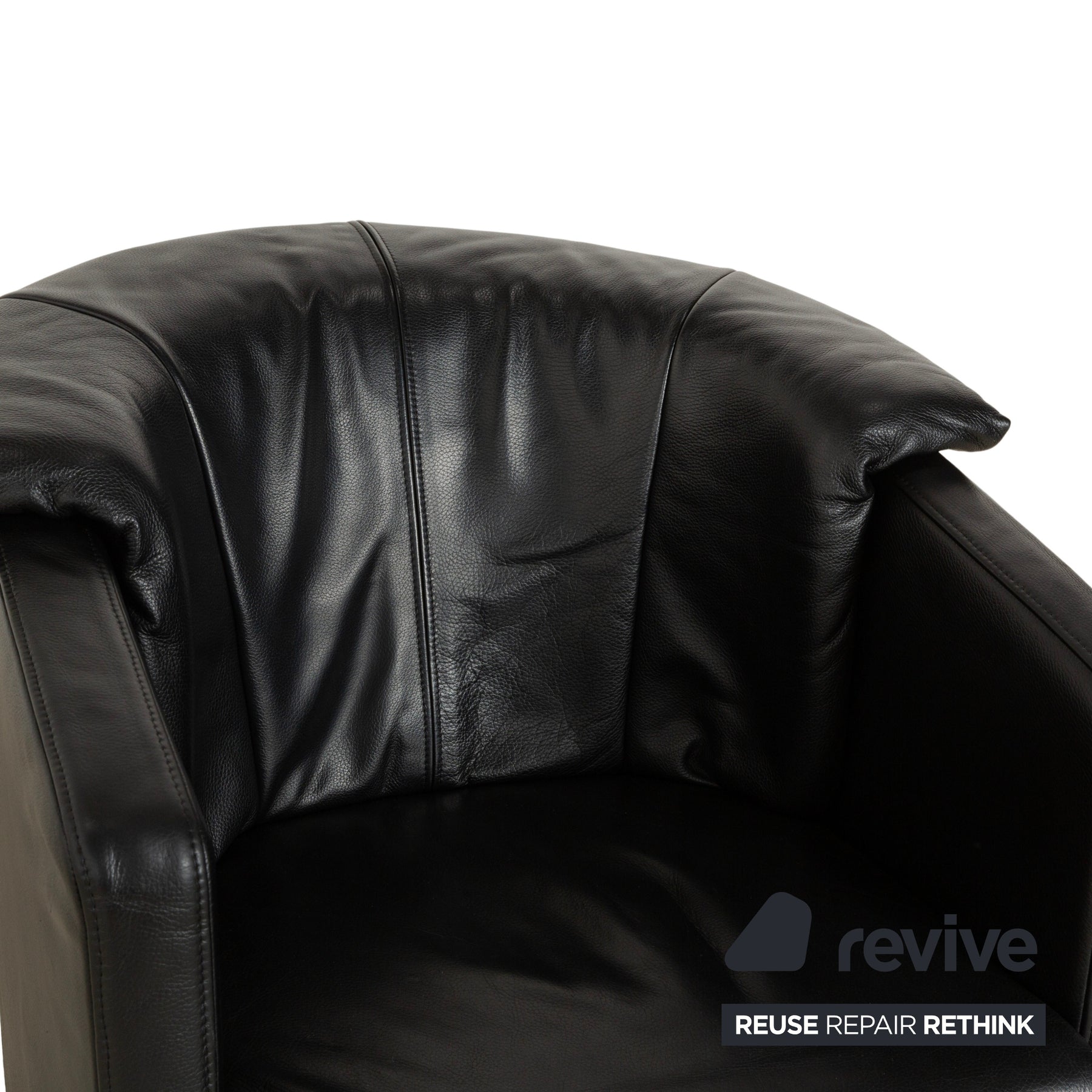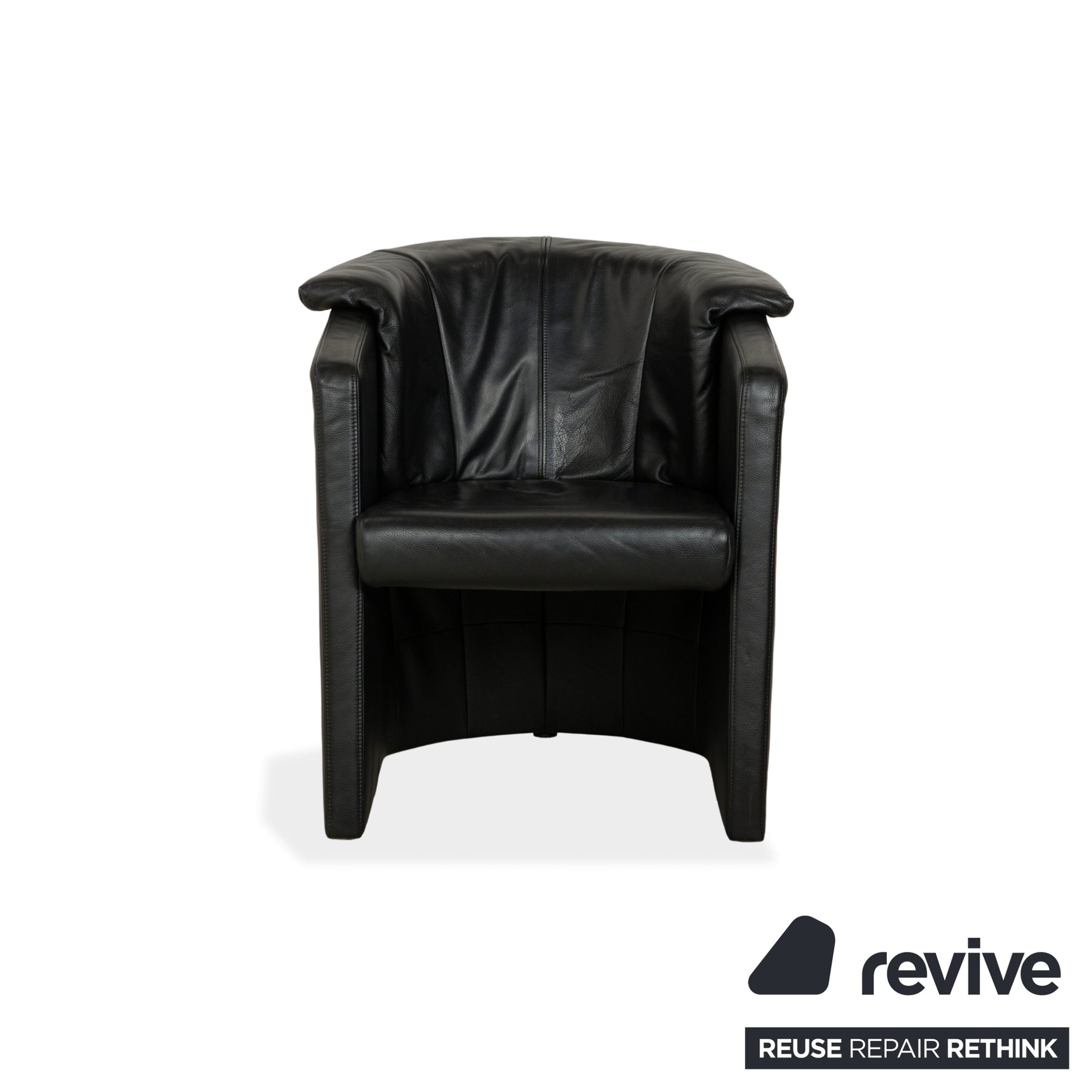 The Rolf Benz armchair is upholstered in black leather and stands on floor-to-ceiling sides and small, rounded feet. It is characterized by its classic, minimally curved design. Its practical armrests and timeless design set it apart.