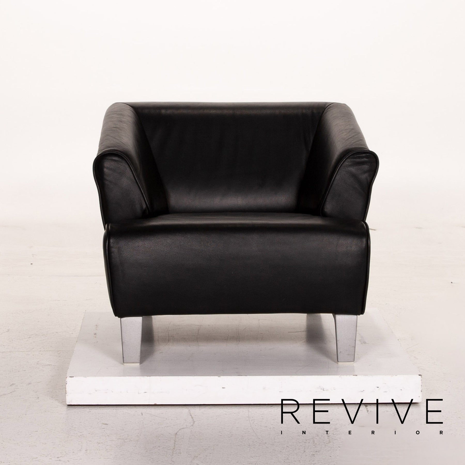 The set by Rolf Benz is covered with black genuine leather and stands on high metal feet. The armrests sloping forward and the cubic design characterize the models. The set consists of a three-seater, a two-seater and an armchair.