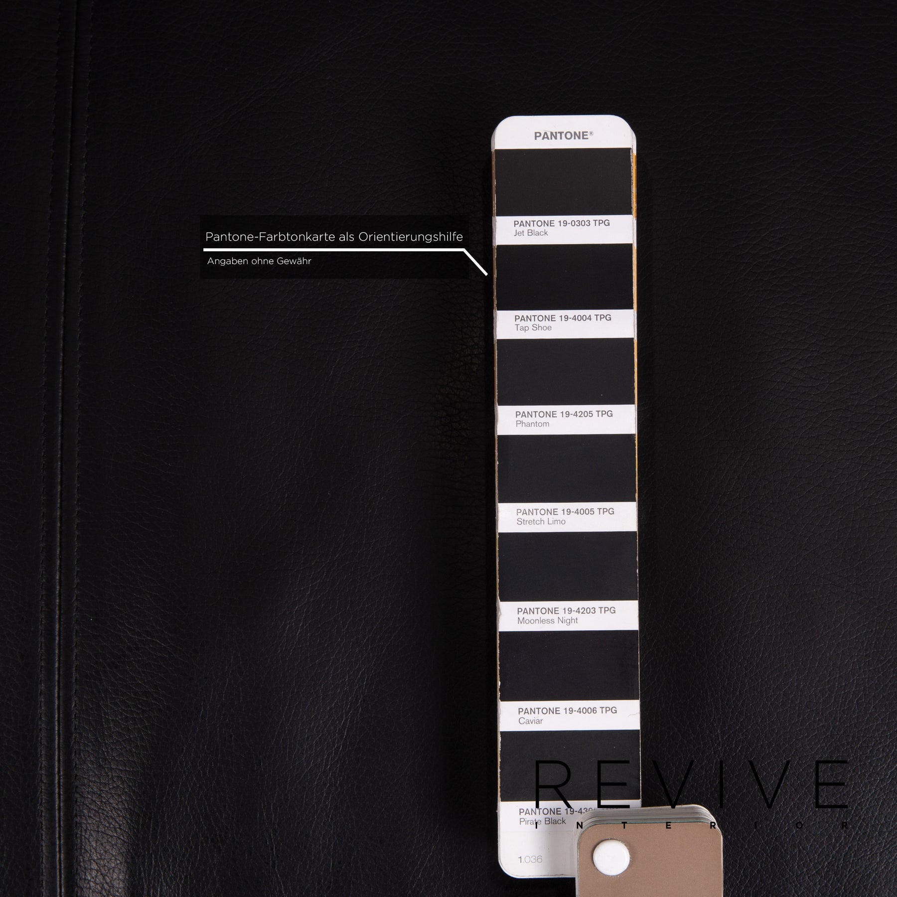 The three-seater from Rolf Benz is upholstered in black genuine leather and is characterized by its round armrests and slanted feet.