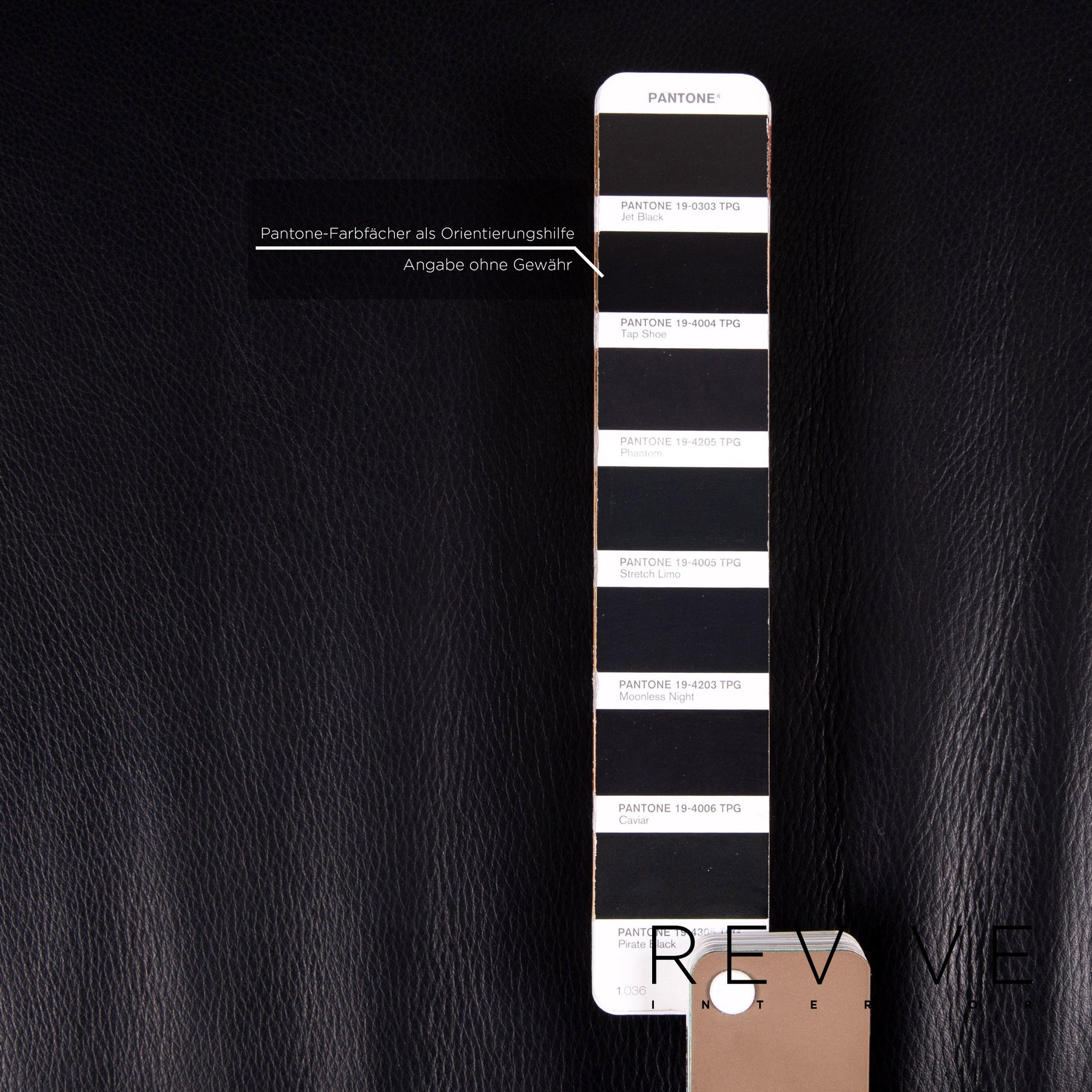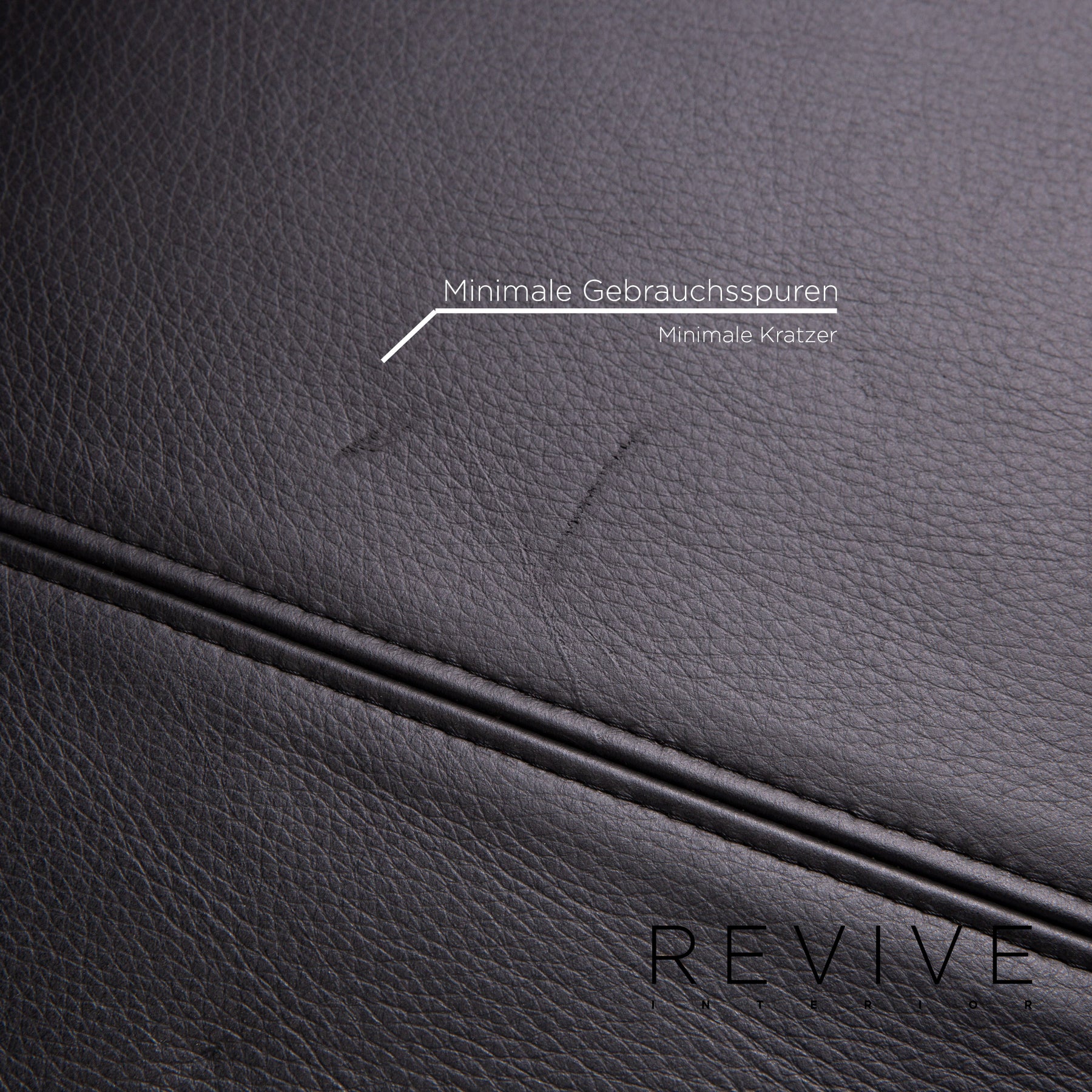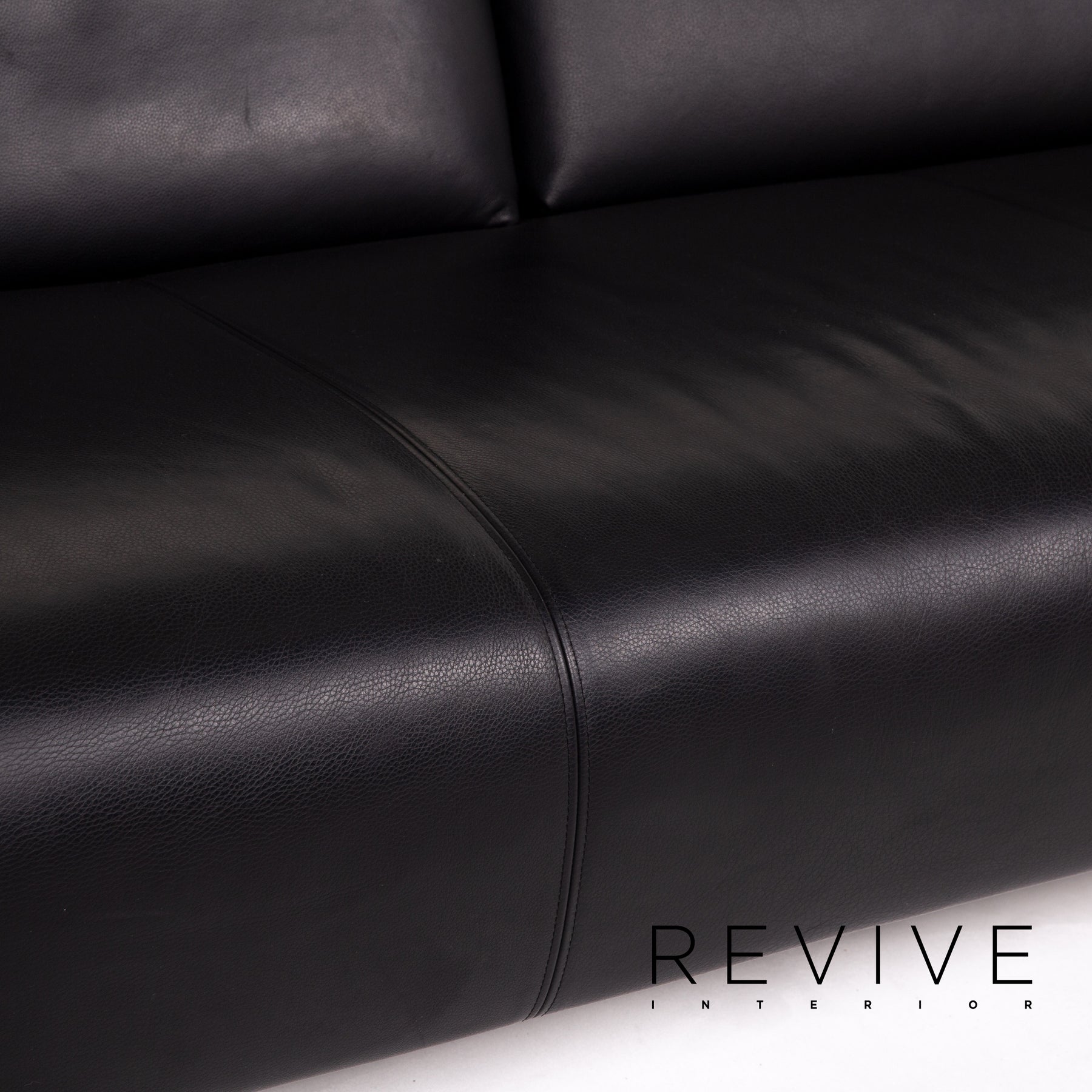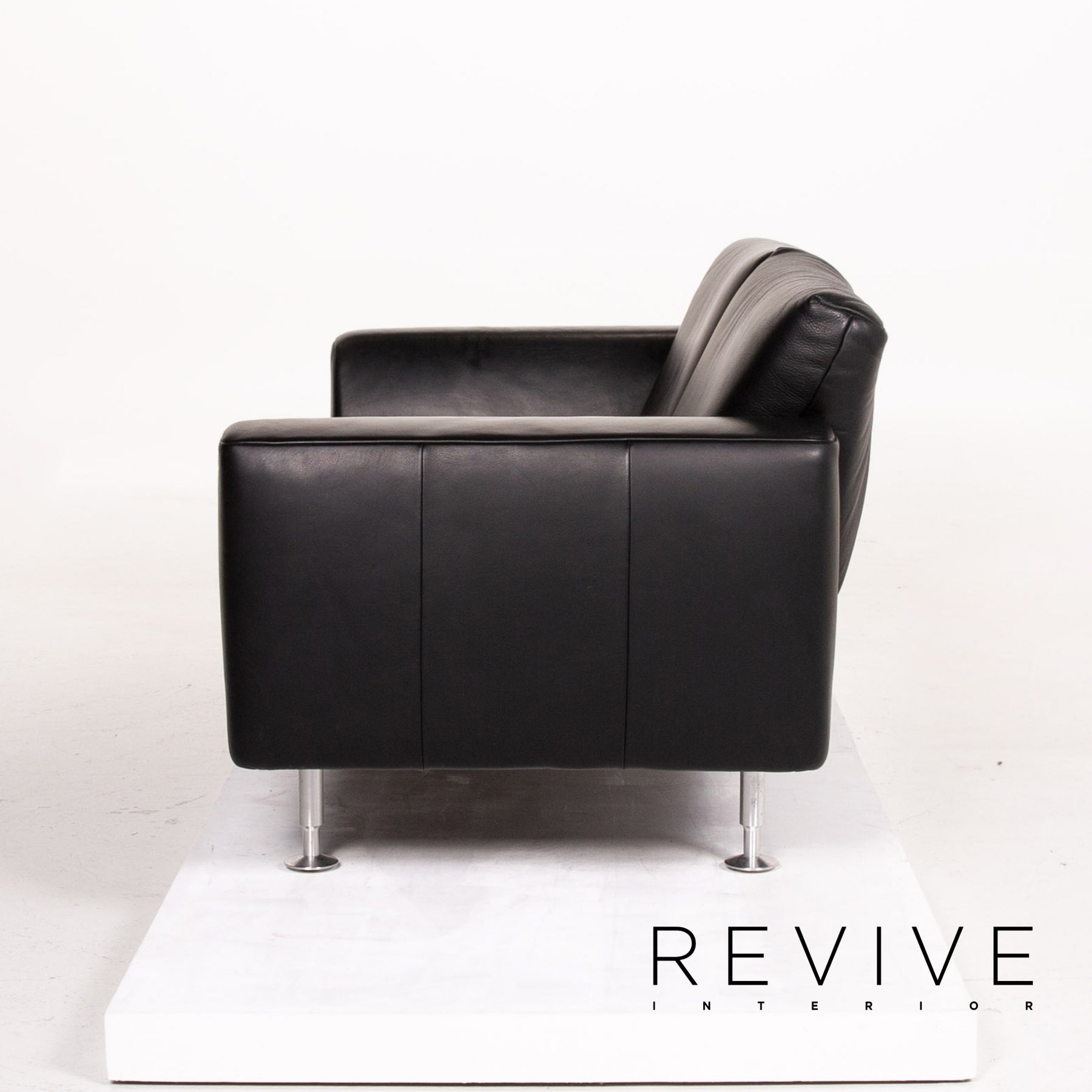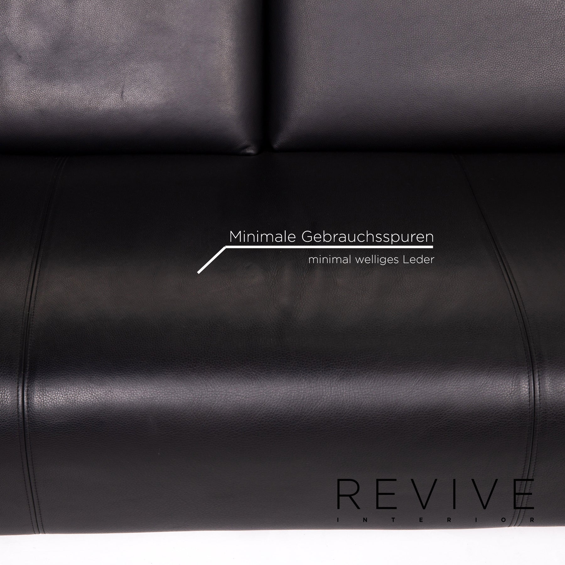 The two-seater from Rolf Benz is upholstered in black genuine leather and stands on tall, slender metal feet. A simple design and trapezoidal back cushions characterize the sofa.