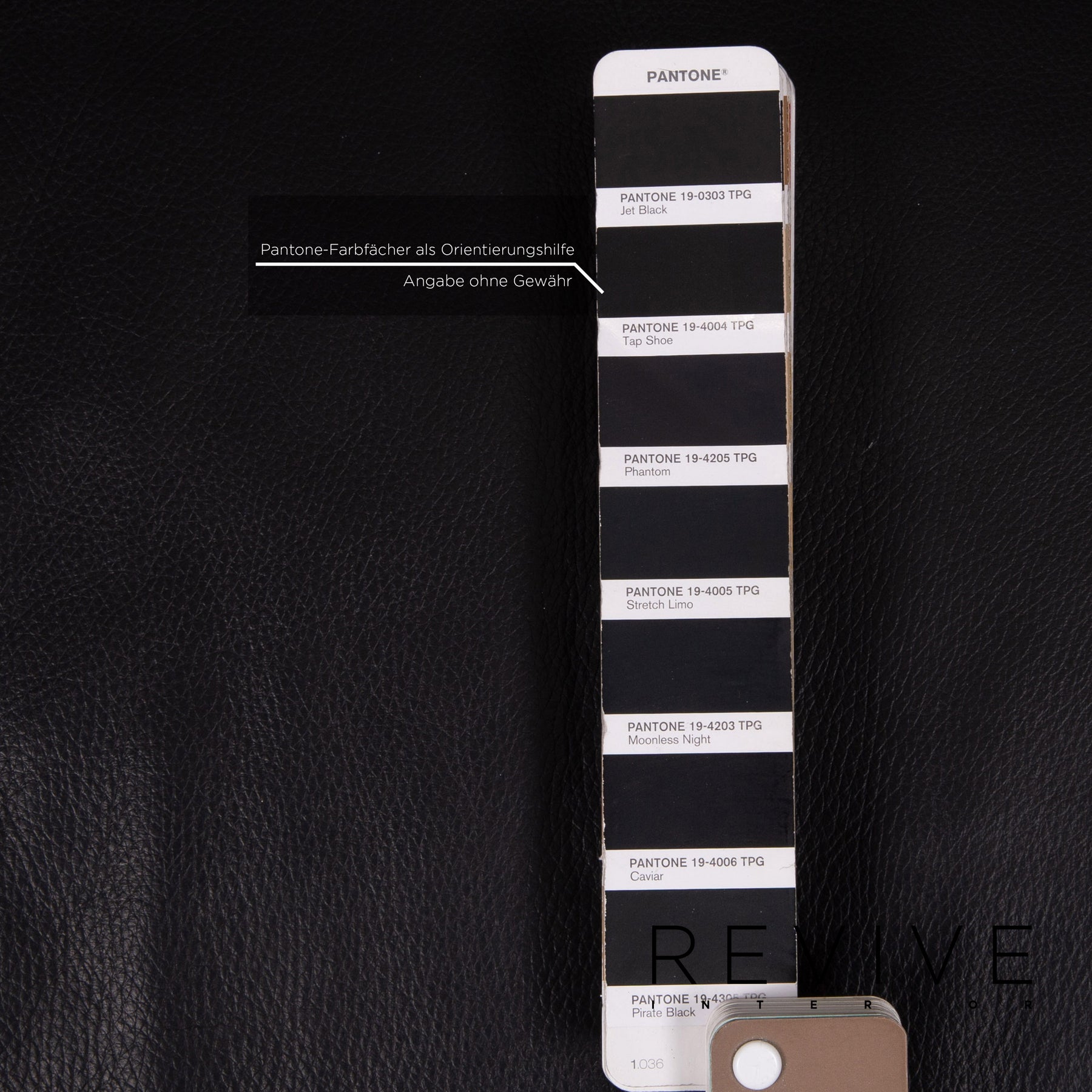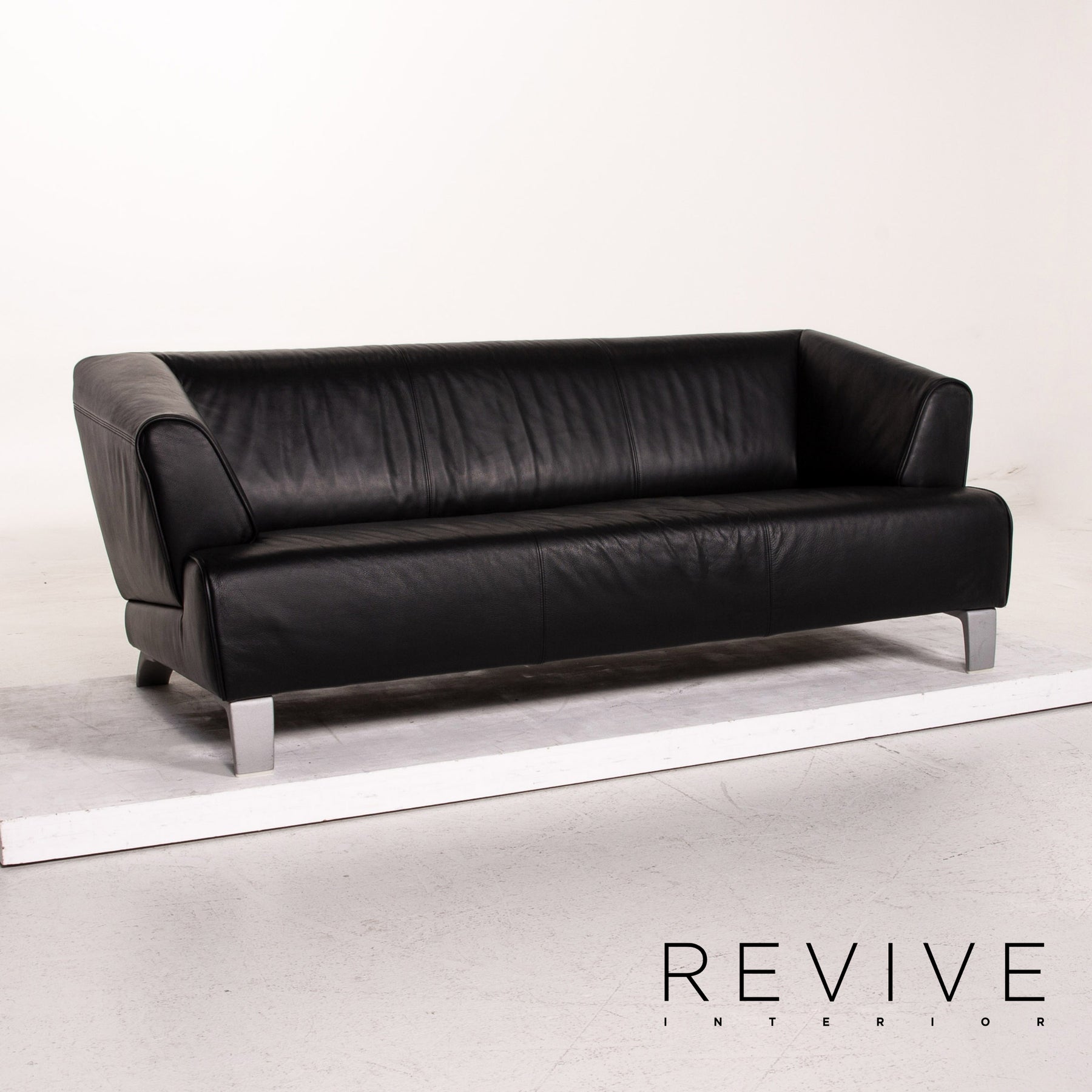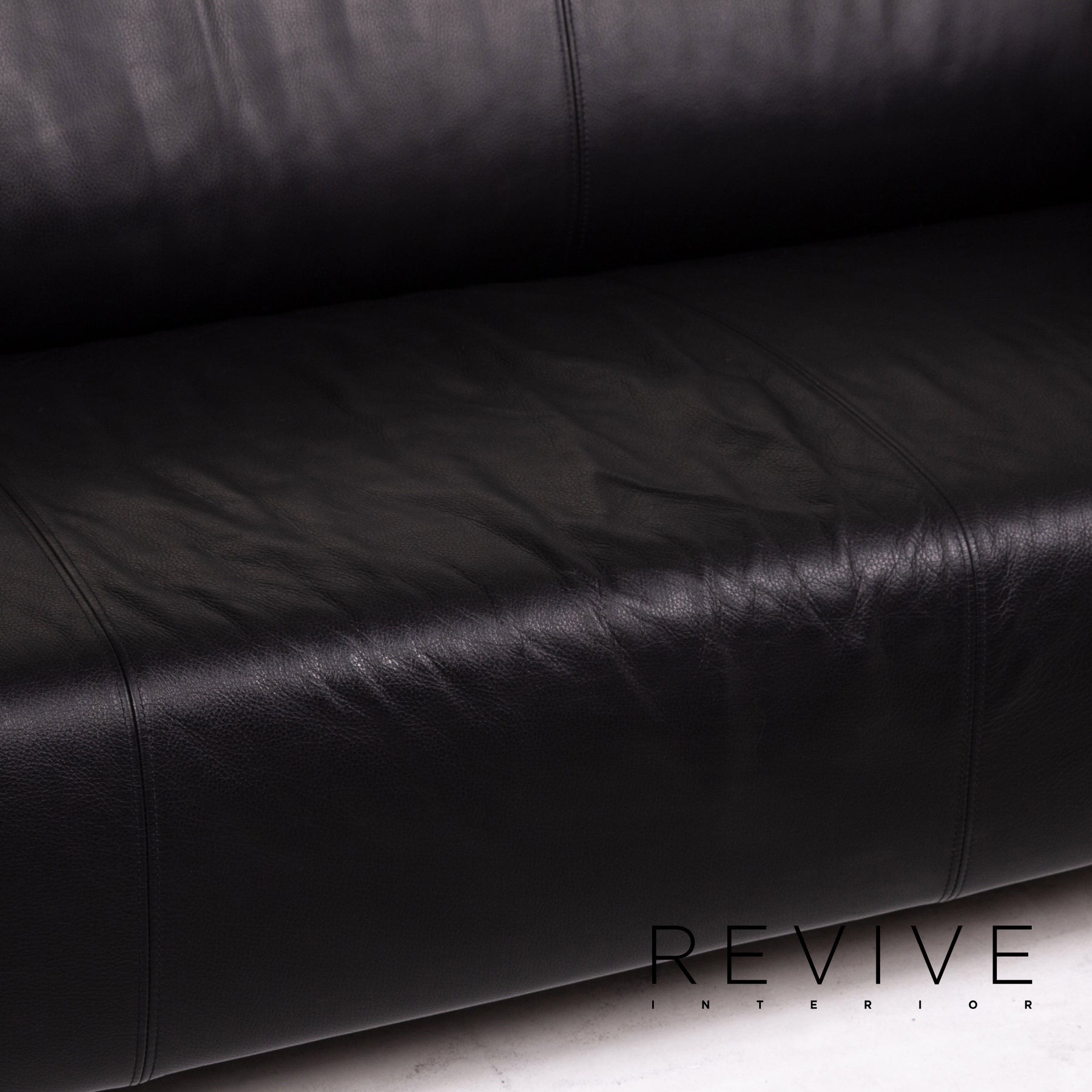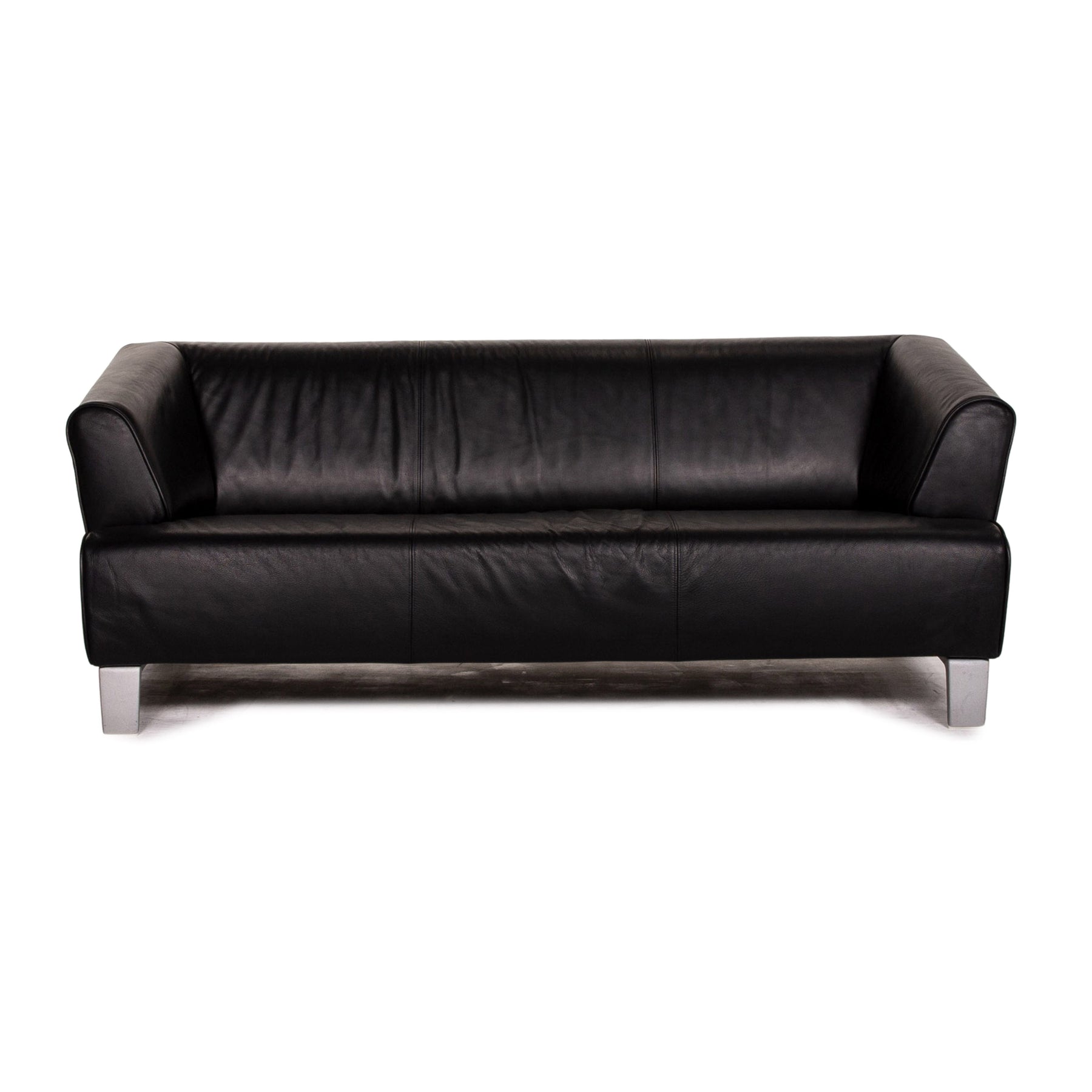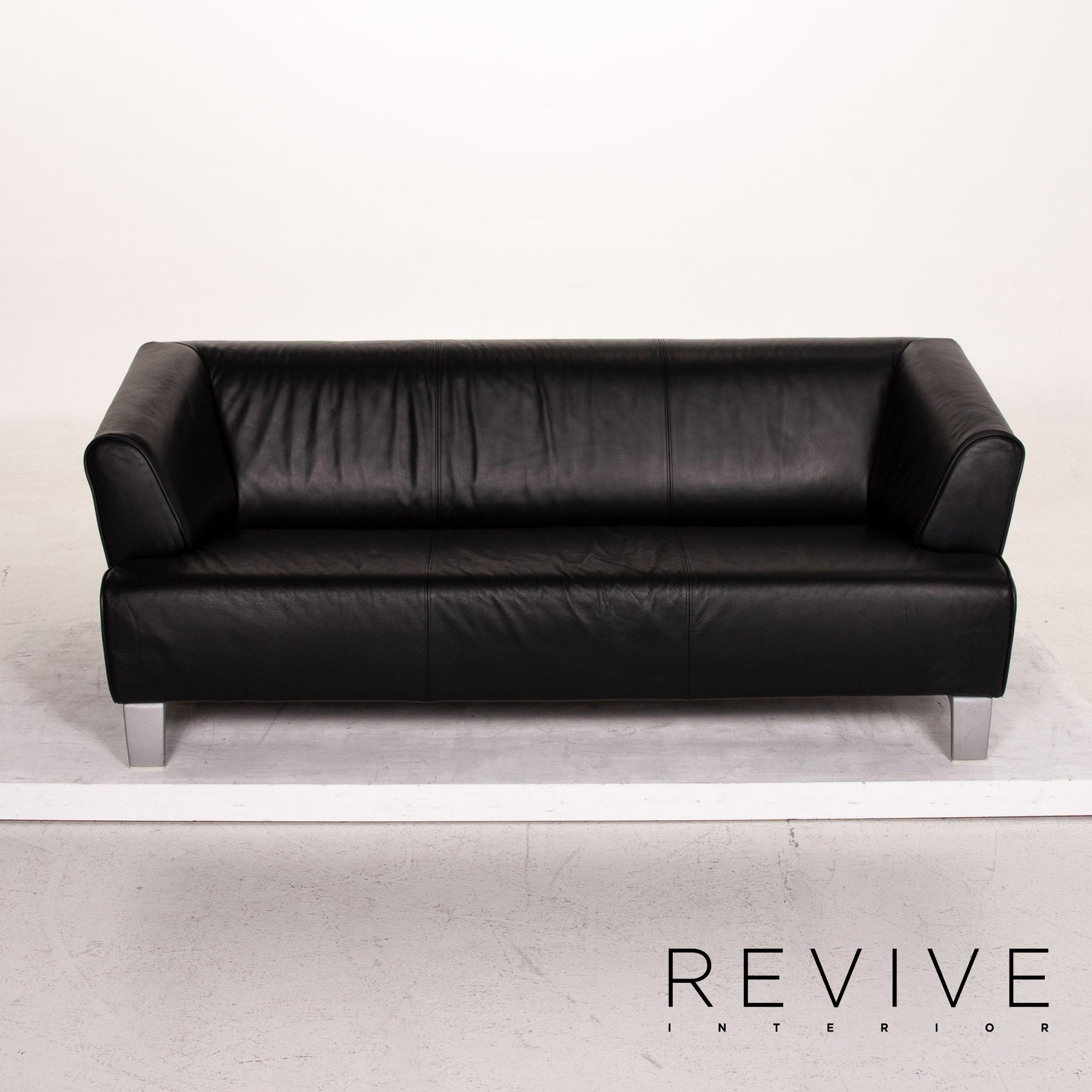 The two-seater from Rolf Benz is upholstered in black genuine leather and stands on high metal feet. The armrests sloping forward and the cubic design characterize the sofa.