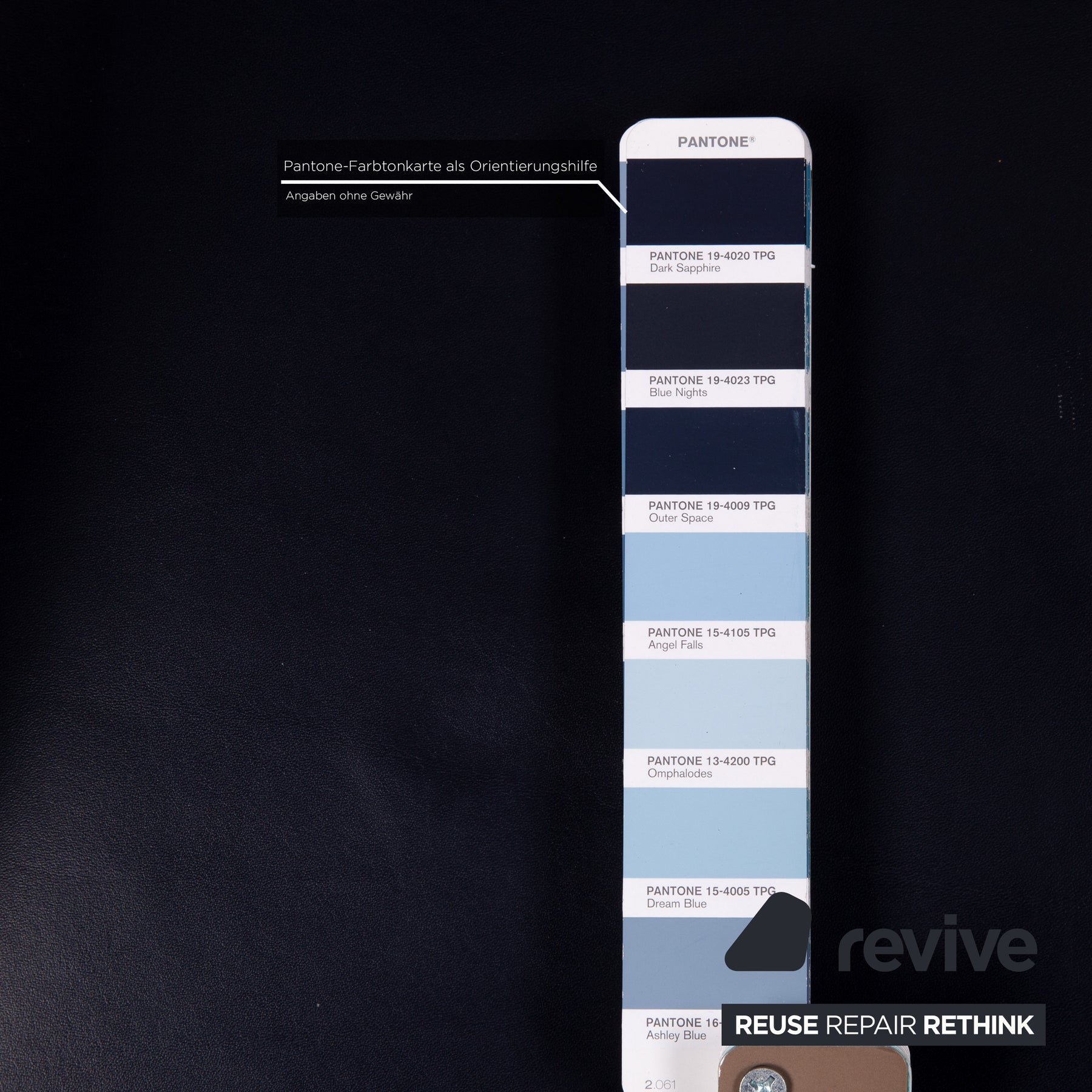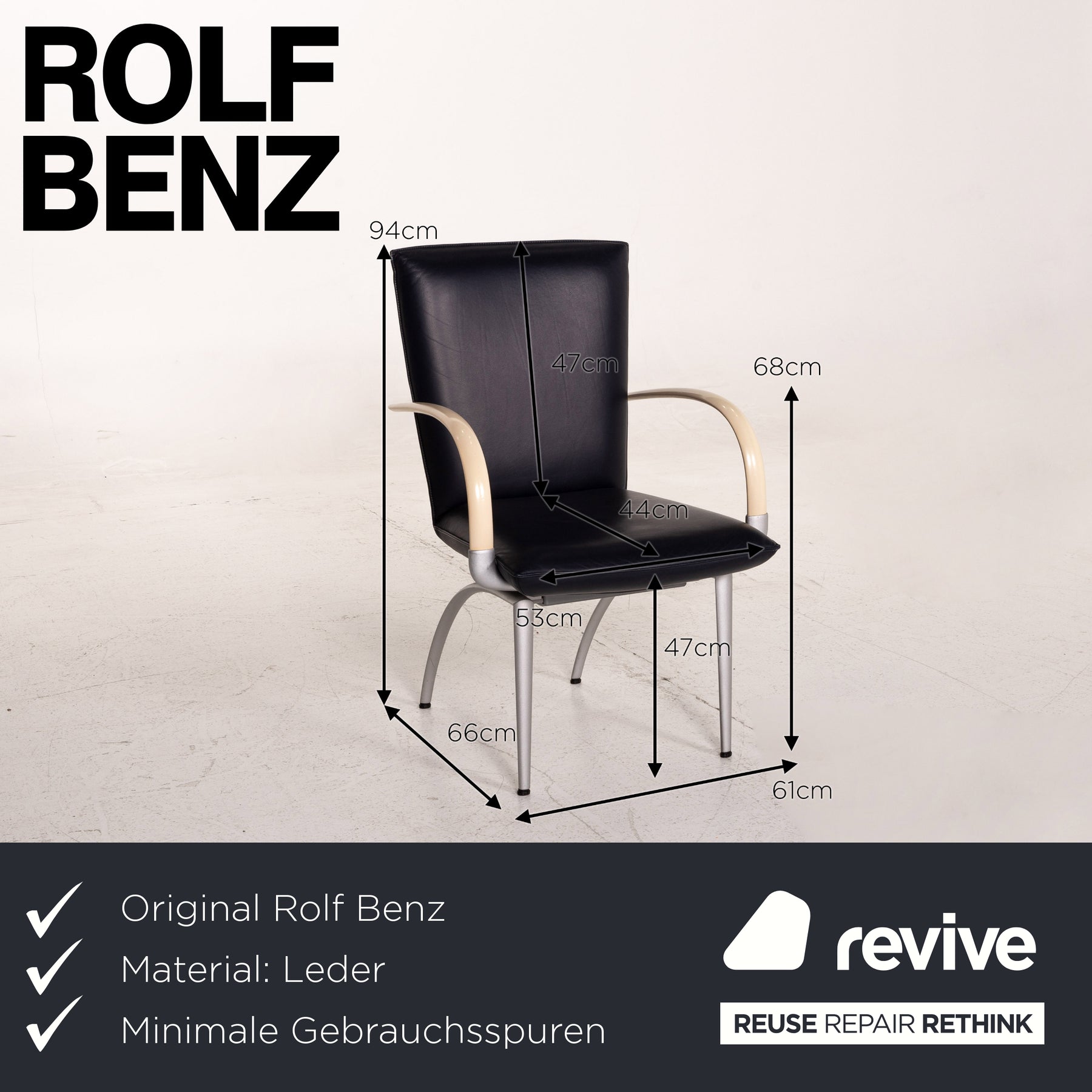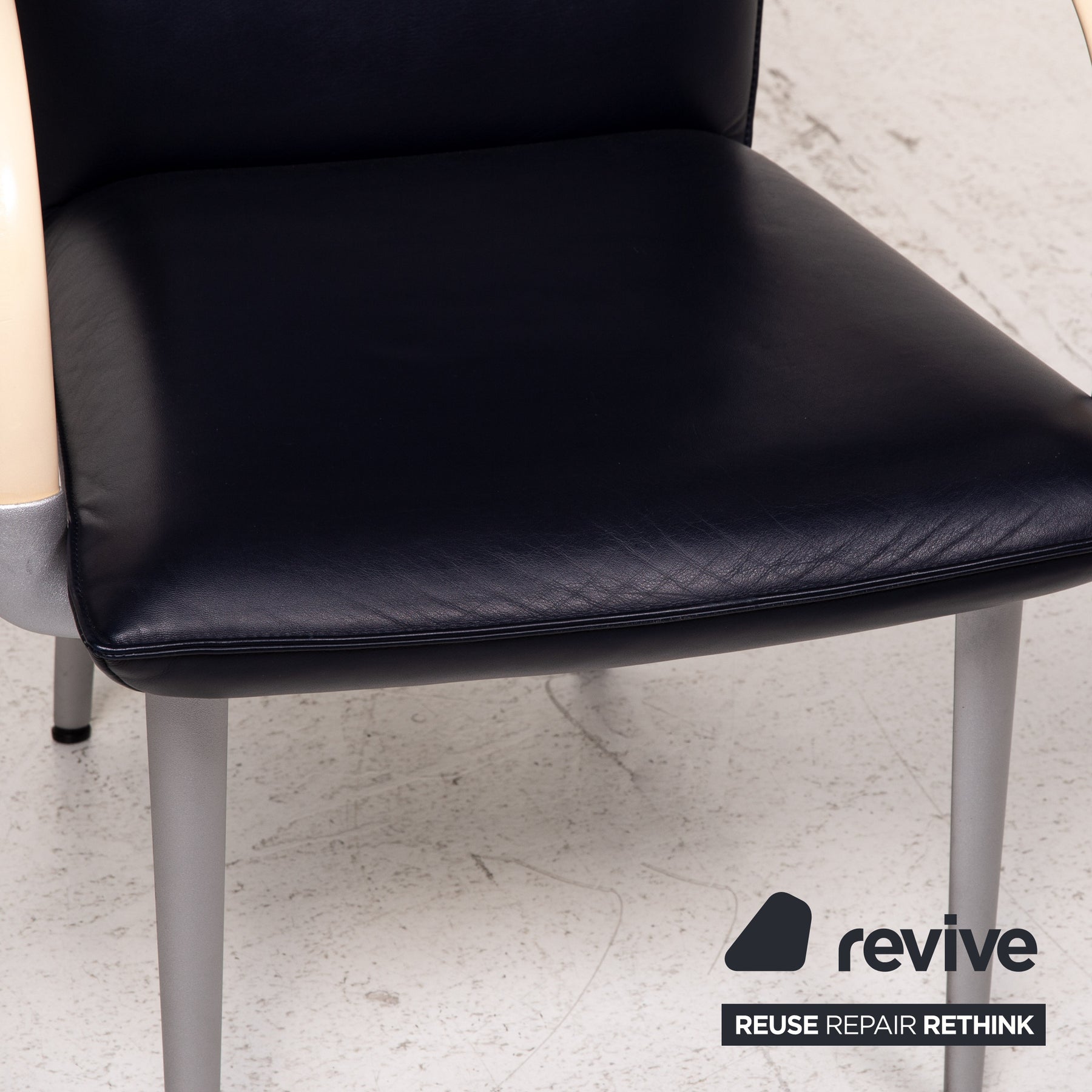 The dining room chair by Rolf Benz is upholstered in blue genuine leather and stands on dynamically shaped, silver-colored chair legs. The armrests are made of cream-colored plastic.