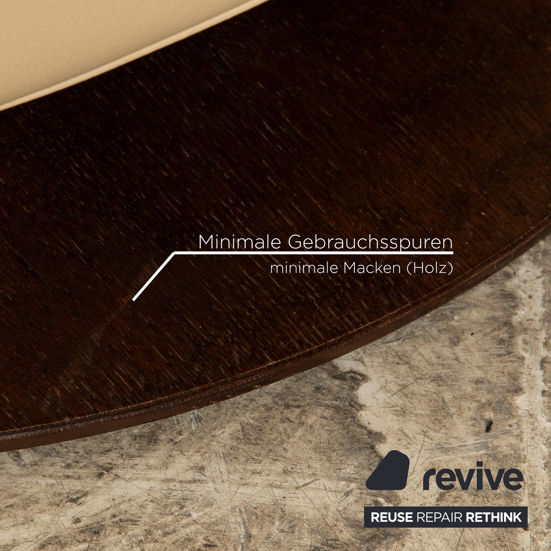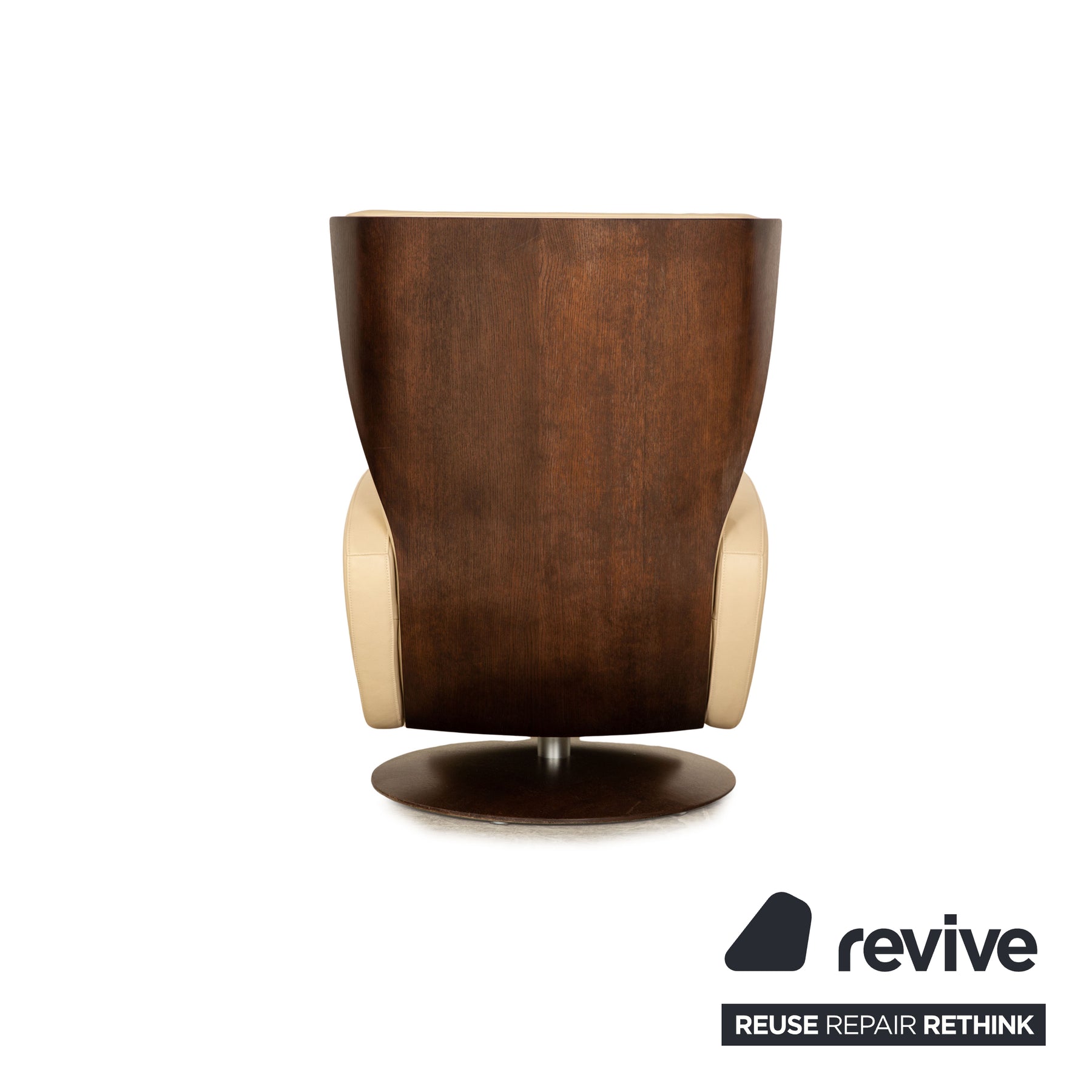 The LSE 5800 armchair by Rolf Benz is covered in cream-colored genuine leather and stands on a brown wooden base. It is characterized by the comfortable relaxation function and the simple, classic design.
