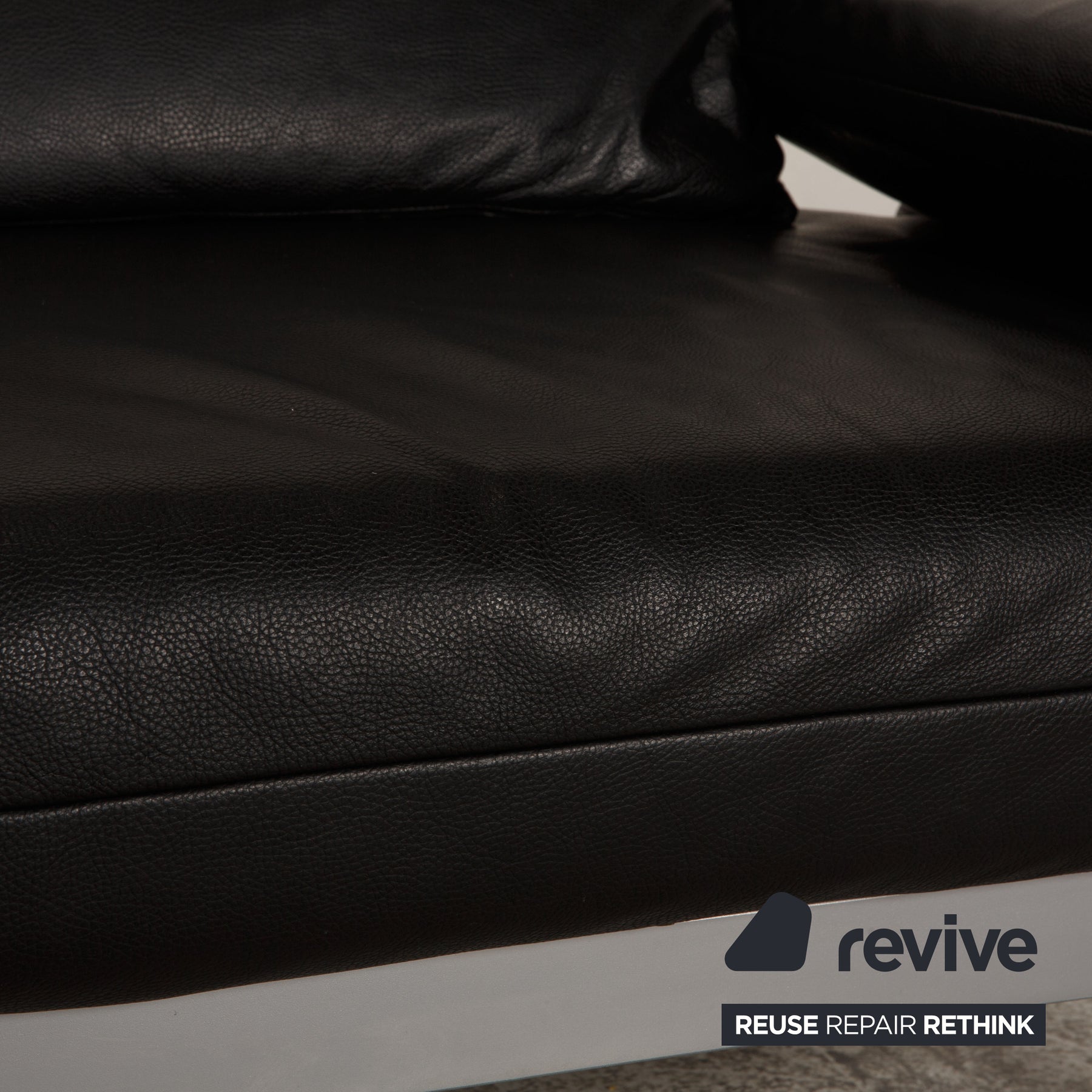 The Plura sofa by Rolf Benz is upholstered in black genuine leather and stands on elegant silver metal feet. The curved armrests and the comfortable, practical relax function characterize the two-seater,