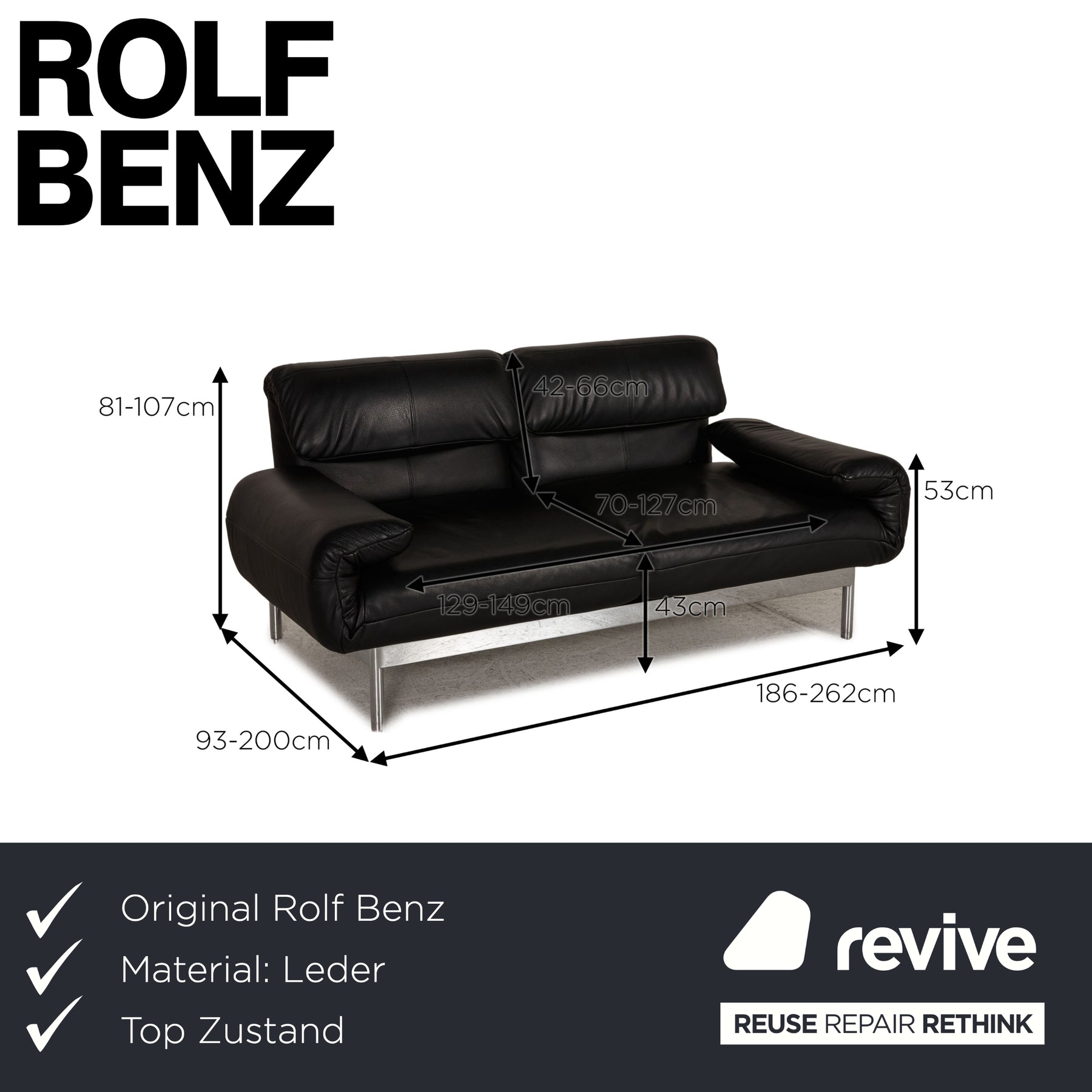 Rolf Benz Plura leather sofa black two-seater couch function relaxation function