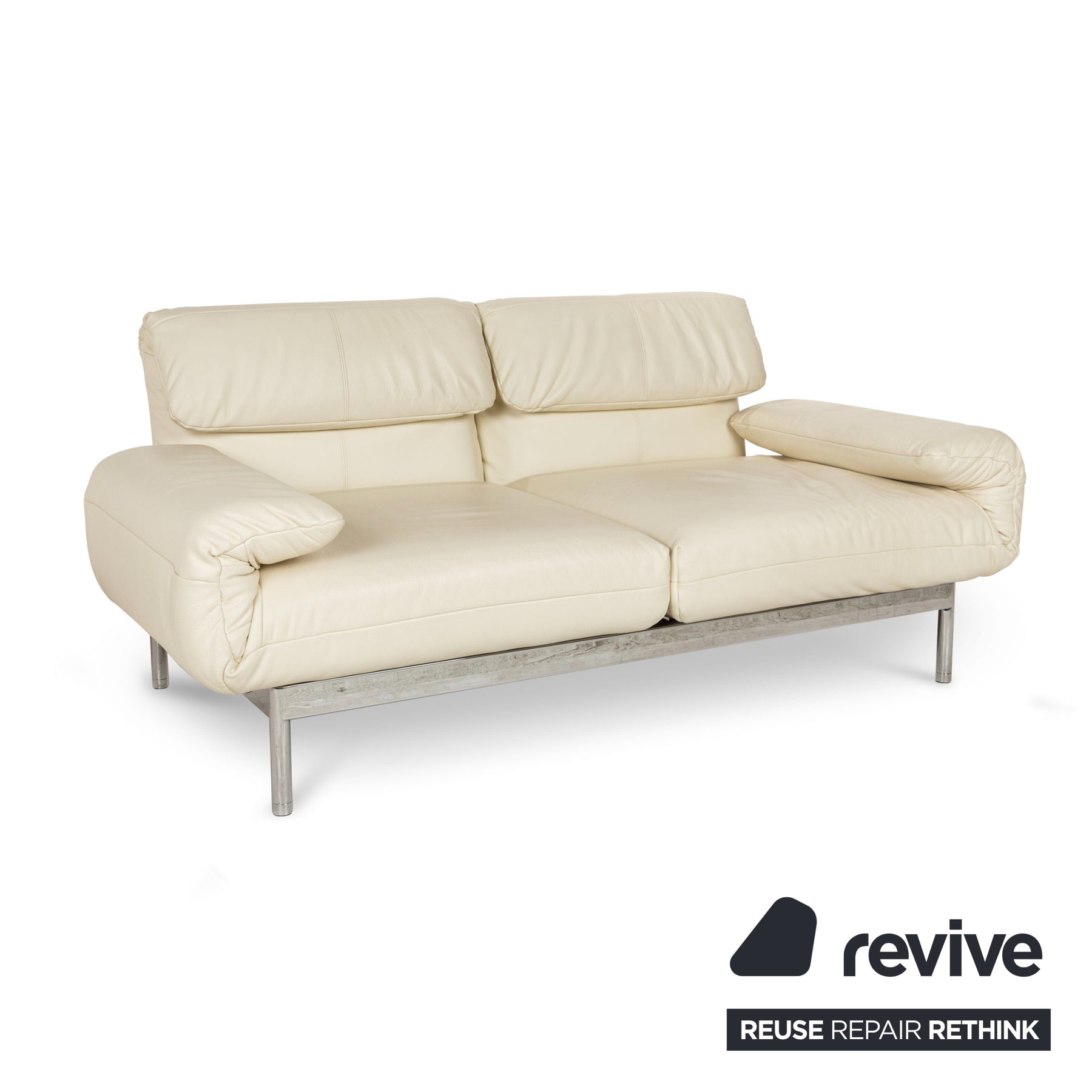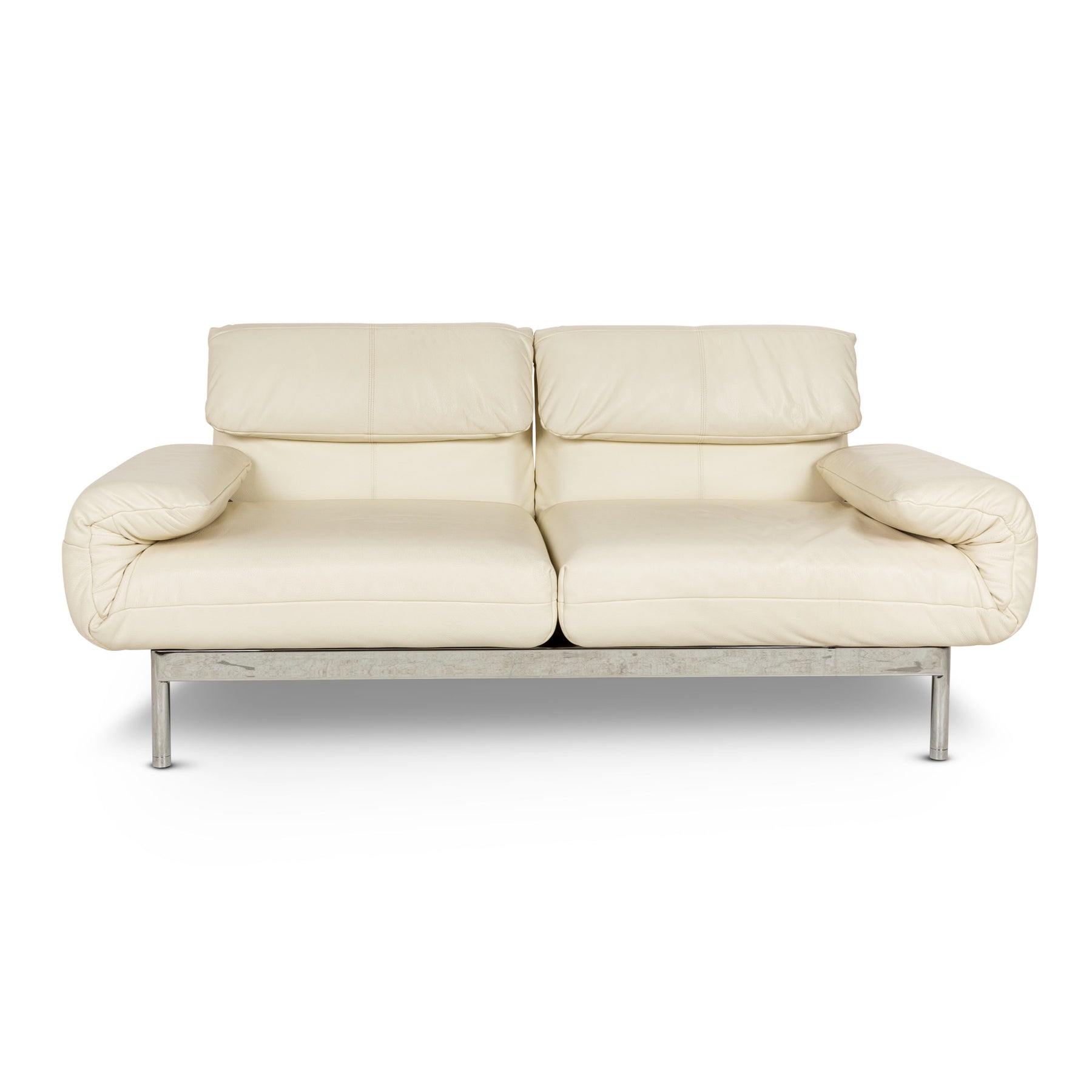 The two-seater Plura from Rolf Benz is covered in cream-colored leather and stands on a slim metal frame. Sitting or relaxing - the multifunctional sofa can be adjusted to any position in just a few easy steps. It can even be set to a reclining position. The soft shape of the upholstery design and the straight metal frame make the sofa a timeless, modern piece of seating.