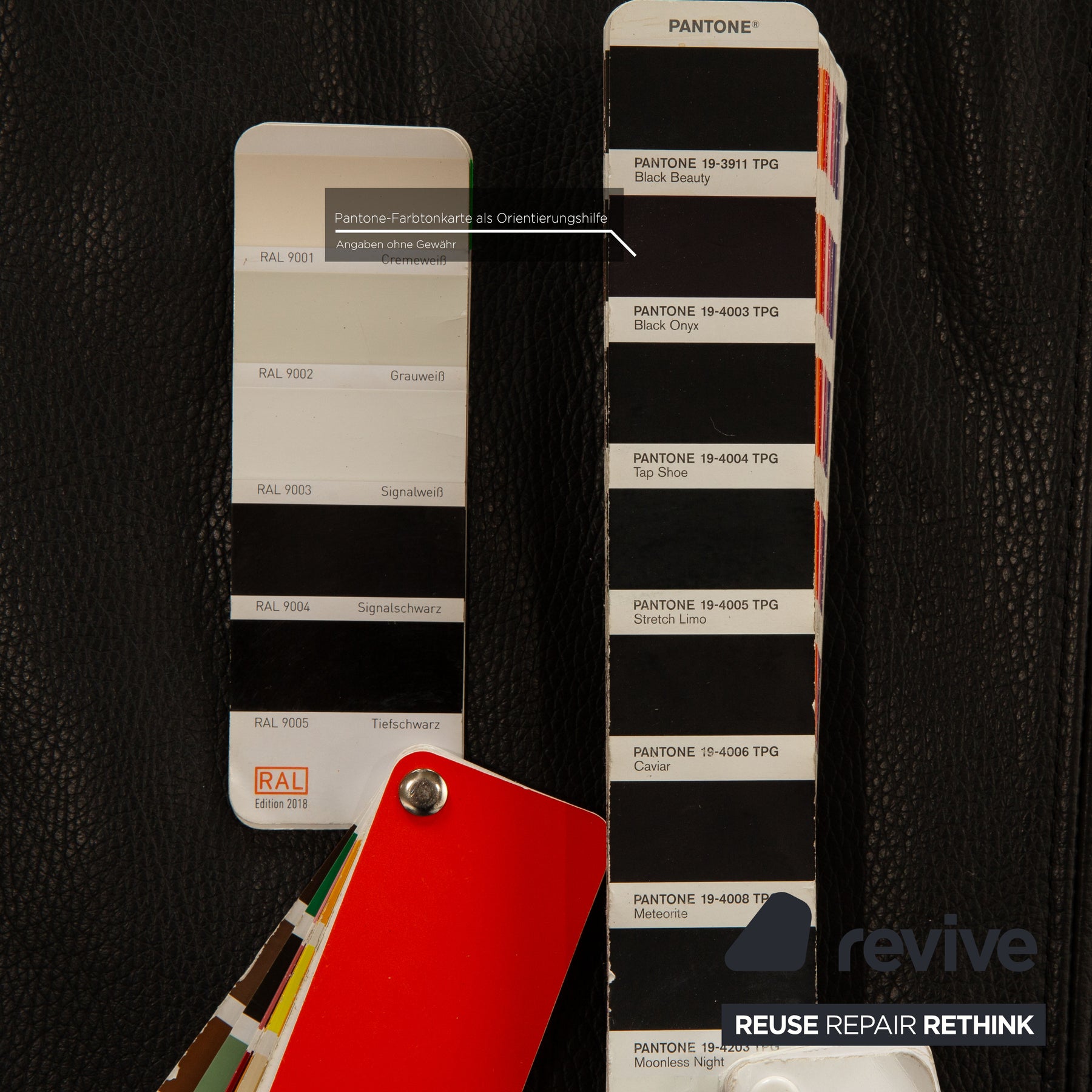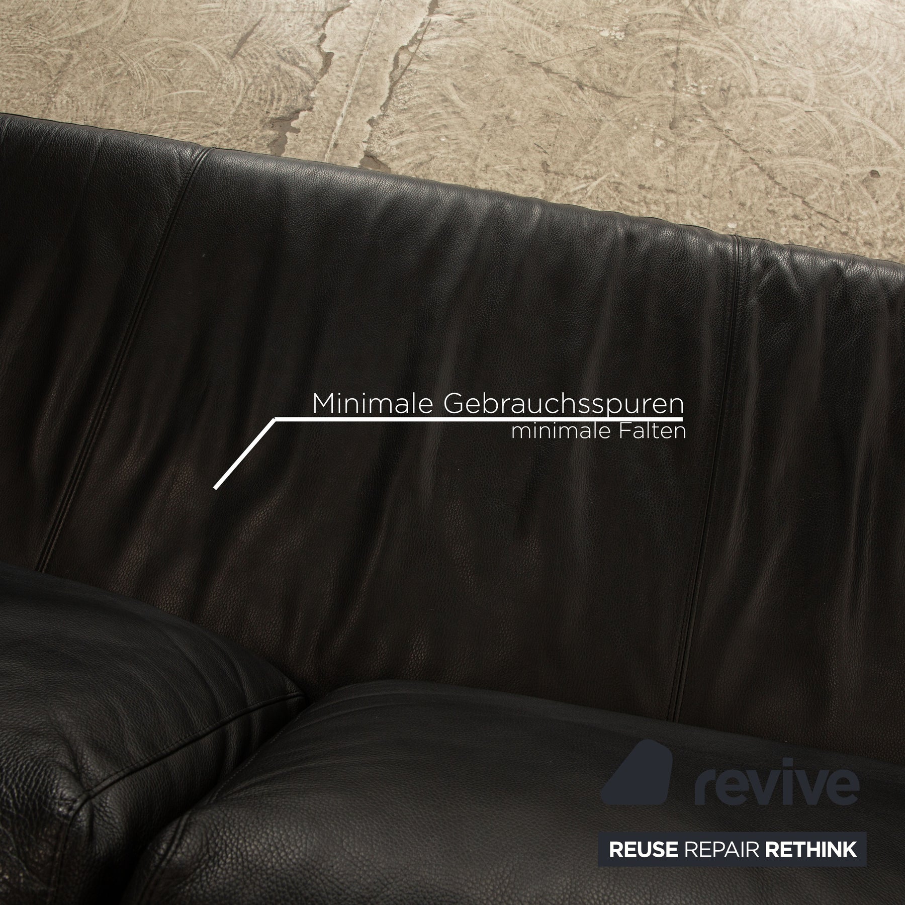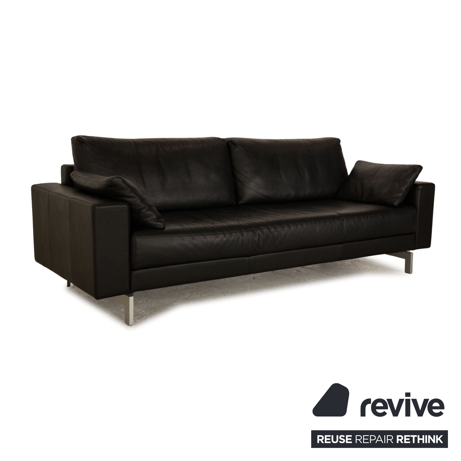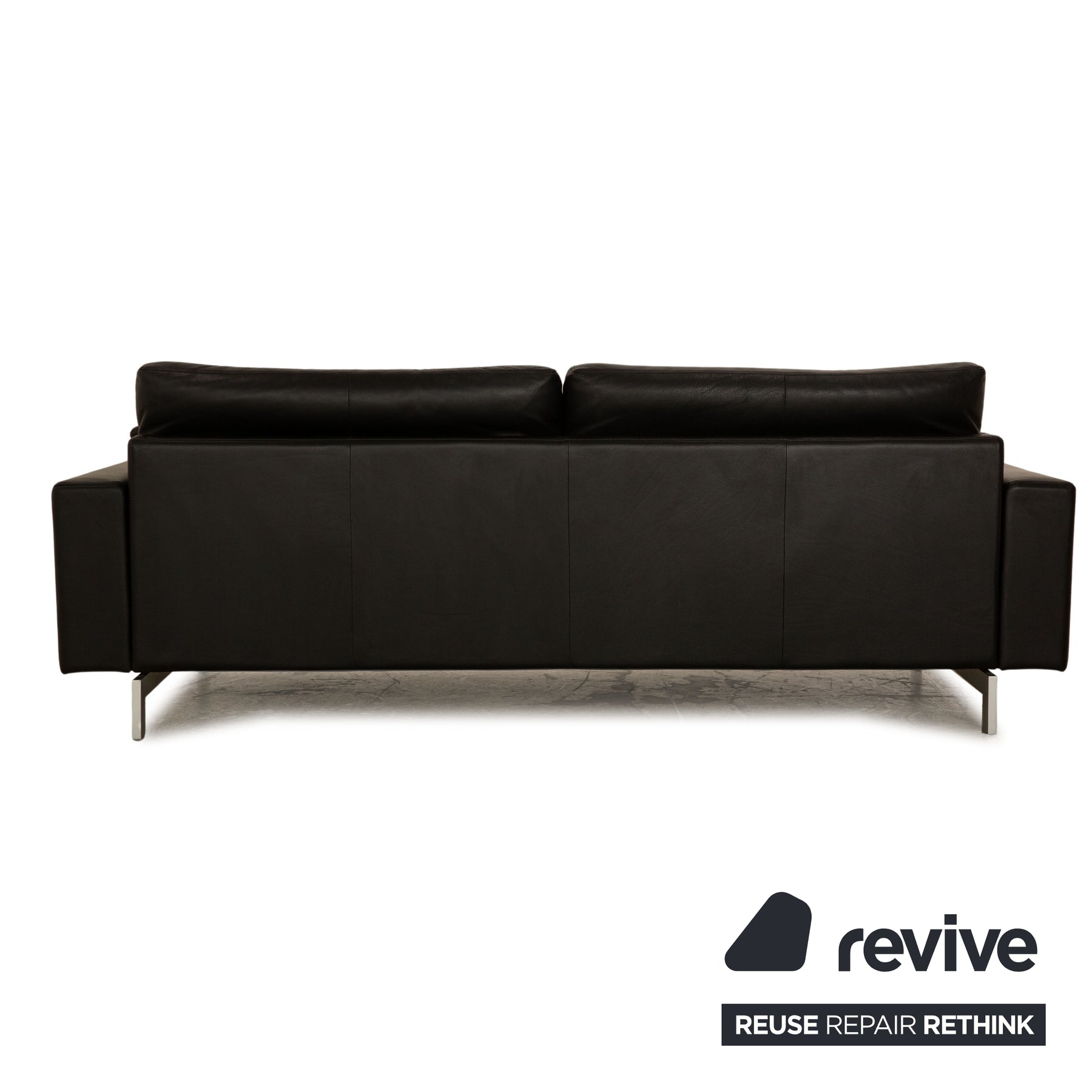 The three-seater Vida by Rolf Benz is covered in black genuine leather and stands on silver metal feet. It is characterized by its angular, straight-line design and timeless look.