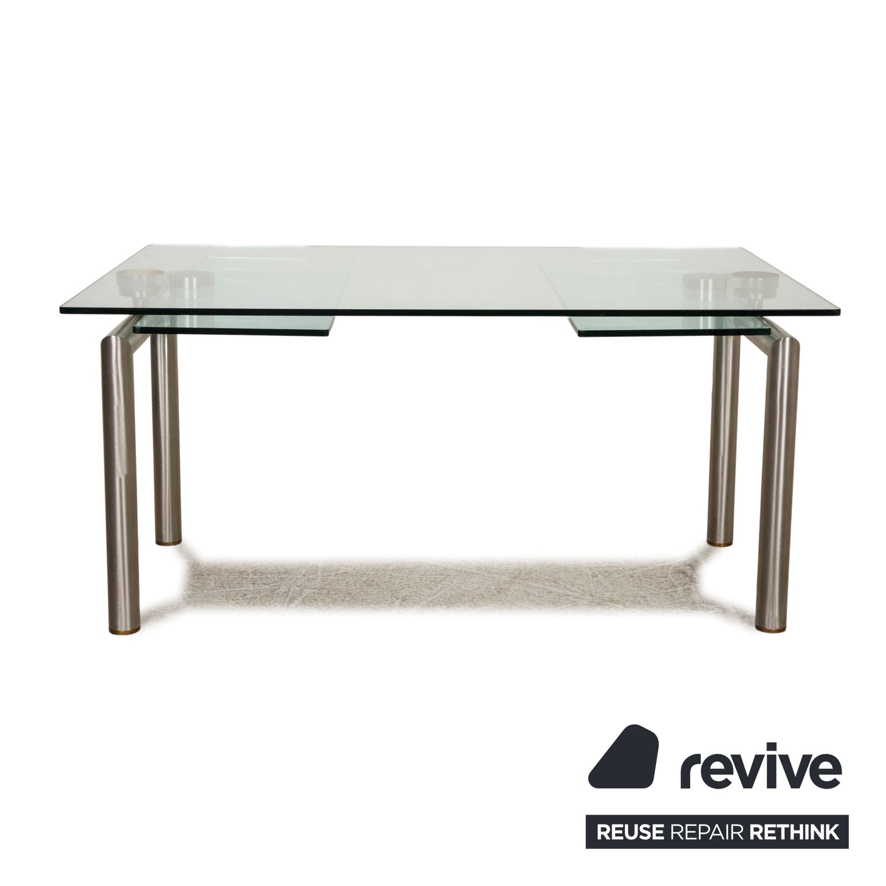 The dining table by Ronald Schmitt consists of a clear glass top and a noble, silver metal frame. The comfortable, practical extension option and the timeless design characterize the table.