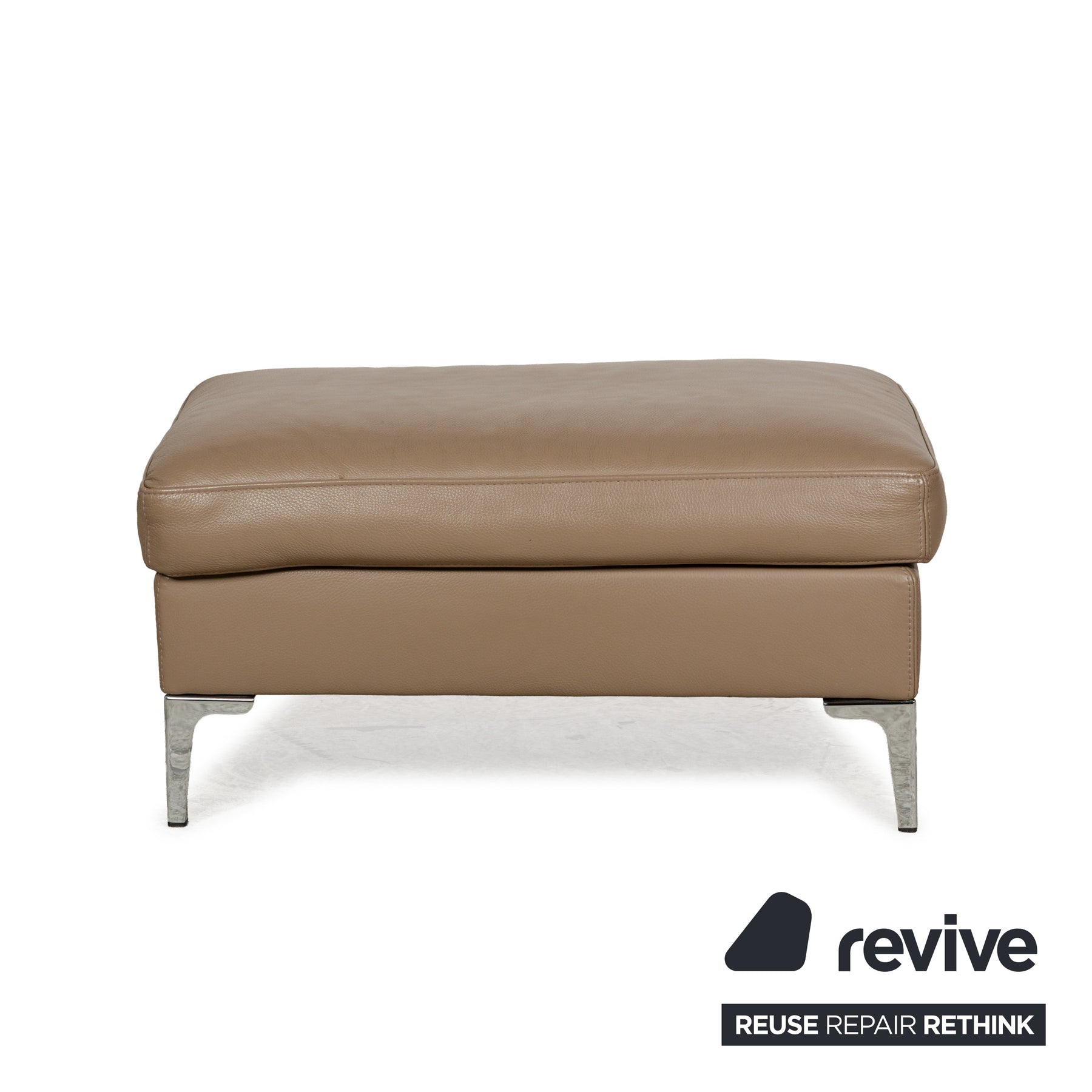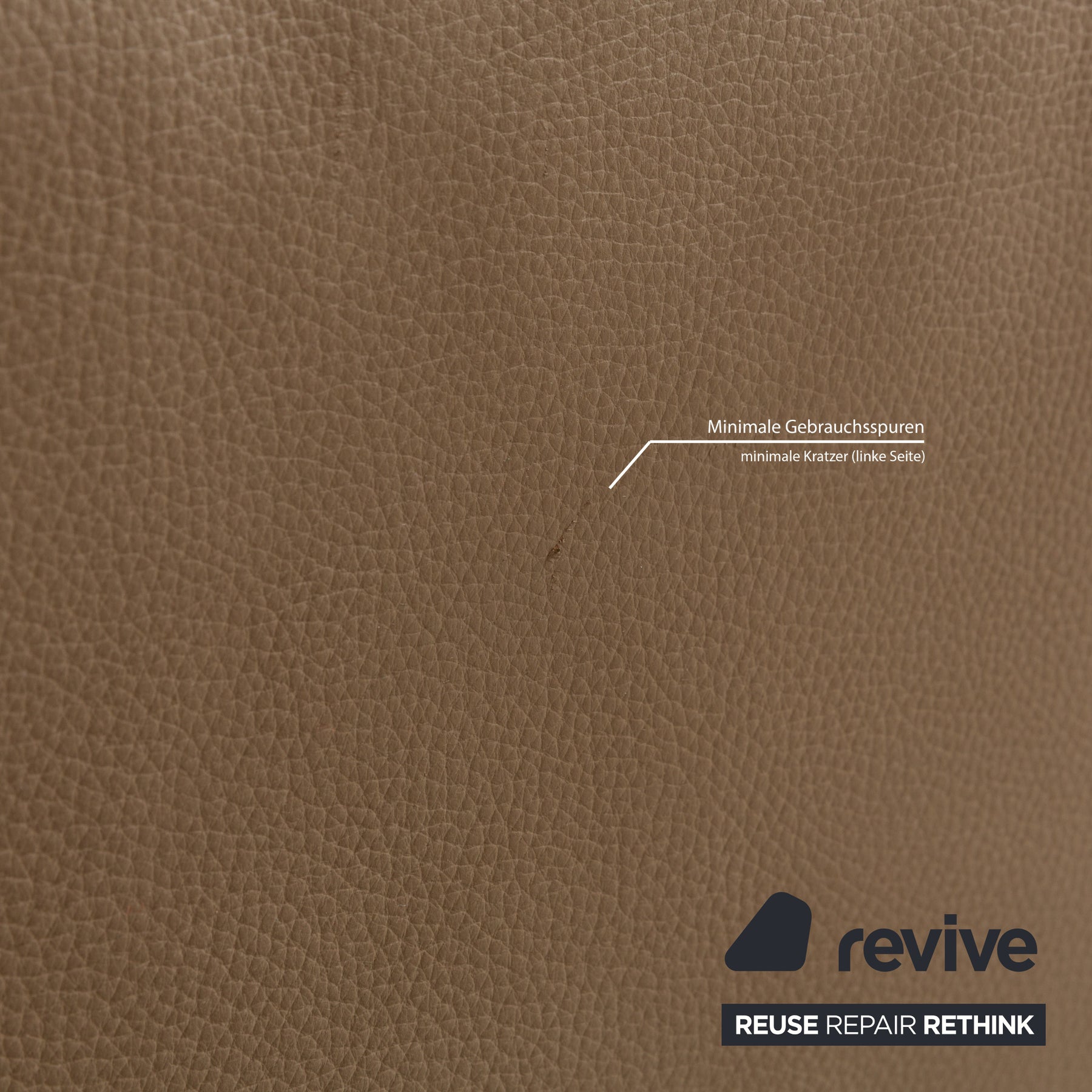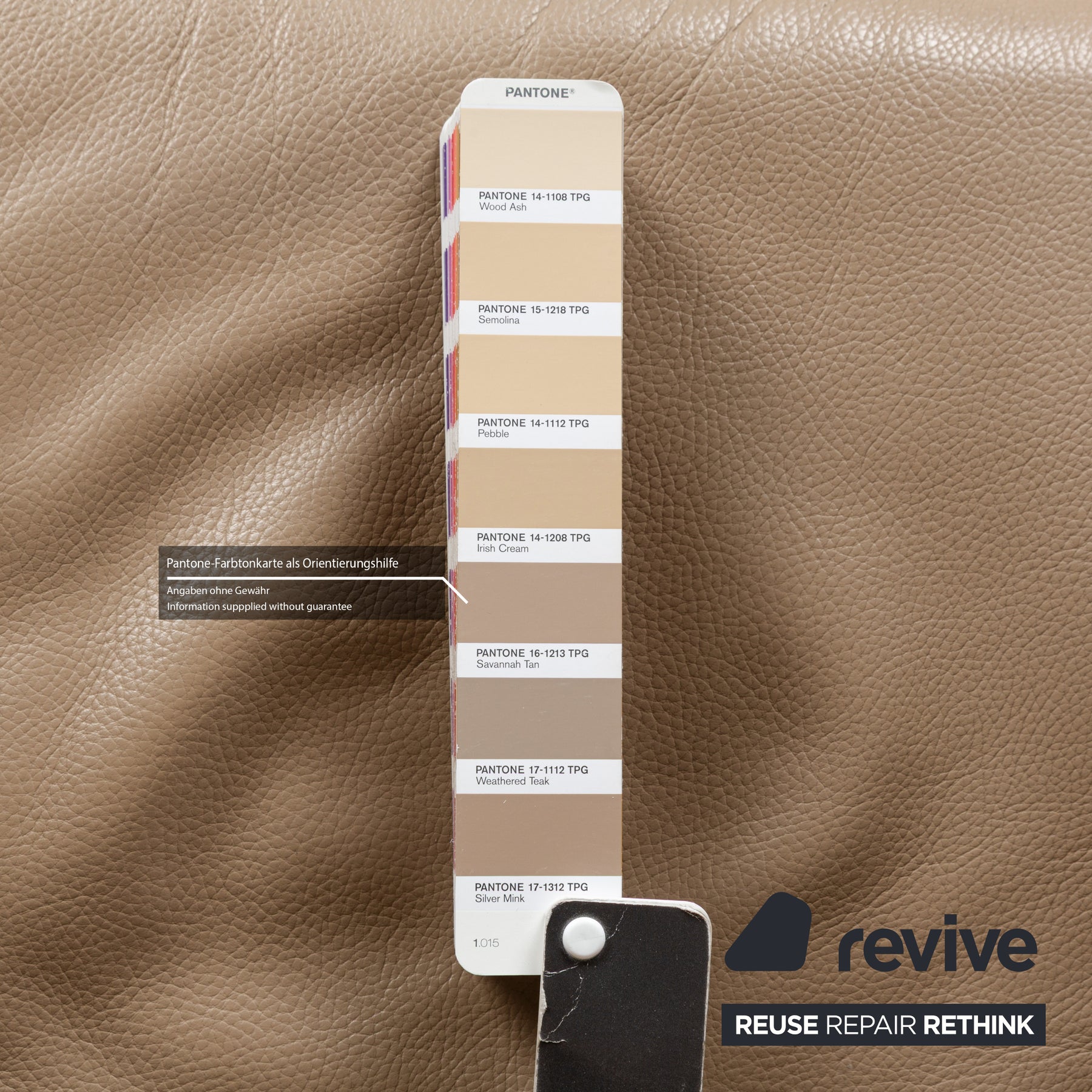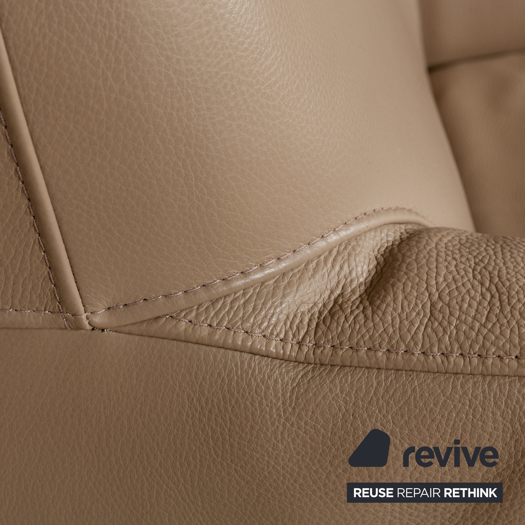 The armchair set by Saba Italia is upholstered in light brown or beige leather and stands on angled, chrome-plated feet. It is characterized by its understated yet elegant design with minimal curves and a high backrest.