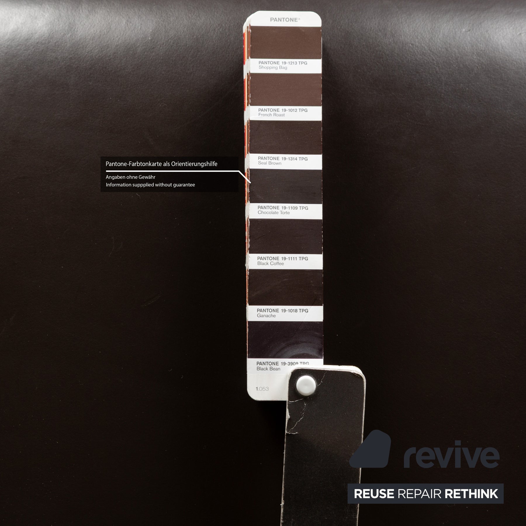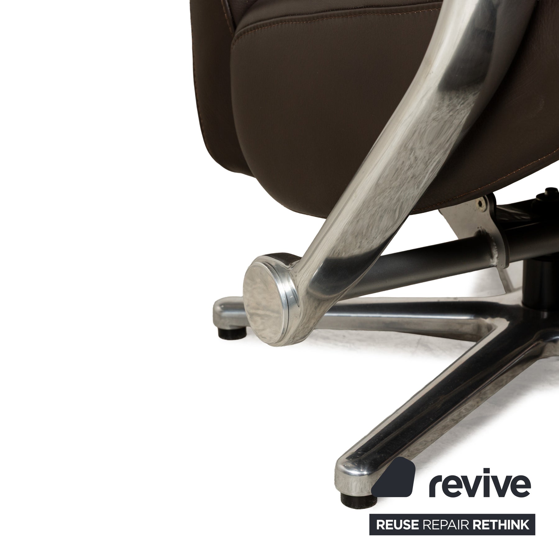 The Violetta armchair is upholstered in dark brown leather and sits on a metal frame. It impresses with simple elegance and high comfort – a comfortable reclining position can be achieved with a single movement of the hand. The curved armrests provide a pleasing contrast to the otherwise linear design of the armchair.
