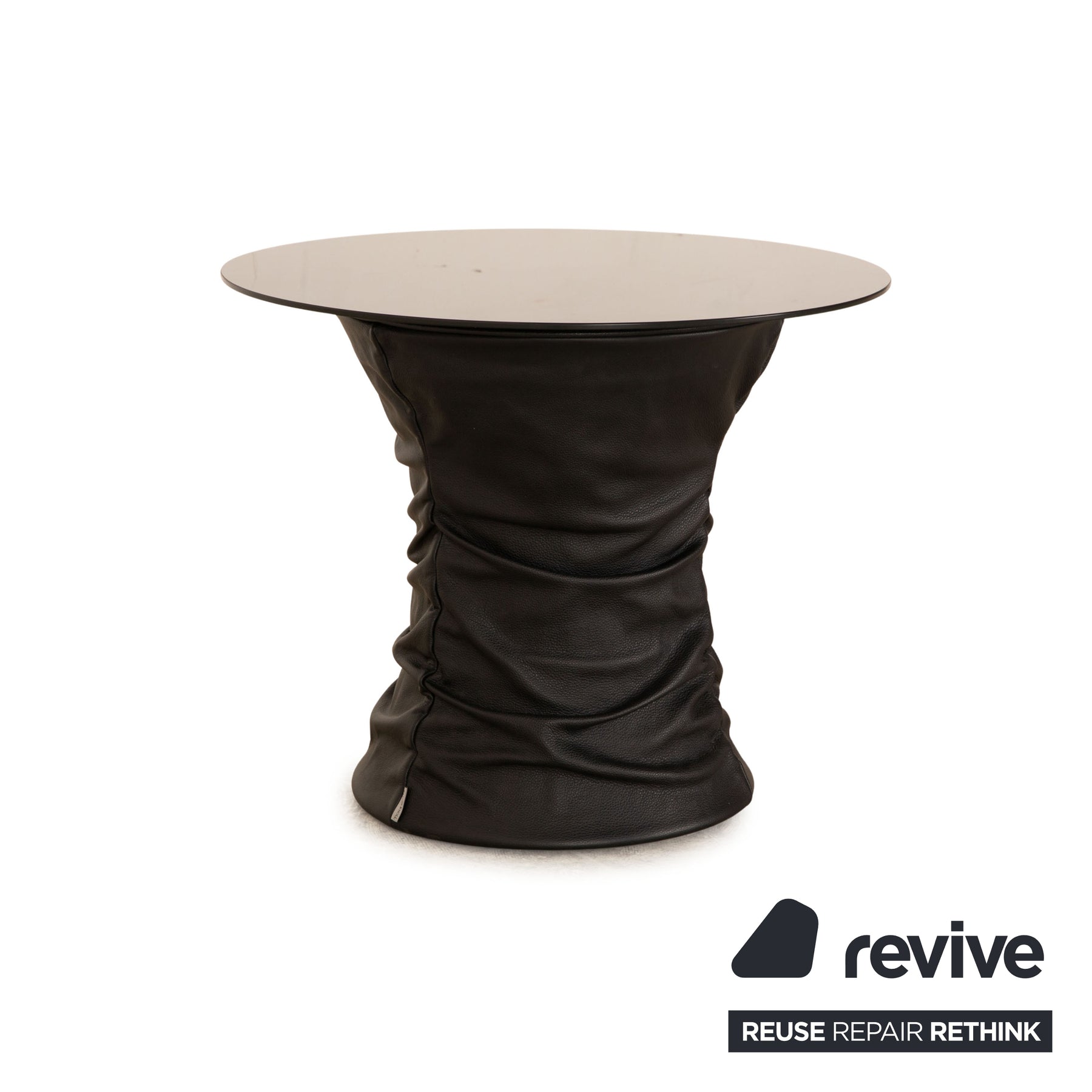 The Bellows Stool table by Walter Knoll consists of a round table top and stands on a base covered in black leather.