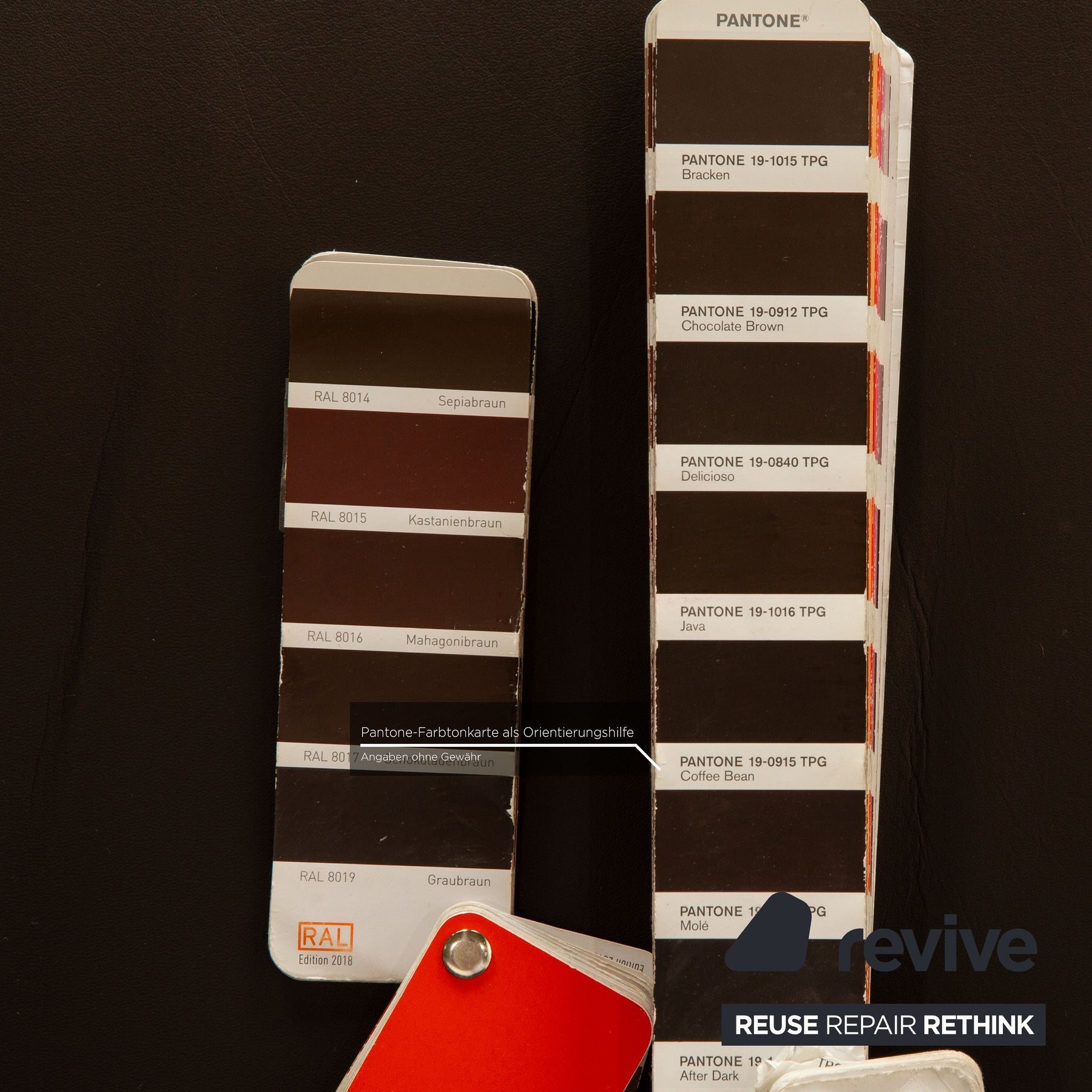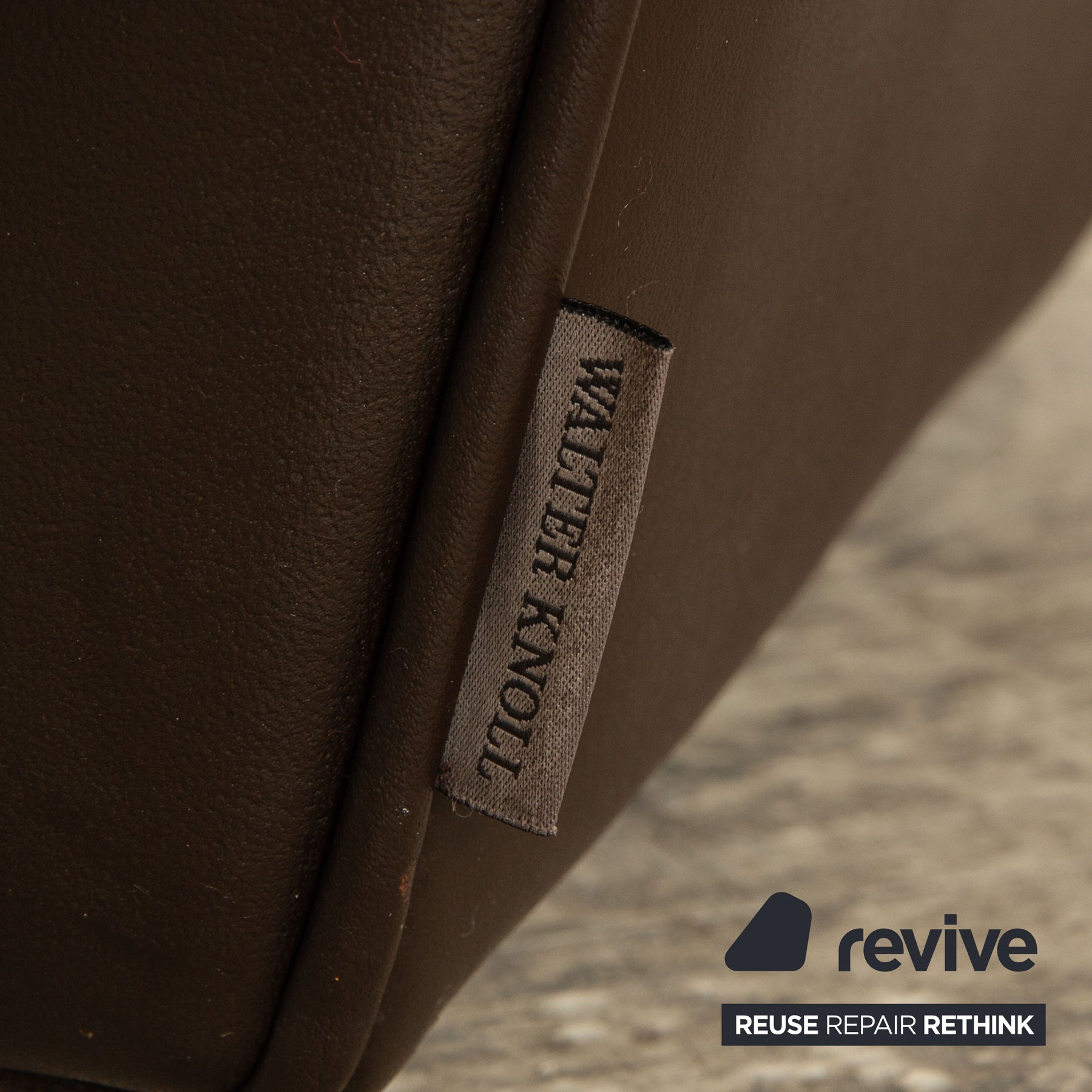The Drift armchair by Walter Knoll is covered in brown genuine leather and stands on a round metal base. It is characterized by its asymmetrical design and stylish, simple appearance.