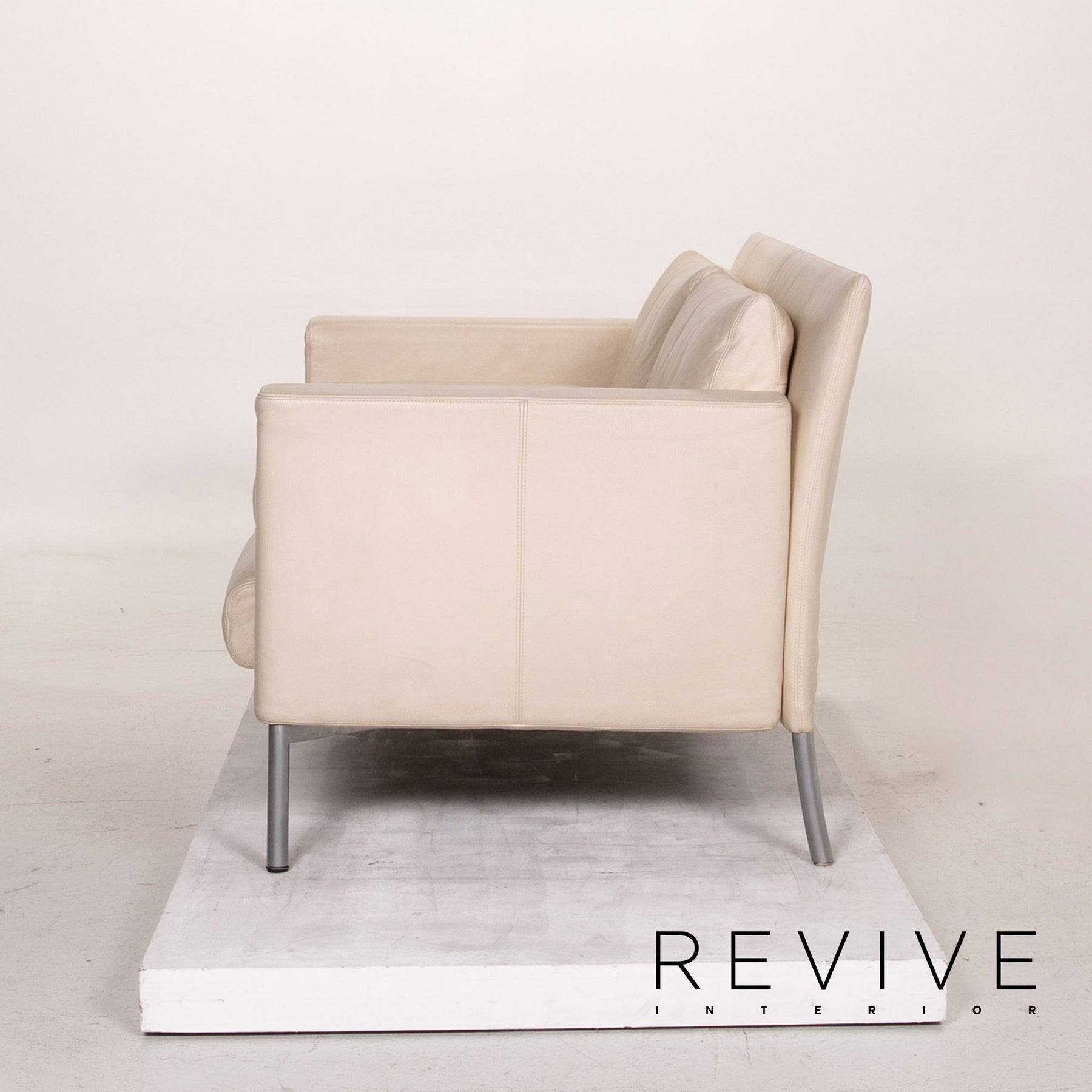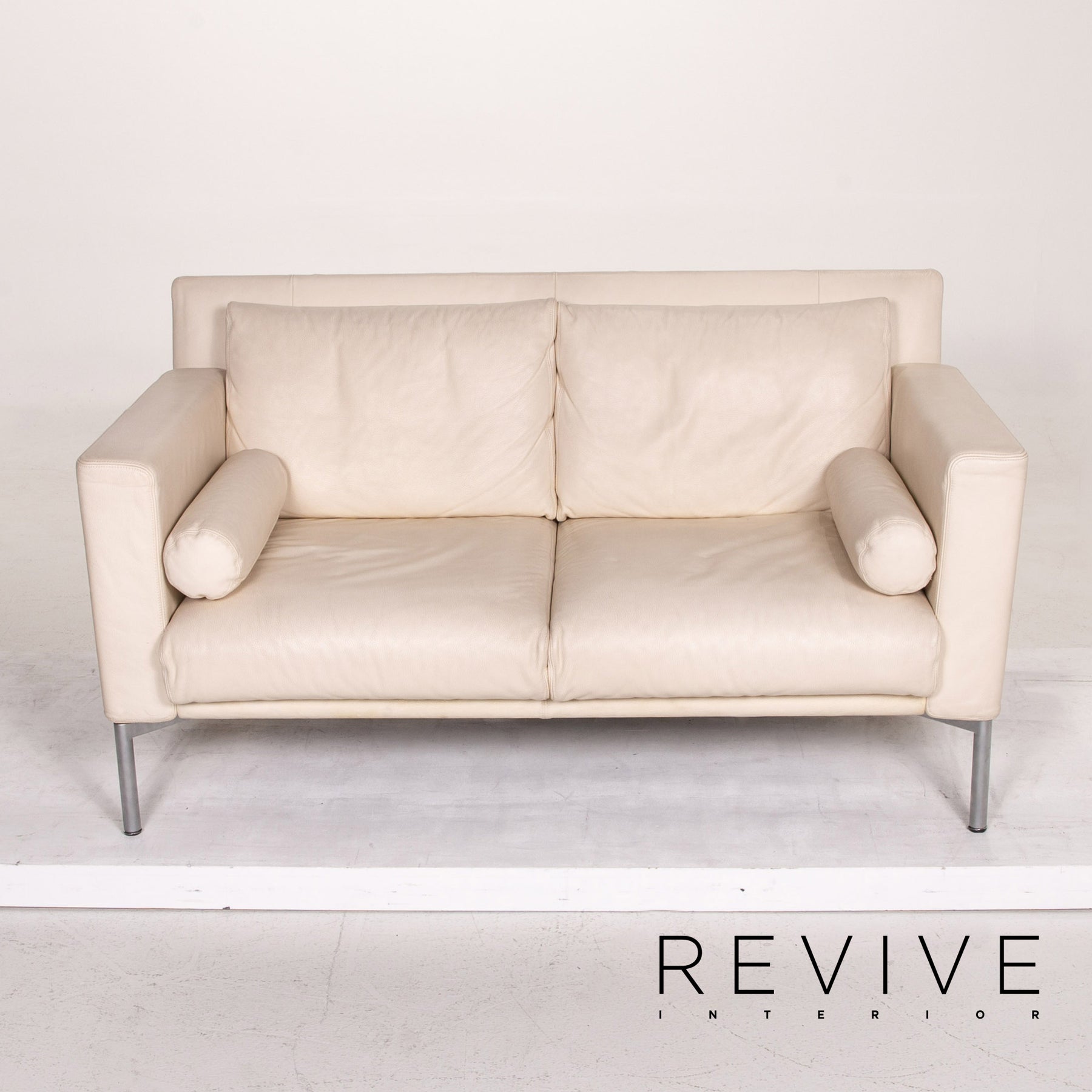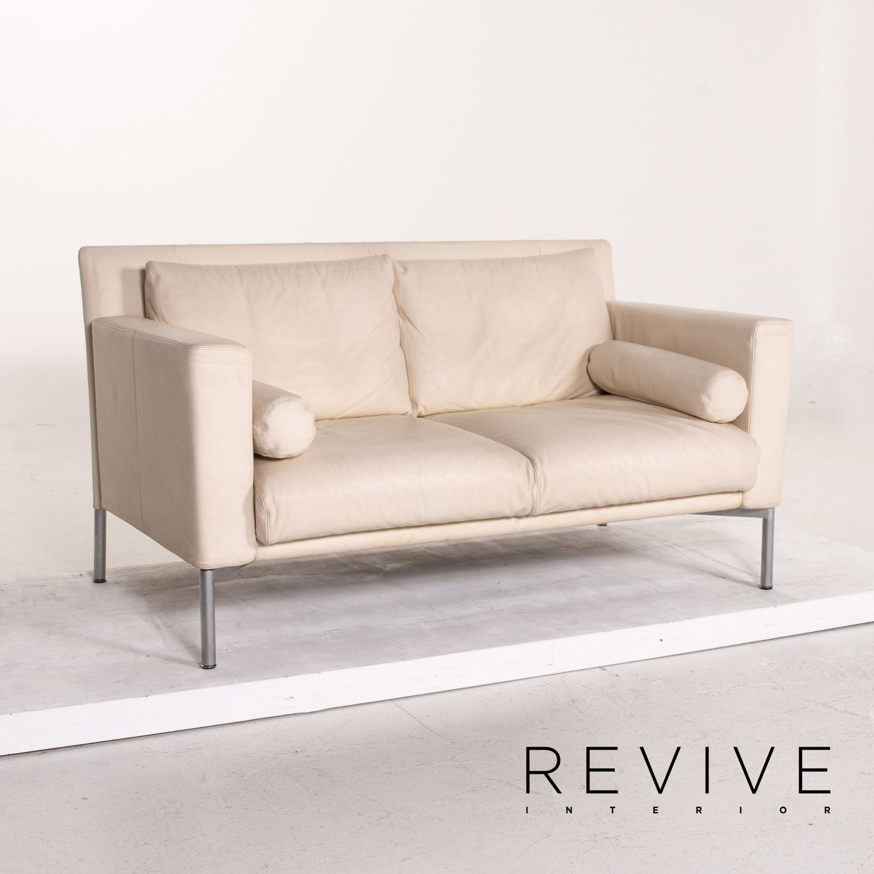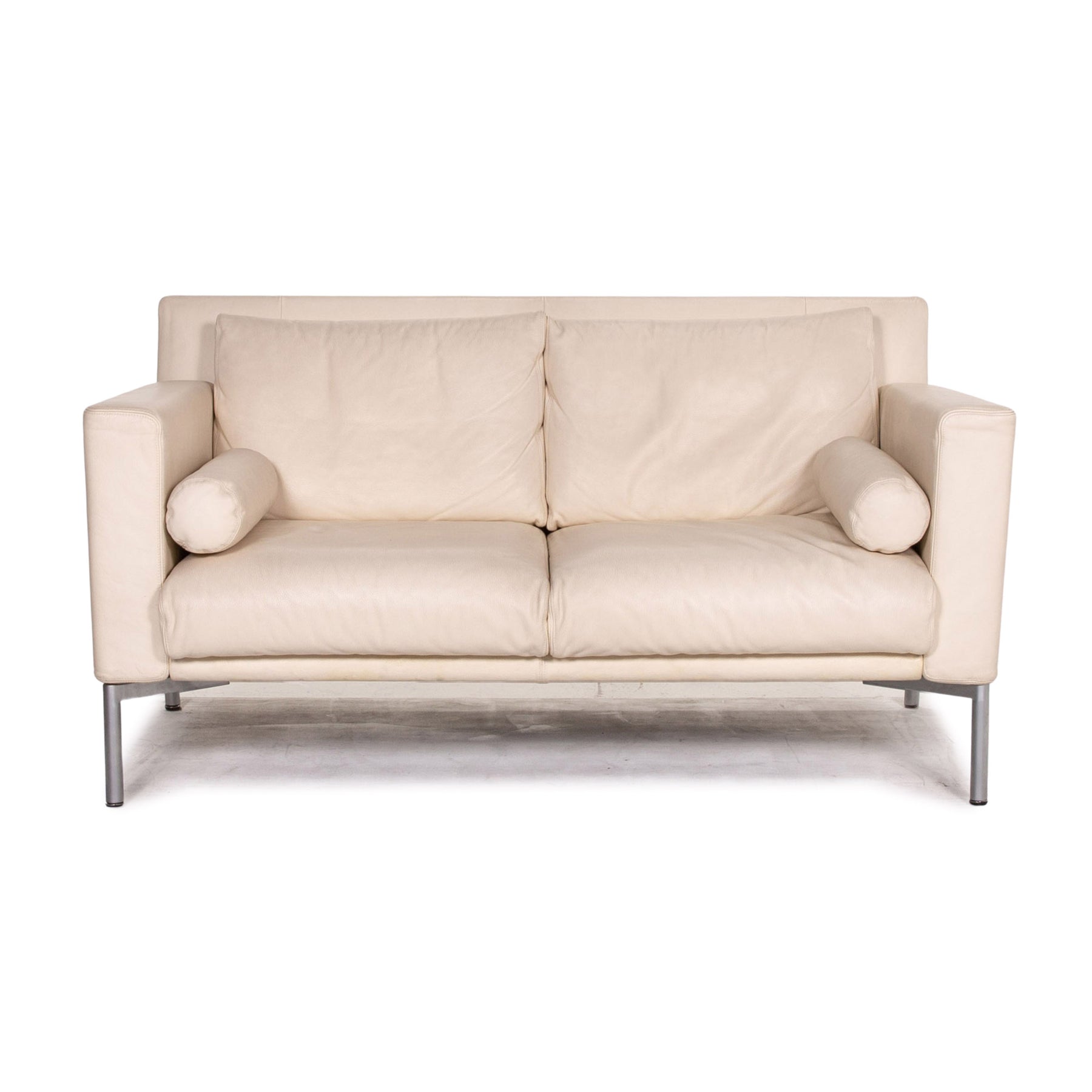 The two-seater by Walter Knoll is covered with cream-colored real leather and stands on high, slender metal feet. An angular, modern shape encases the soft seat and back cushions. The armrests can be folded down and the sofa can be converted into a sofa bed.