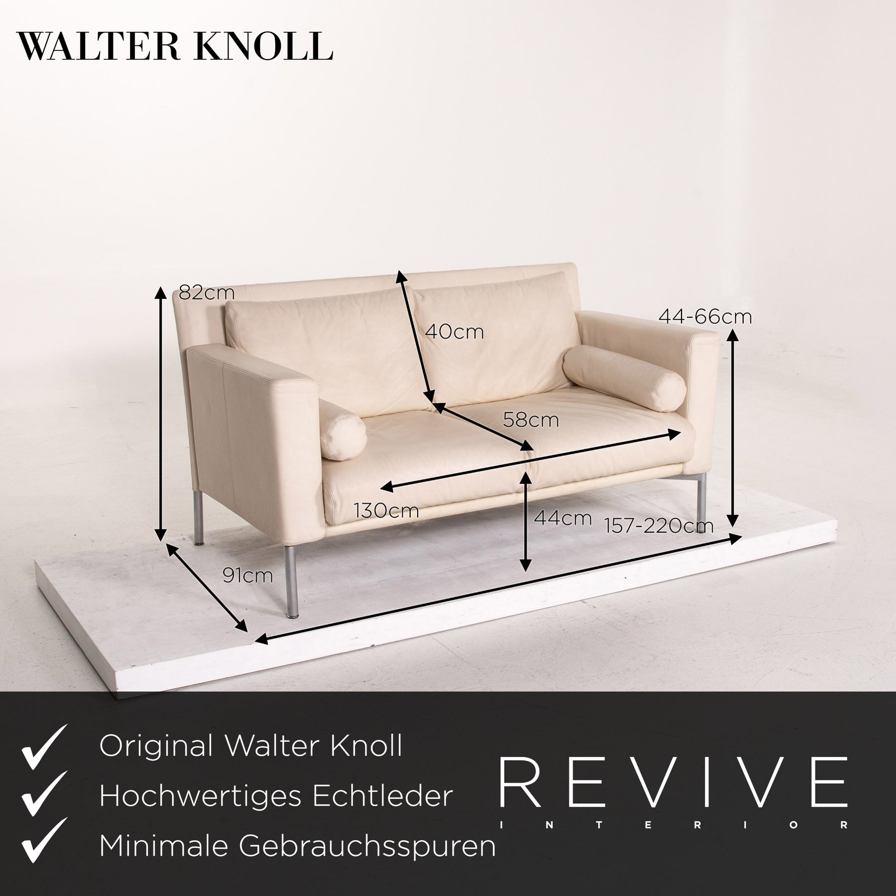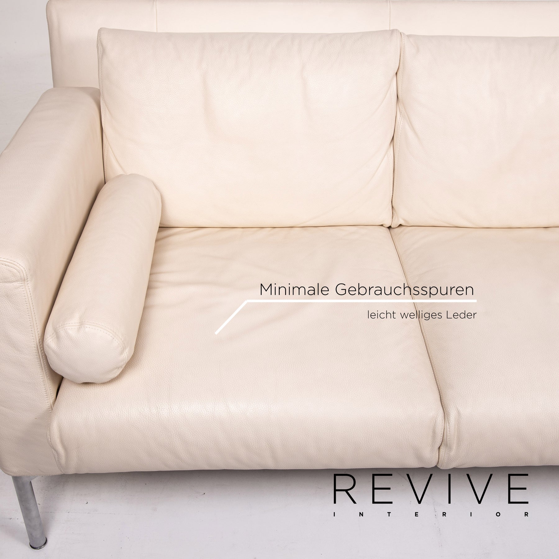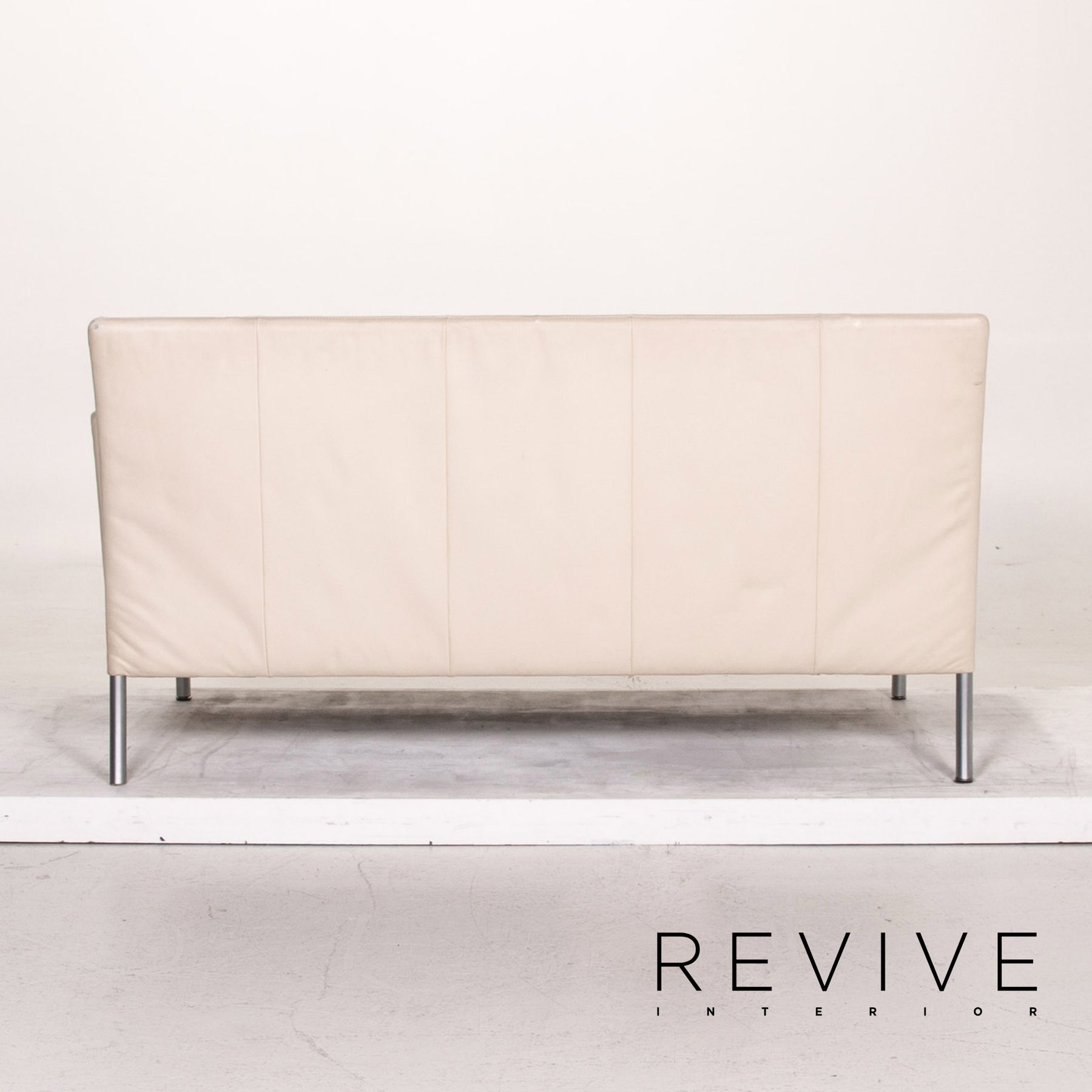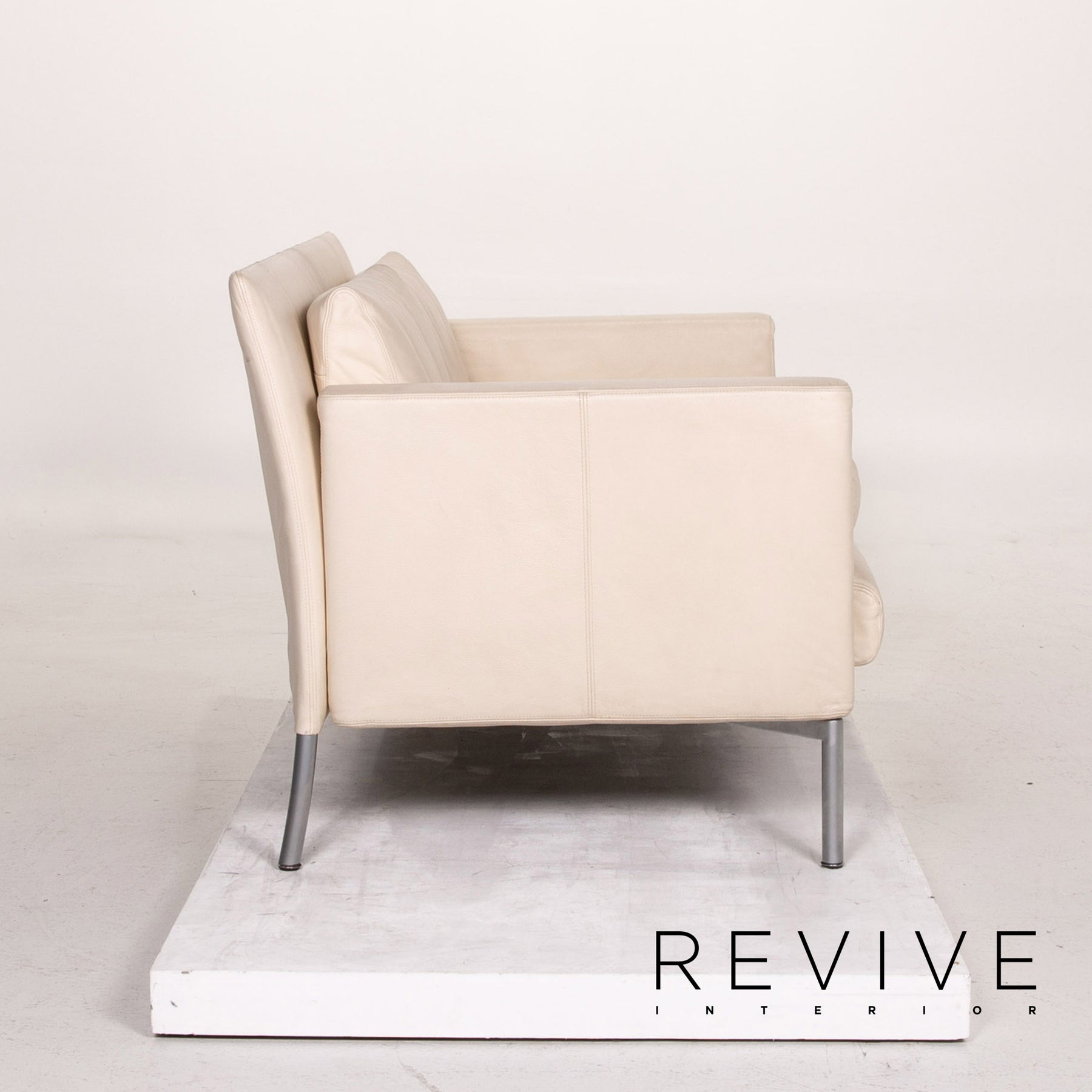 The two-seater by Walter Knoll is covered with cream-colored real leather and stands on high, slender metal feet. An angular, modern shape encases the soft seat and back cushions. The armrests can be folded down and the sofa can be converted into a sofa bed.