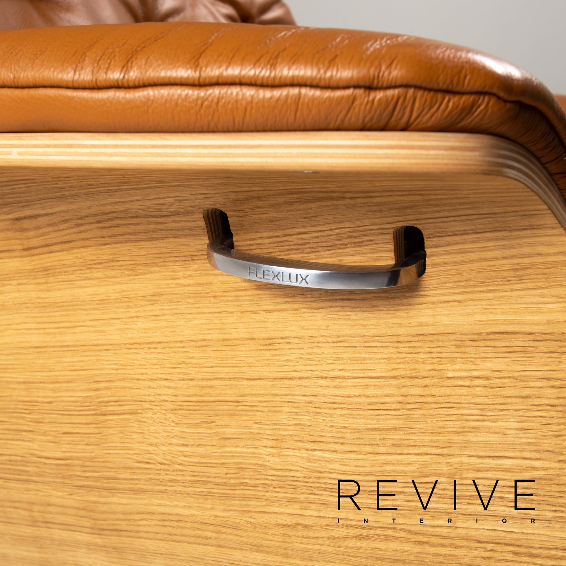 The armchair produced by Flexlux for Who's Perfect is covered with cognac-colored real leather and is set in a wooden seat and back shell. The chrome-plated feet ensure modernity and airiness. The subtle tufting on the back and seat upholstery ensures a cozy lounge flair. The armchair can be placed in a relax position for more comfort.