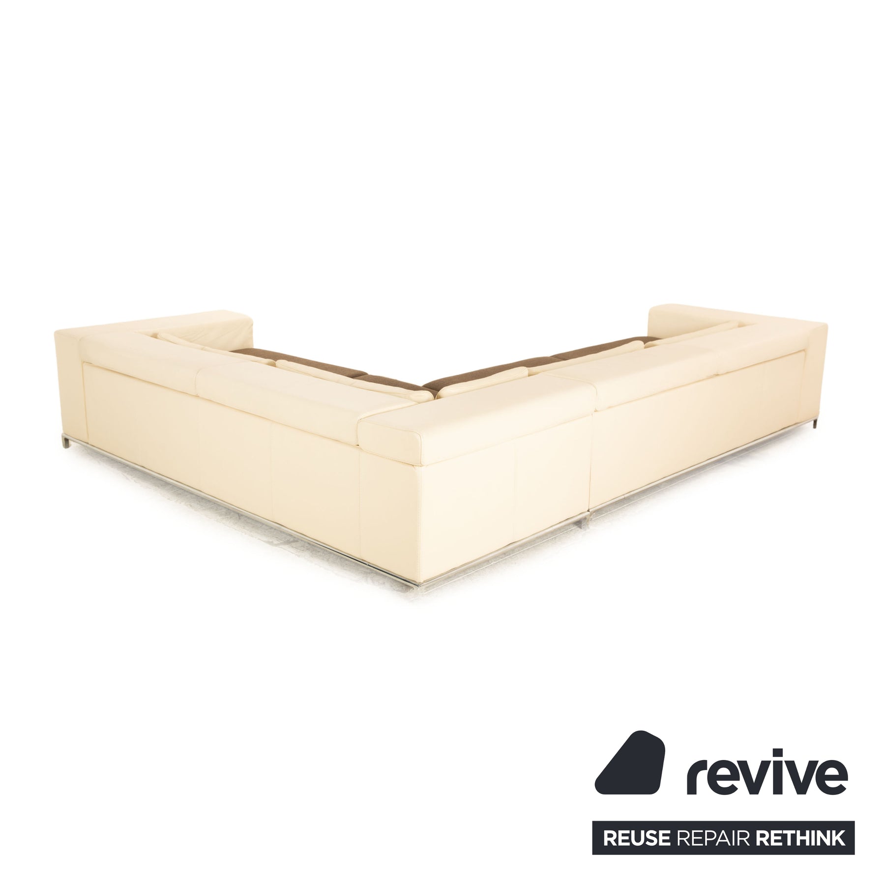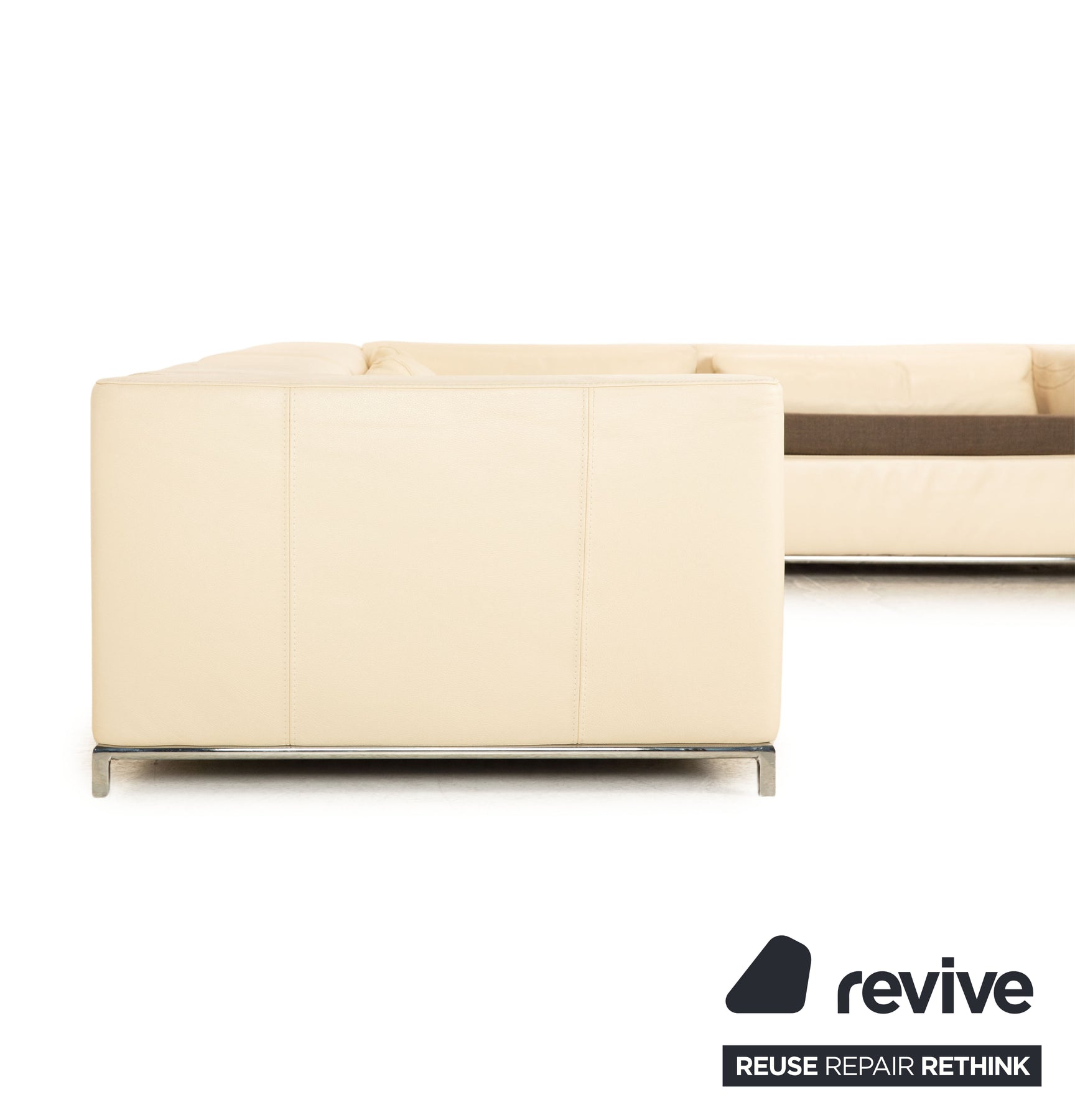 The Boston sofa from Who's Perfect is covered in cream-colored genuine leather and stands on small metal feet. The corner sofa impresses with its timeless design and large seating area.