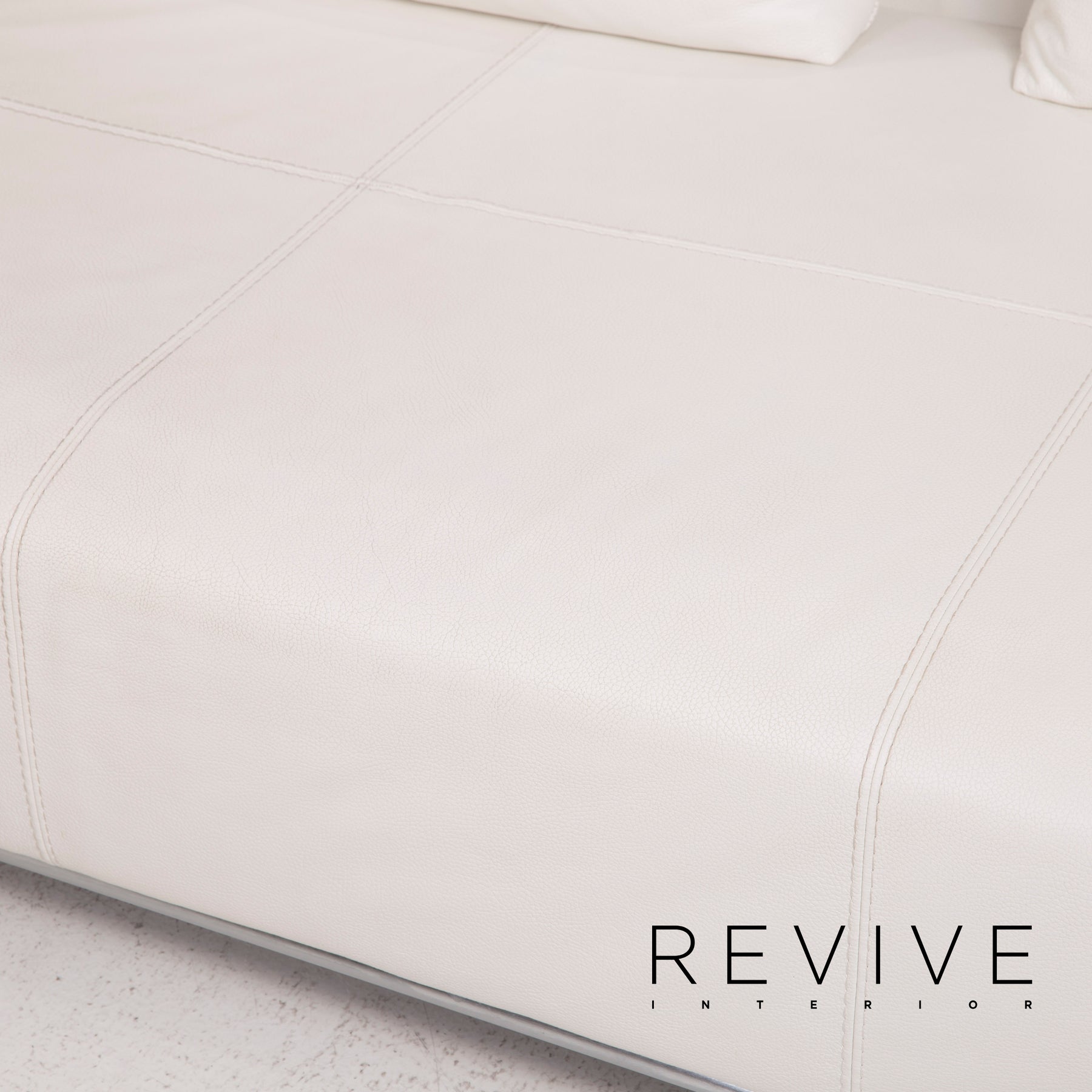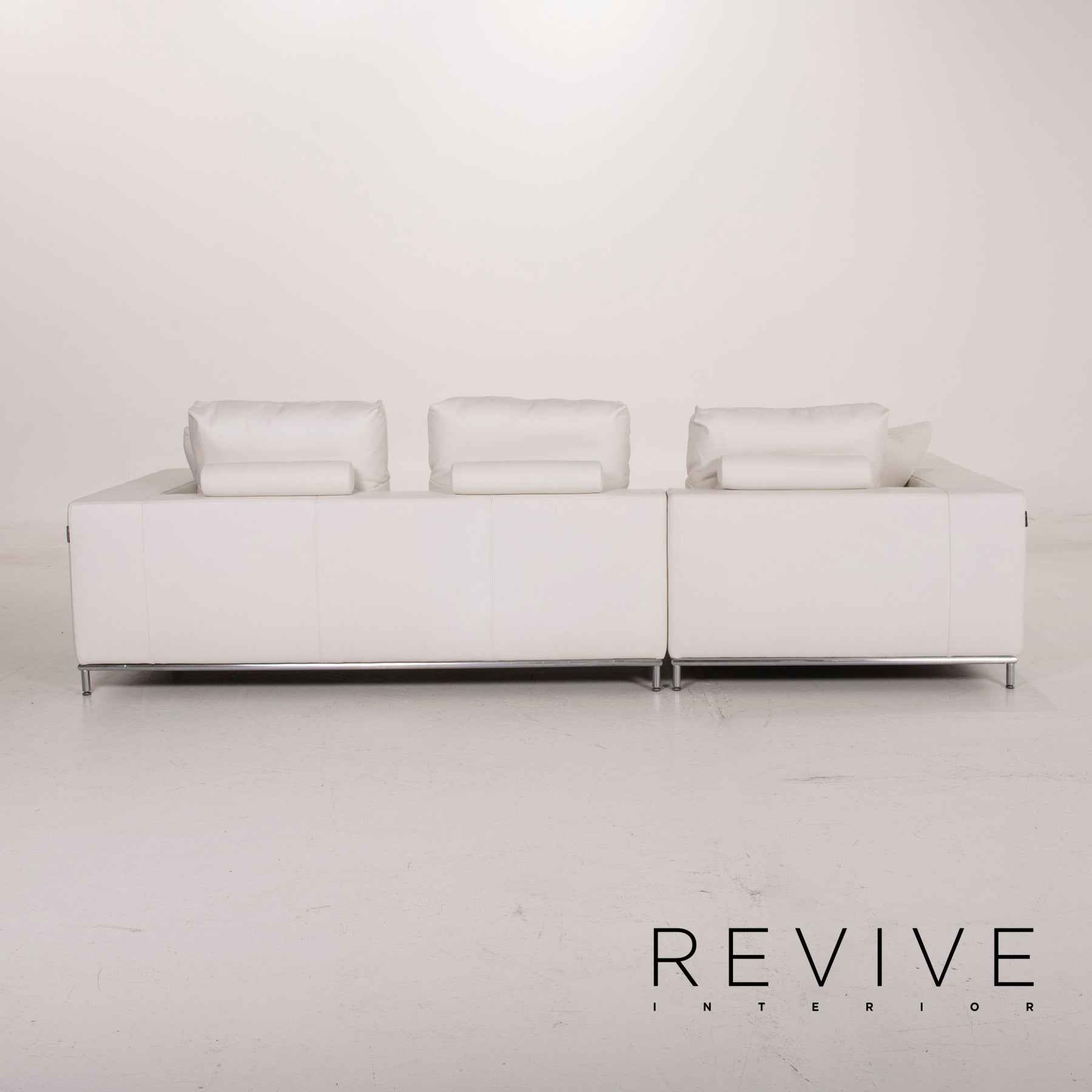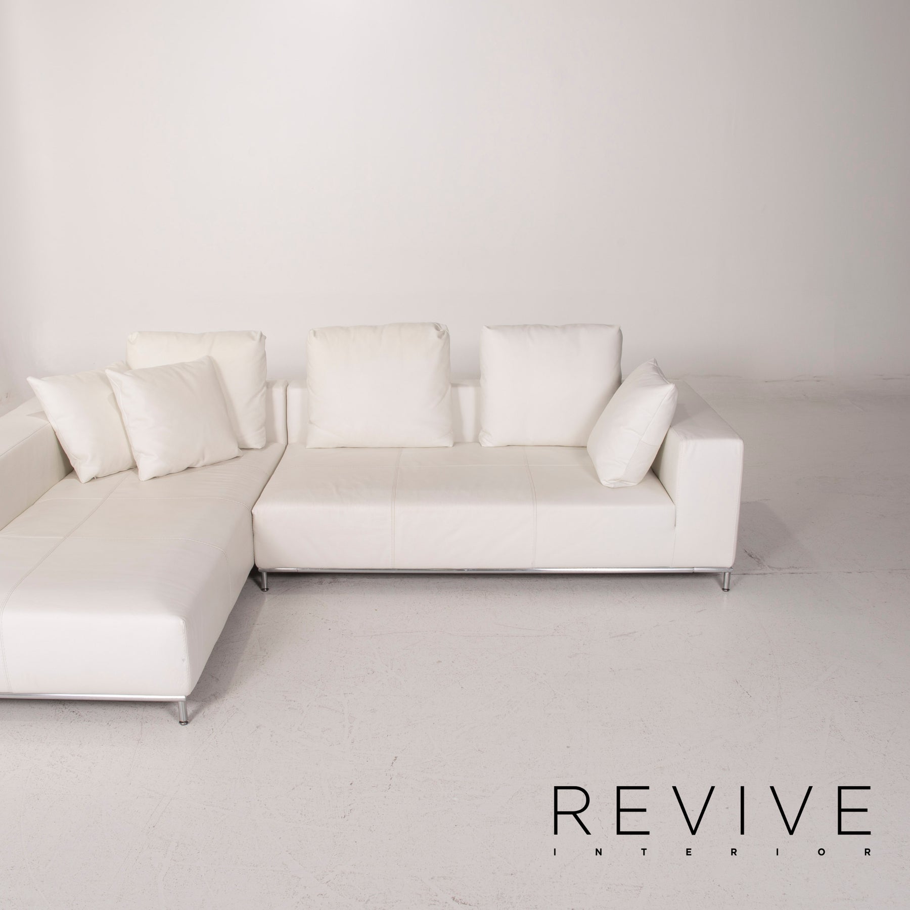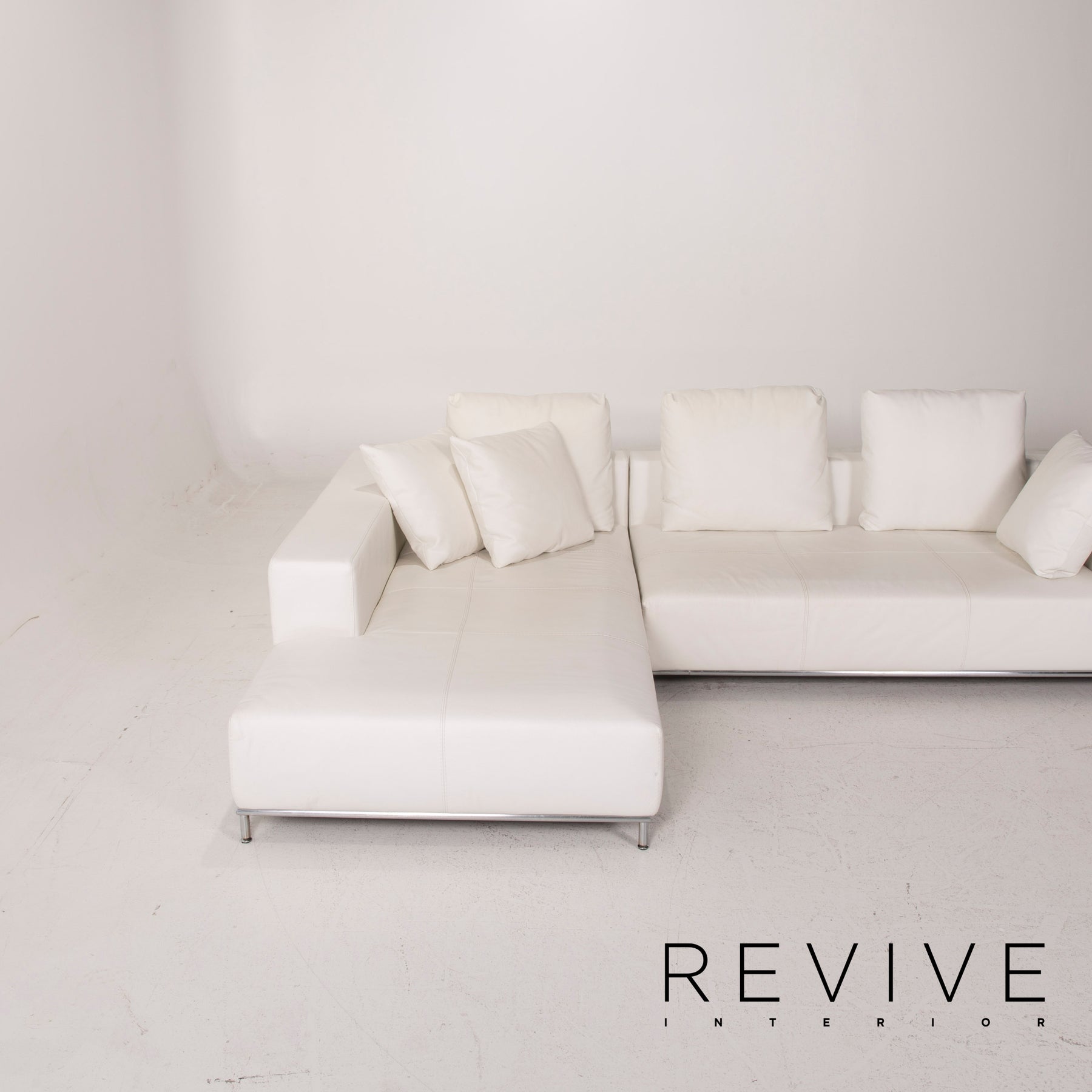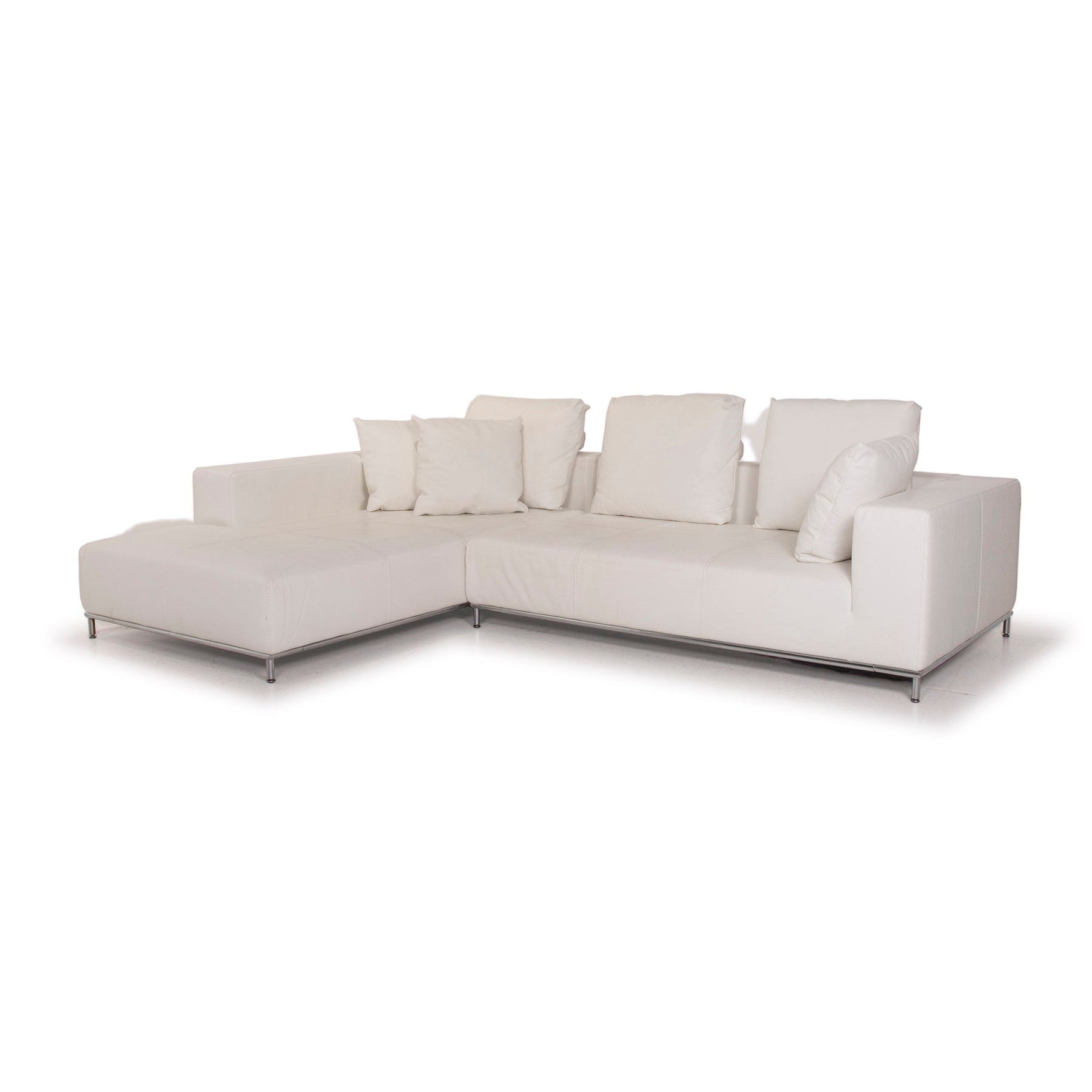 The Granada corner sofa by Who's Perfect is upholstered in white genuine leather and stands on a metal frame. Plenty of pillows offer great comfort.