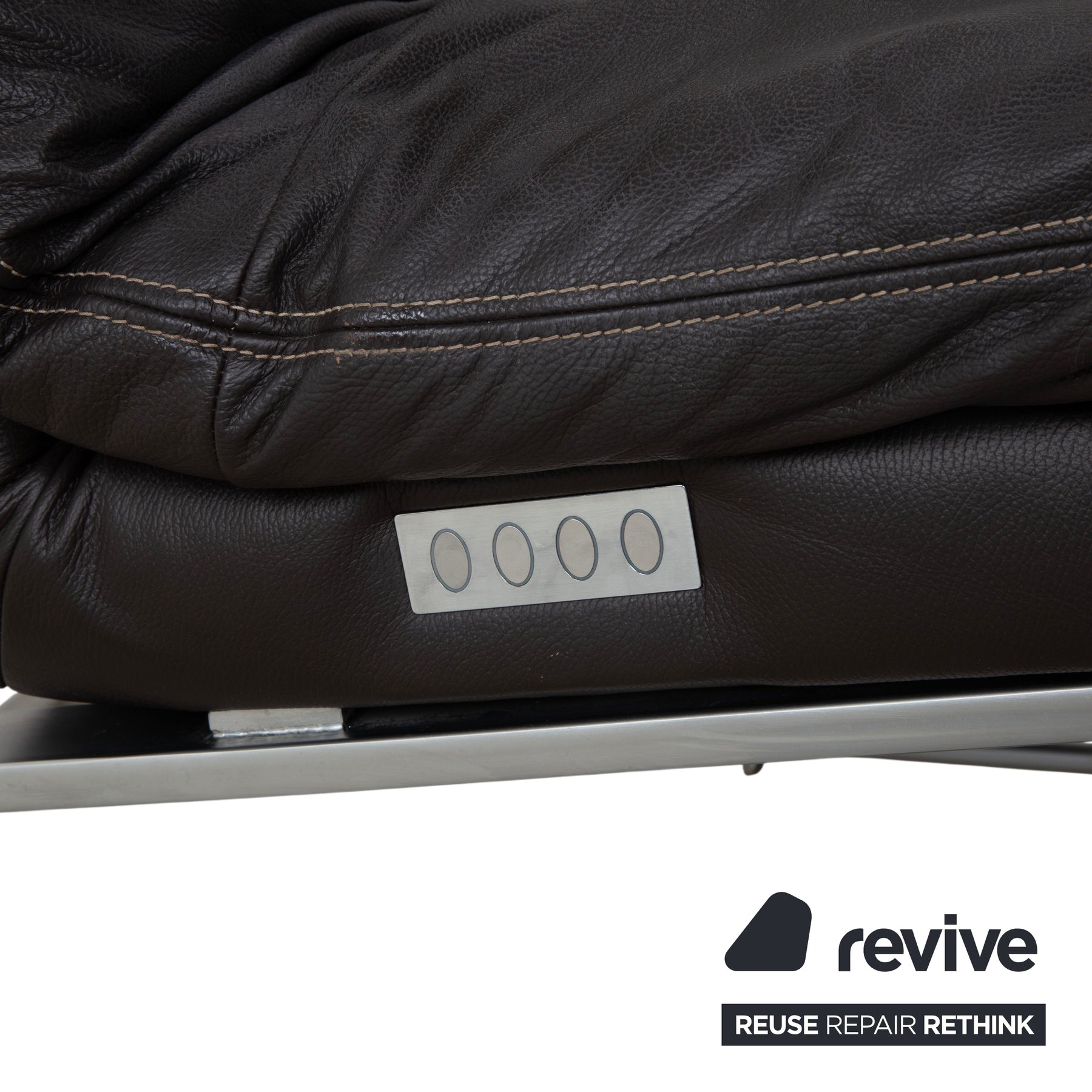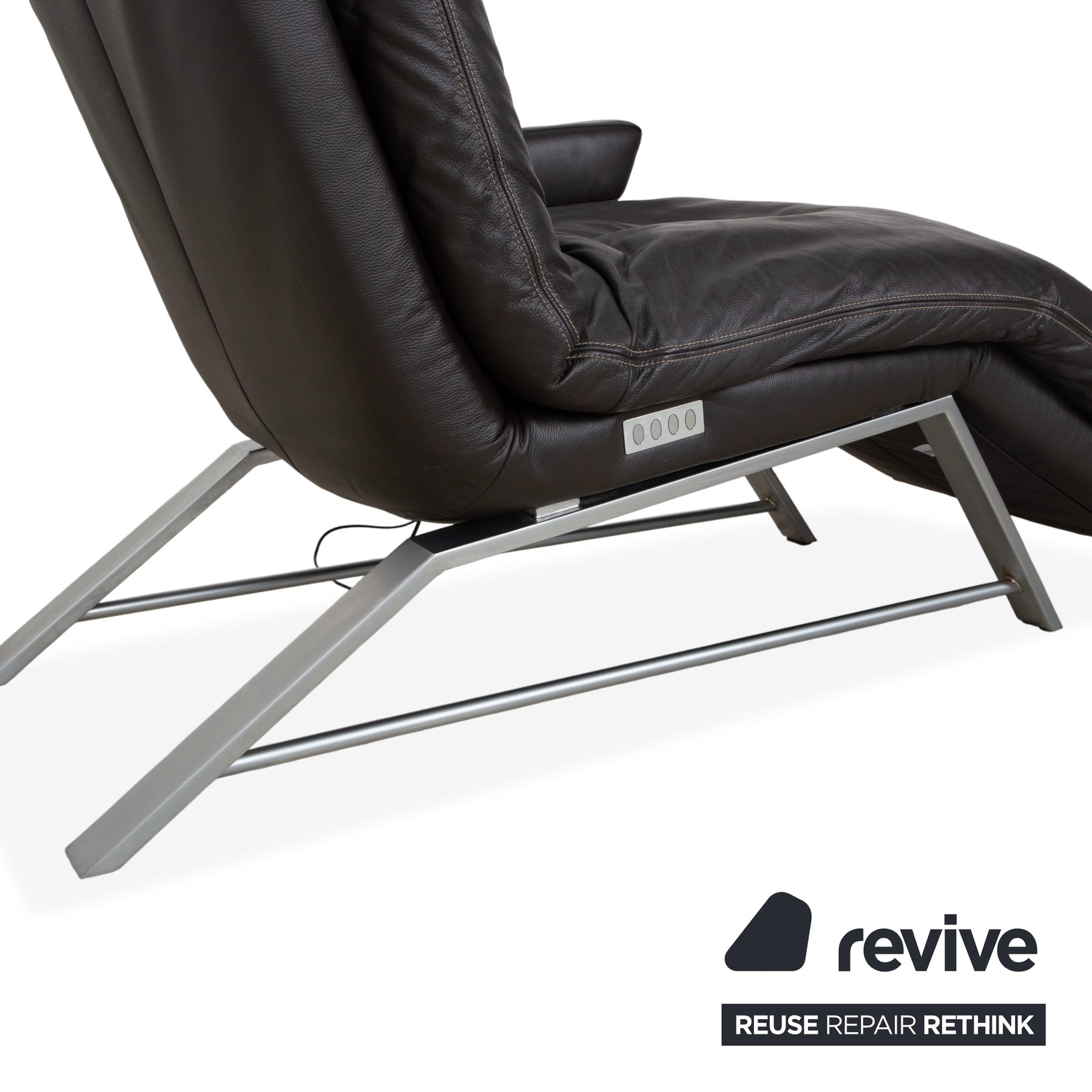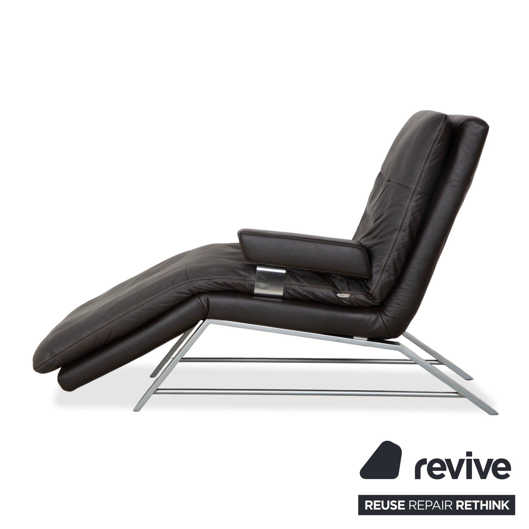 The chaise longue is upholstered in high-quality leather in a deep dark brown (espresso or mocha). A particularly beautiful detail that underscores the craftsmanship is the light contrast stitching. It elegantly traces the curved silhouette of the reclining surface and the cushions. The design appears light and floating.