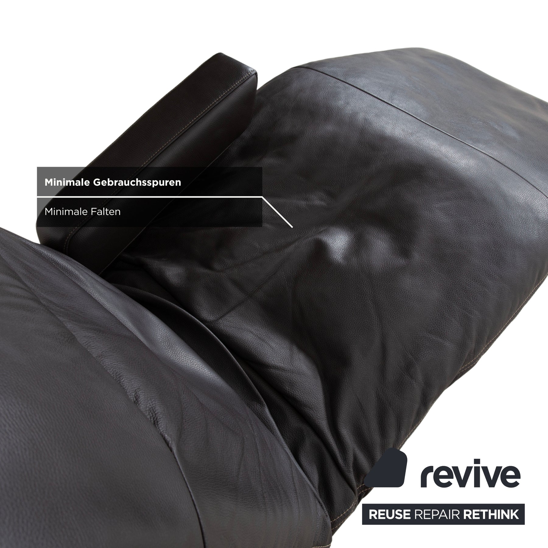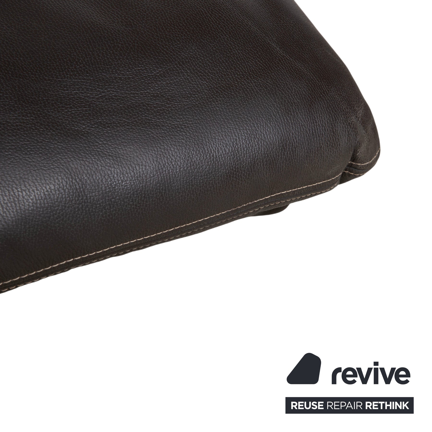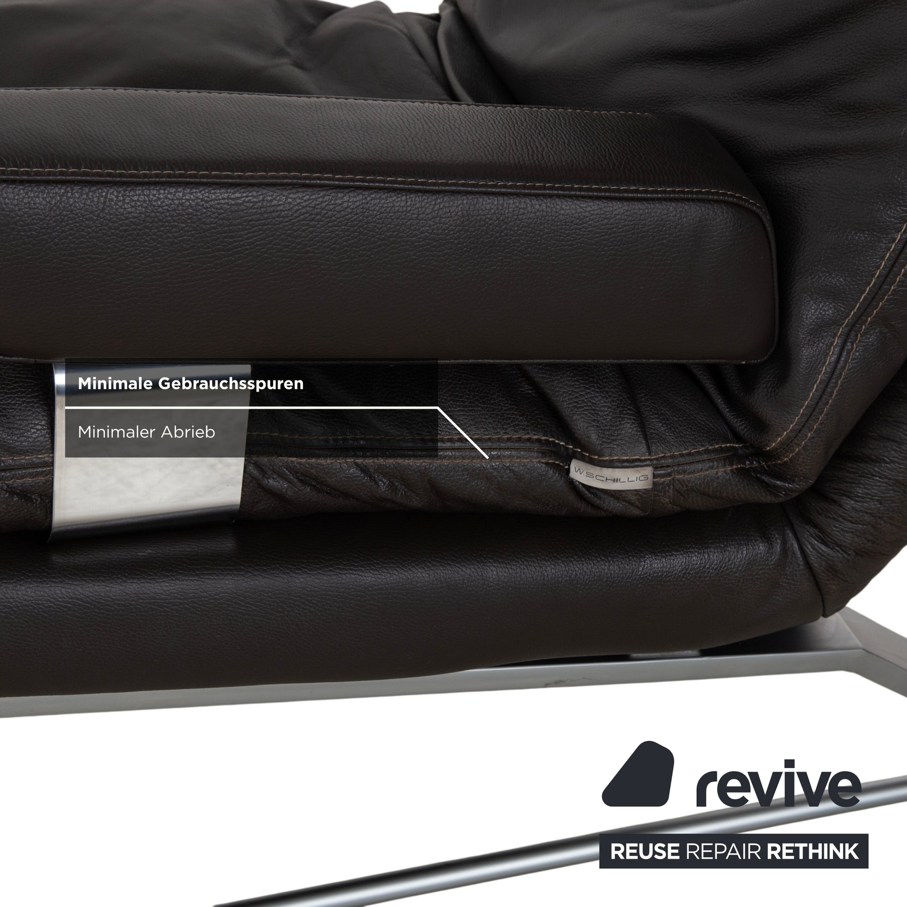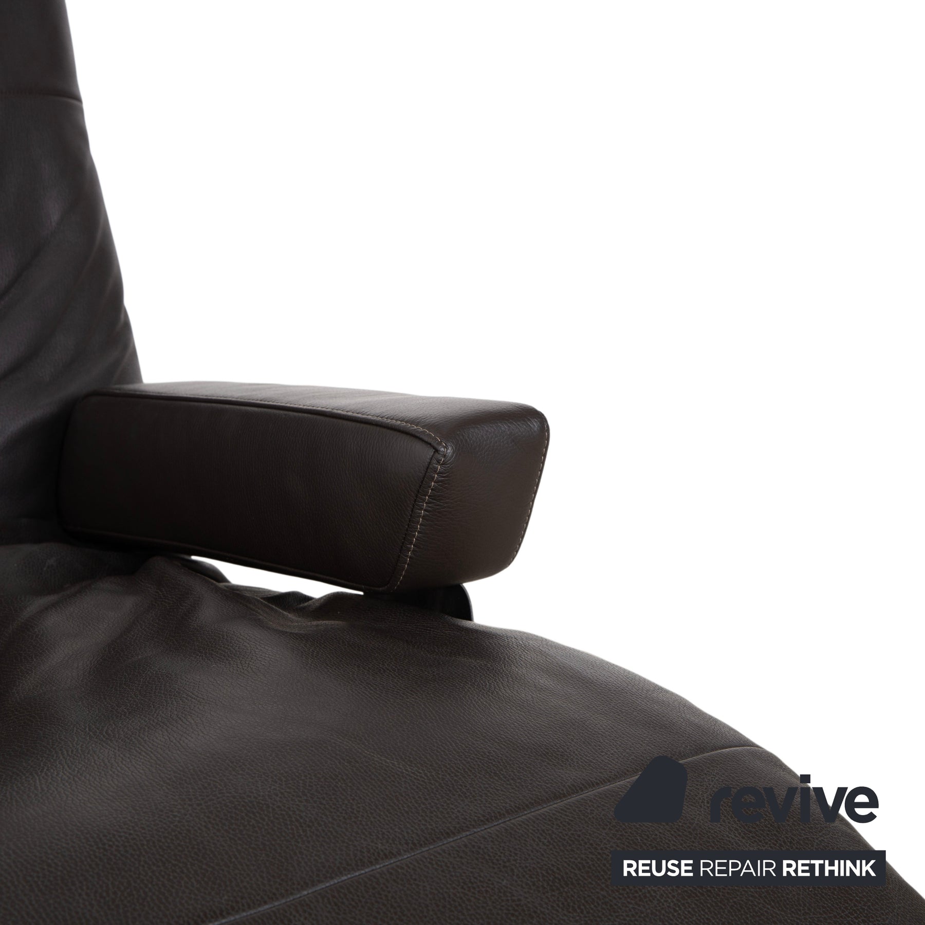 The chaise longue is upholstered in high-quality leather in a deep dark brown (espresso or mocha). A particularly beautiful detail that underscores the craftsmanship is the light contrast stitching. It elegantly traces the curved silhouette of the reclining surface and the cushions. The design appears light and floating.