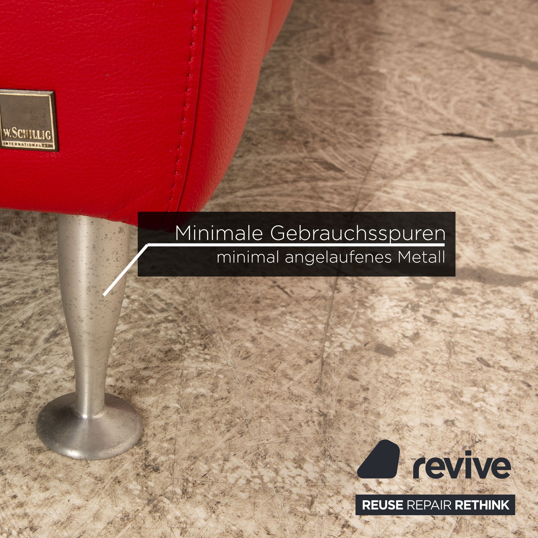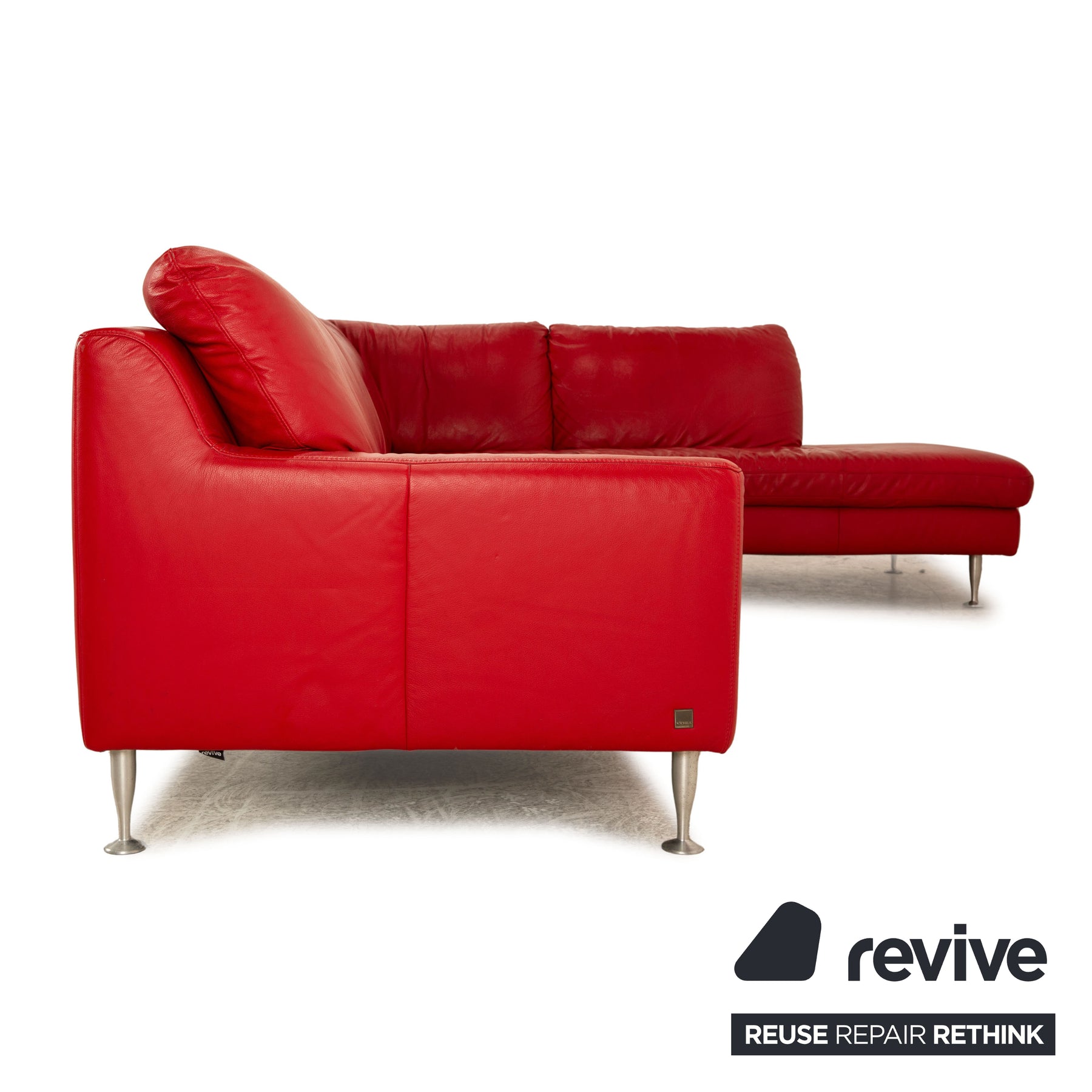 The corner sofa by Willii Schillig is covered in red genuine leather and stands on silver metal feet. It is characterized by its simple, classic design and timeless look.