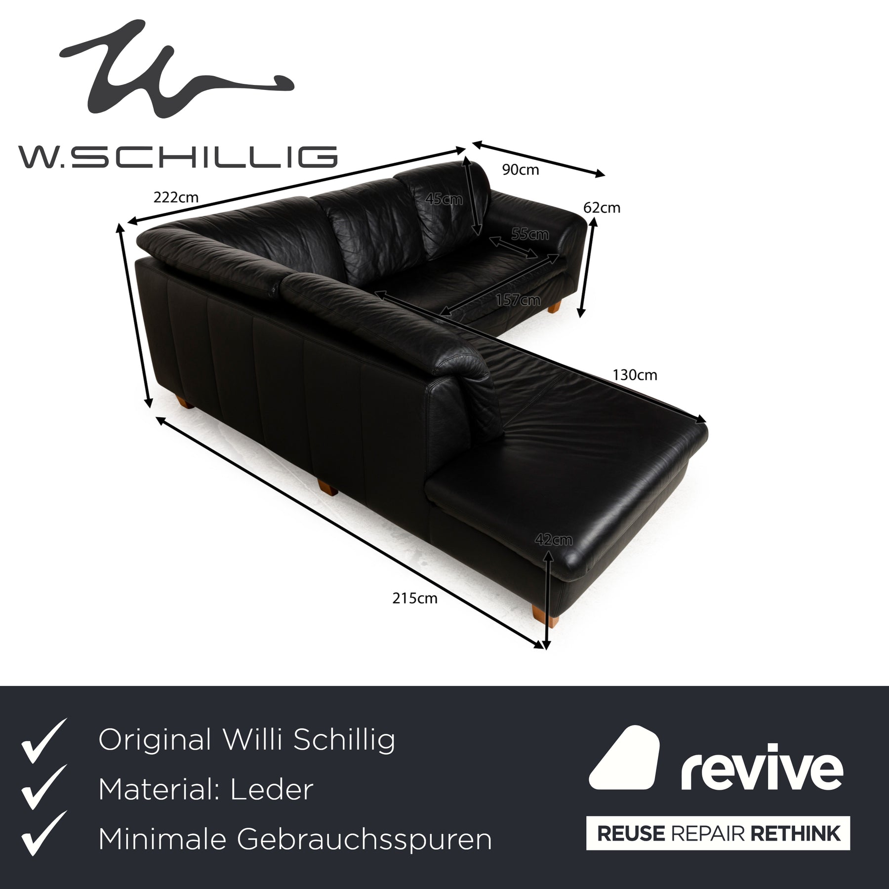 The sofa by Willi Schillig is upholstered in black leather and stands on angular brown wooden feet. The corner sofa features a classic design with wide armrests and high backrests, making it an easily combinable element in any modern living room.