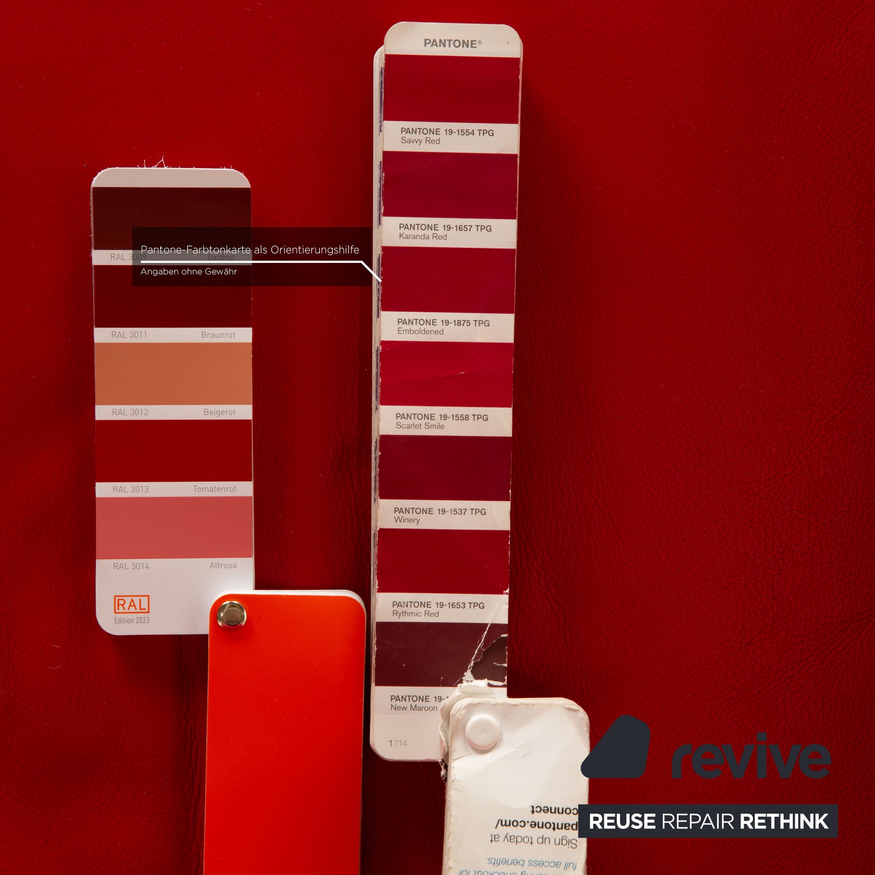 The Willi Schillig armchair is covered with red genuine leather and stands on small metal feet. The comfortable armrests and the timeless design set it apart.