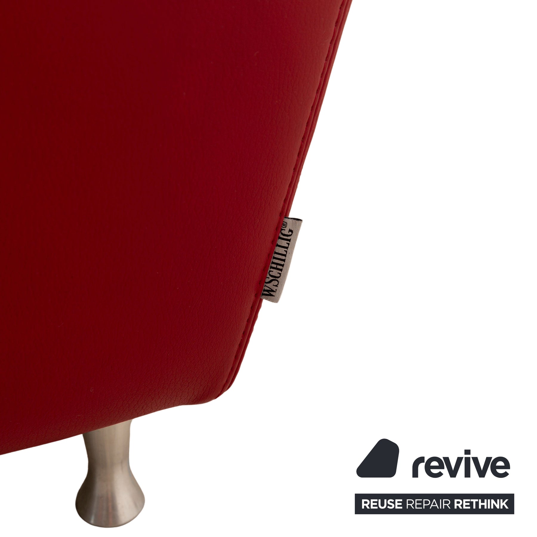 The armchair by Willi Schillig comes in a classic design and impresses with its generously sized armrests and its striking color. It is covered in red genuine leather and stands on narrow metal legs. It also has a removable headrest.
