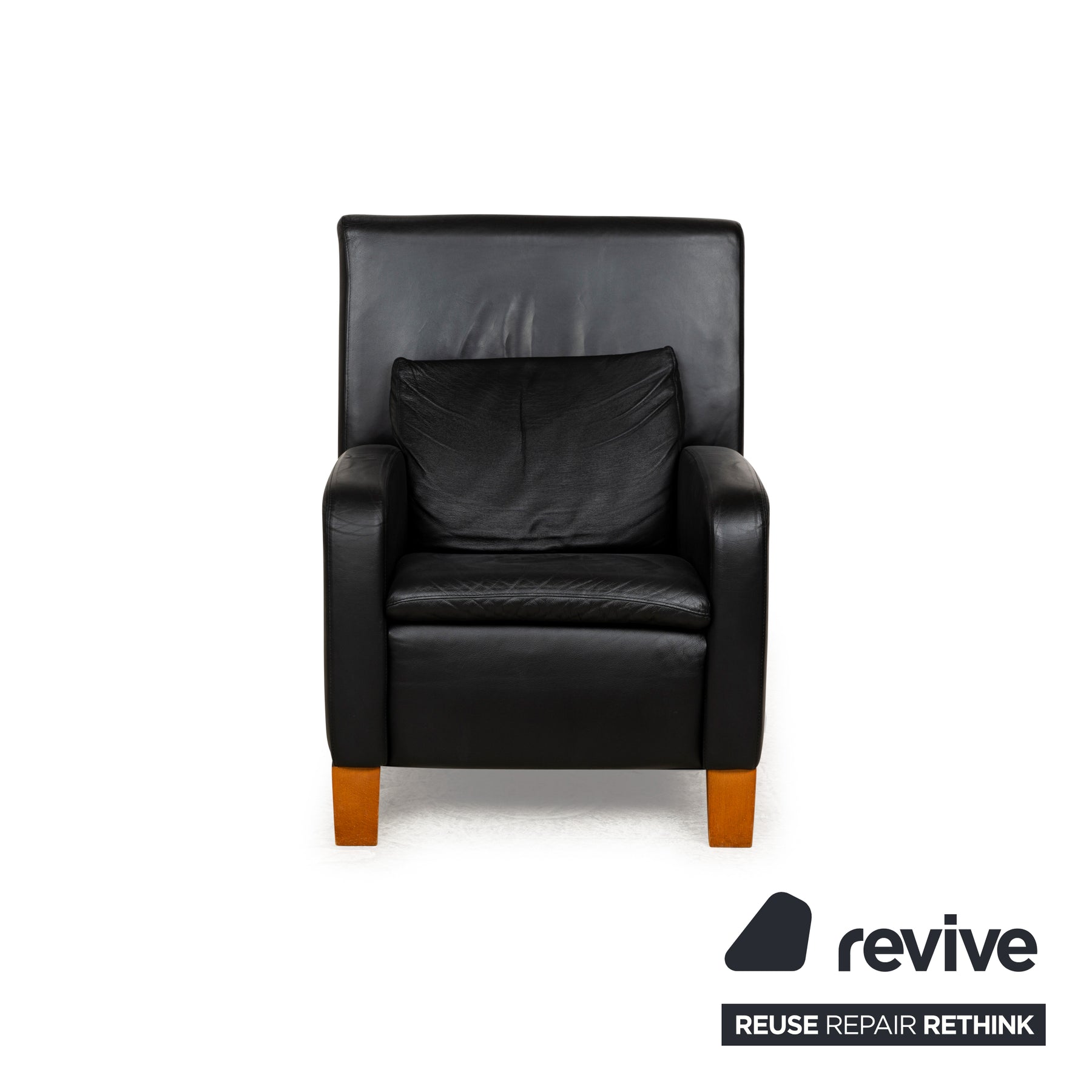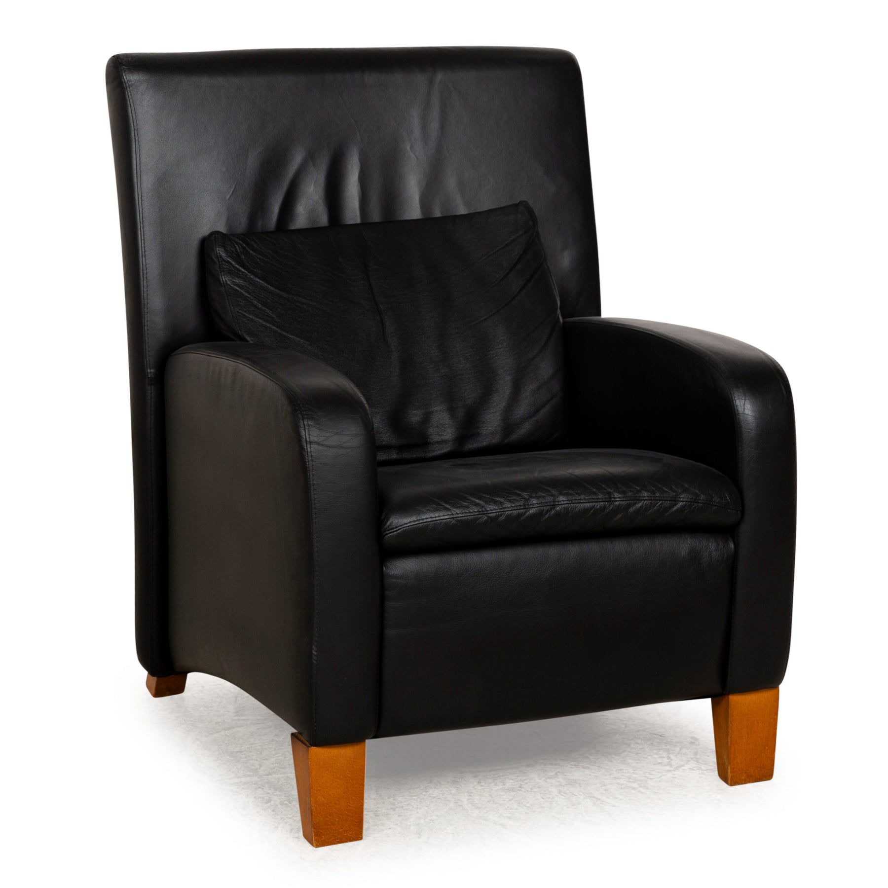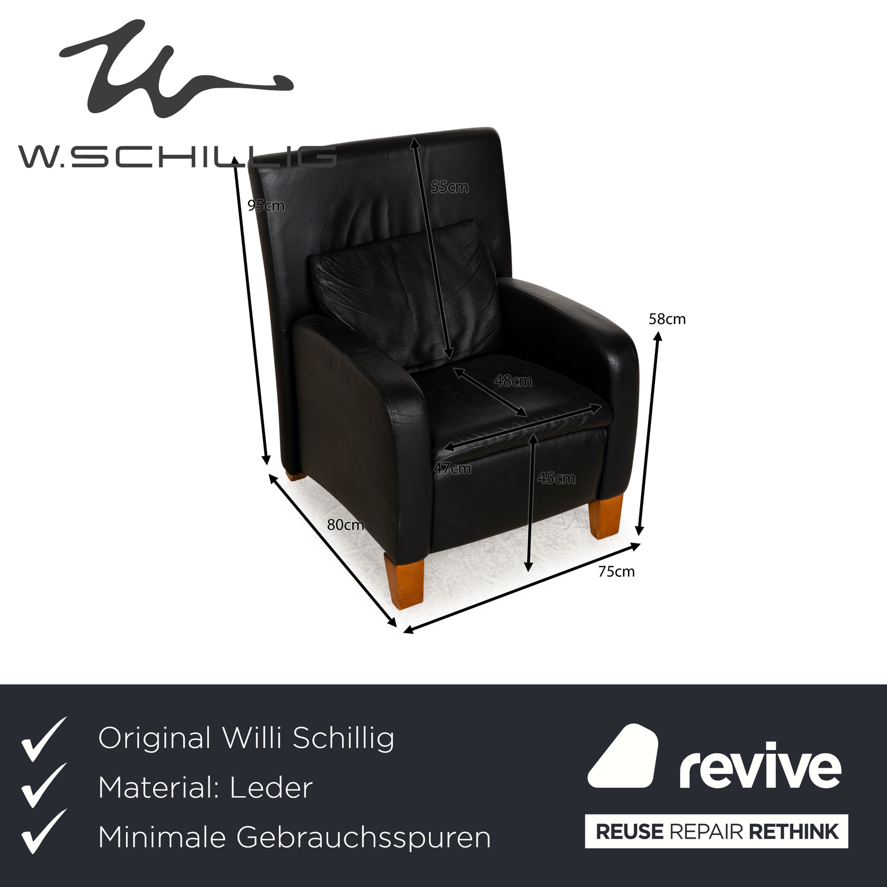 The armchair by Willi Schillig is upholstered in black leather and stands on angular brown wooden feet. It features a classic design with curved armrests and a high backrest, making it an easily combinable element in any modern living room.