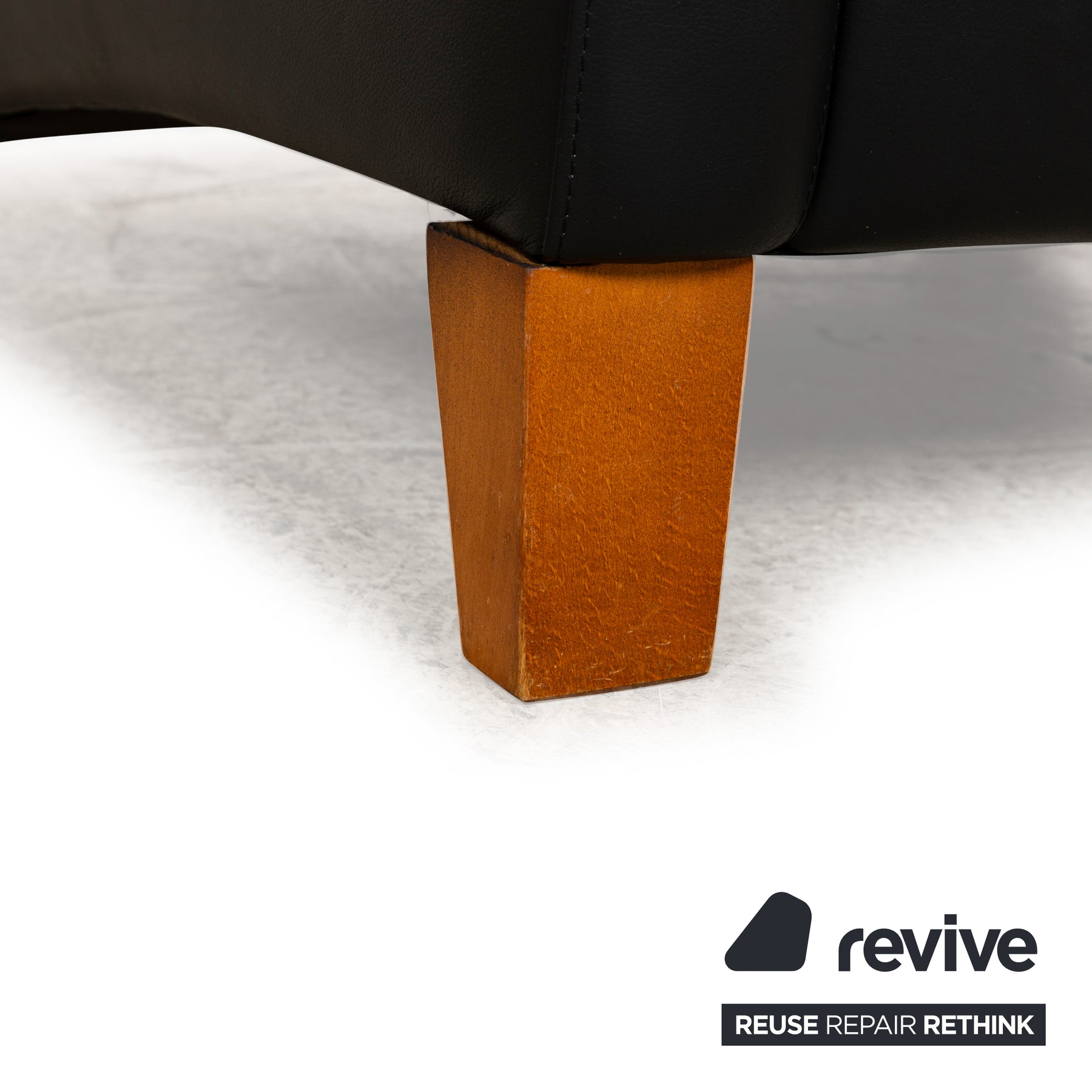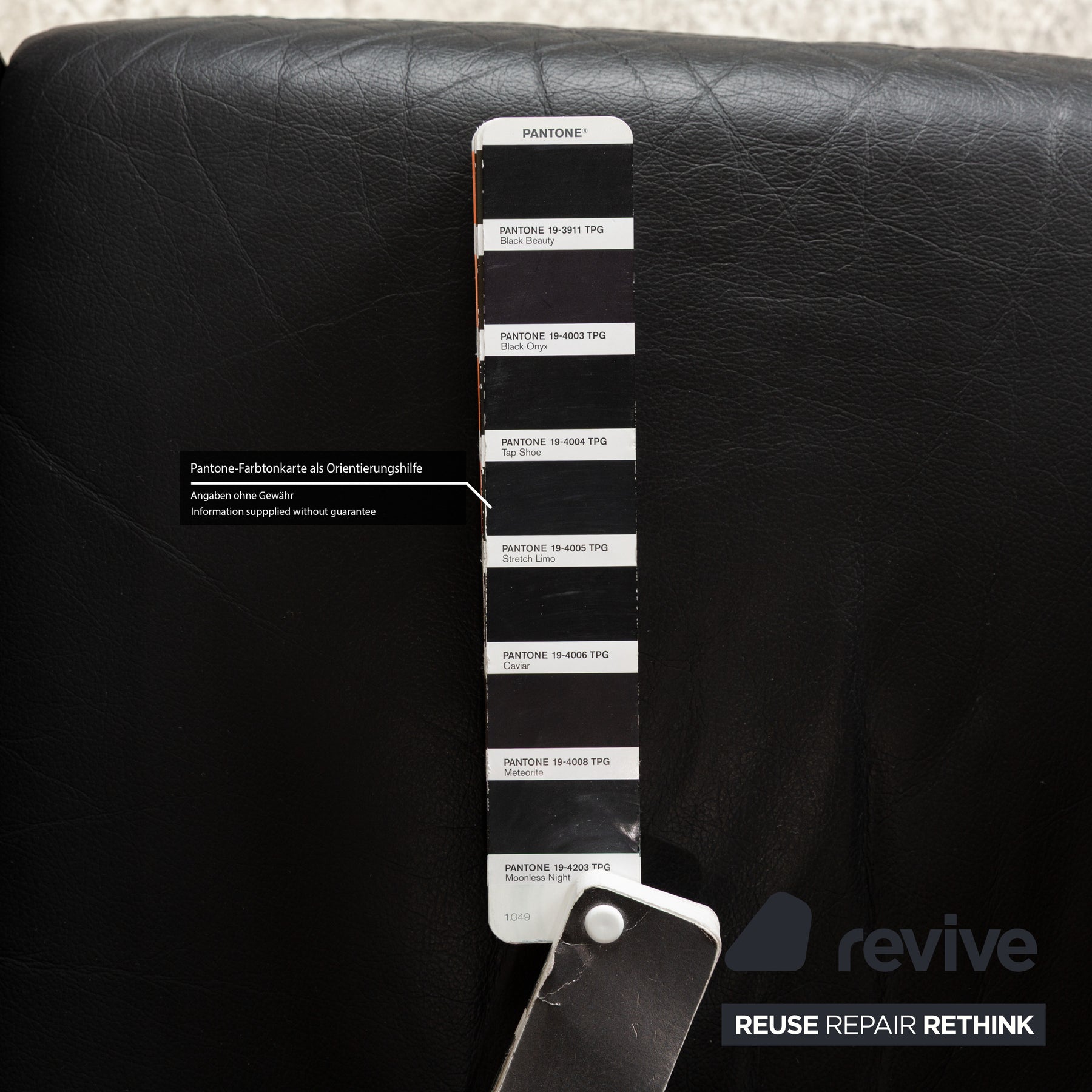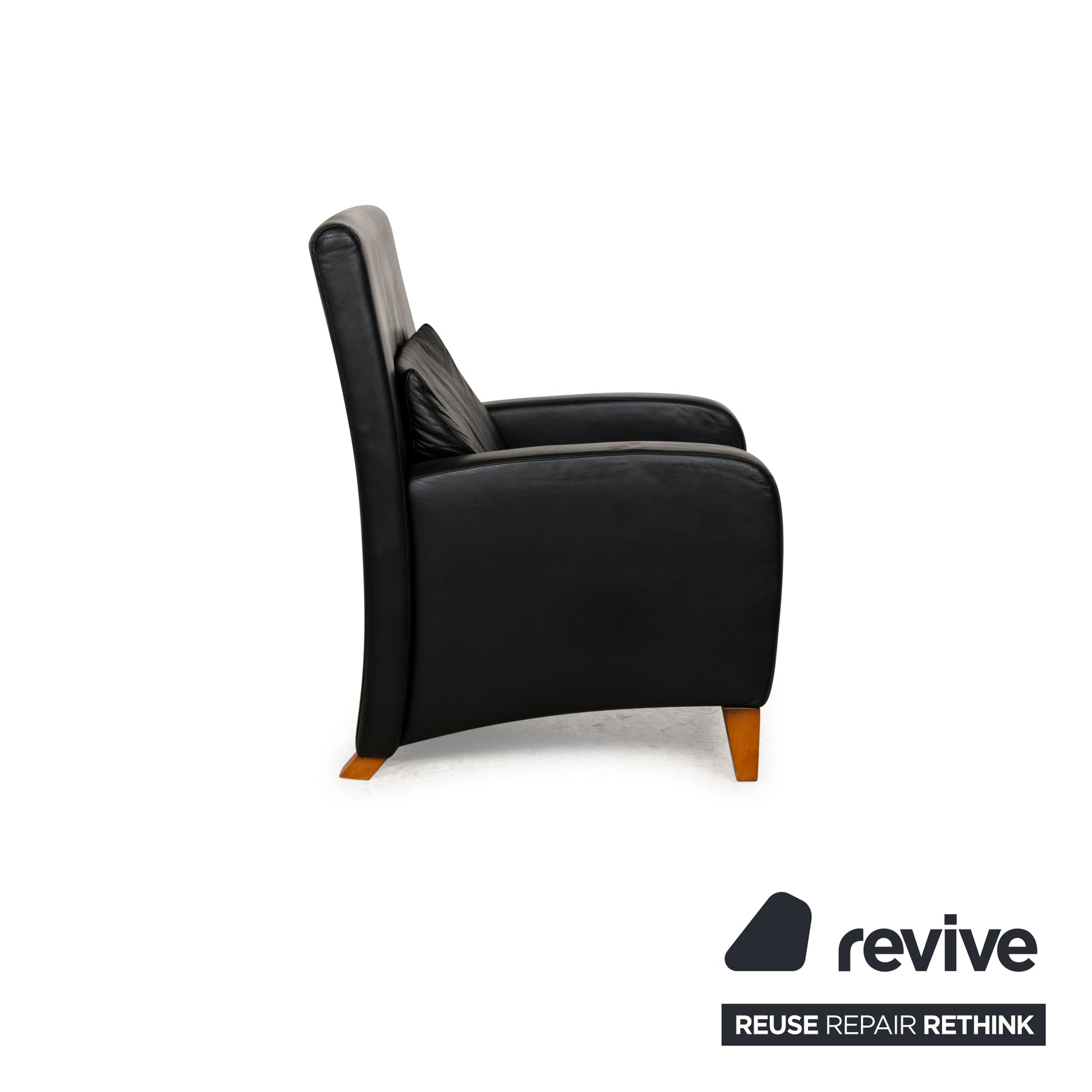 The armchair by Willi Schillig is upholstered in black leather and stands on angular brown wooden feet. It features a classic design with curved armrests and a high backrest, making it an easily combinable element in any modern living room.