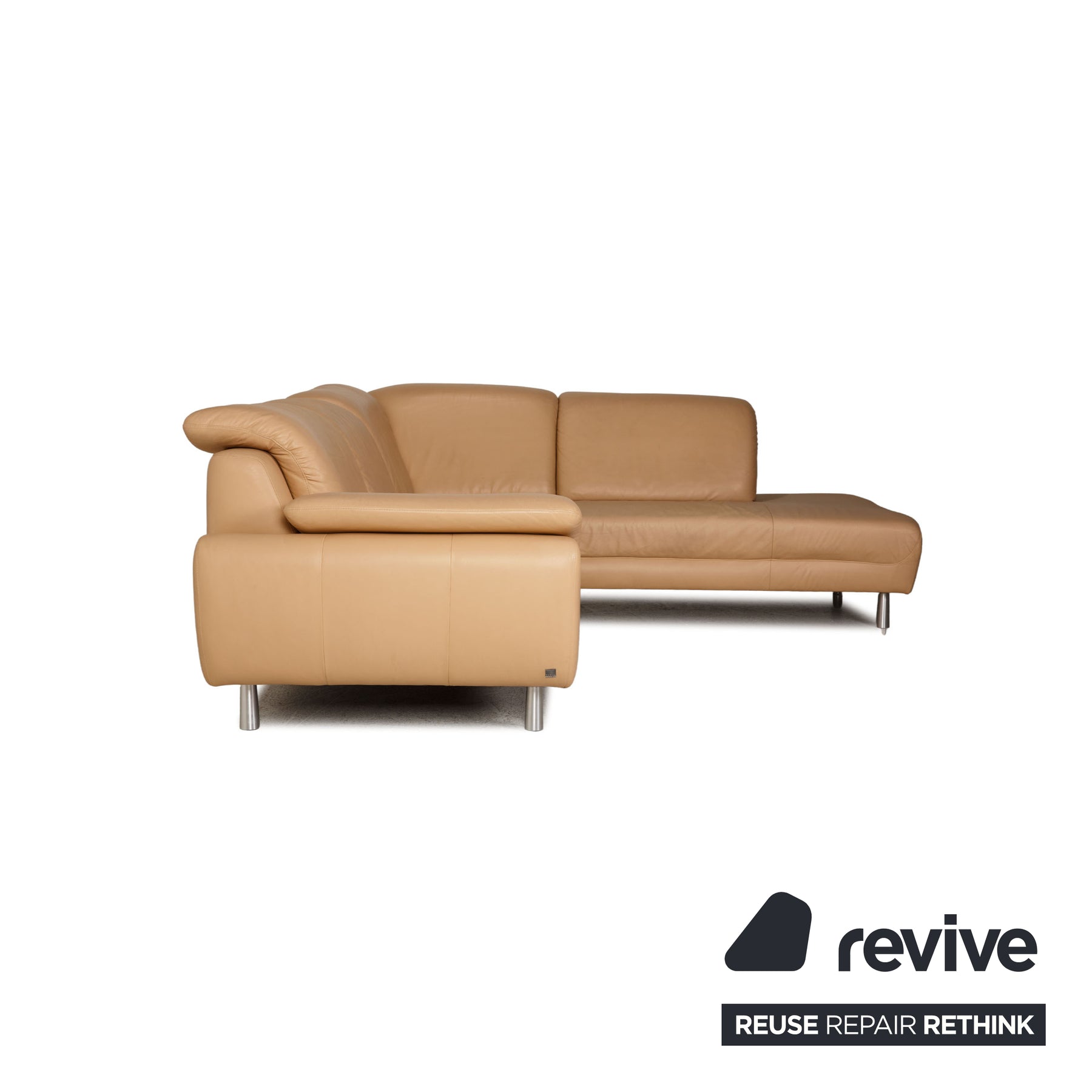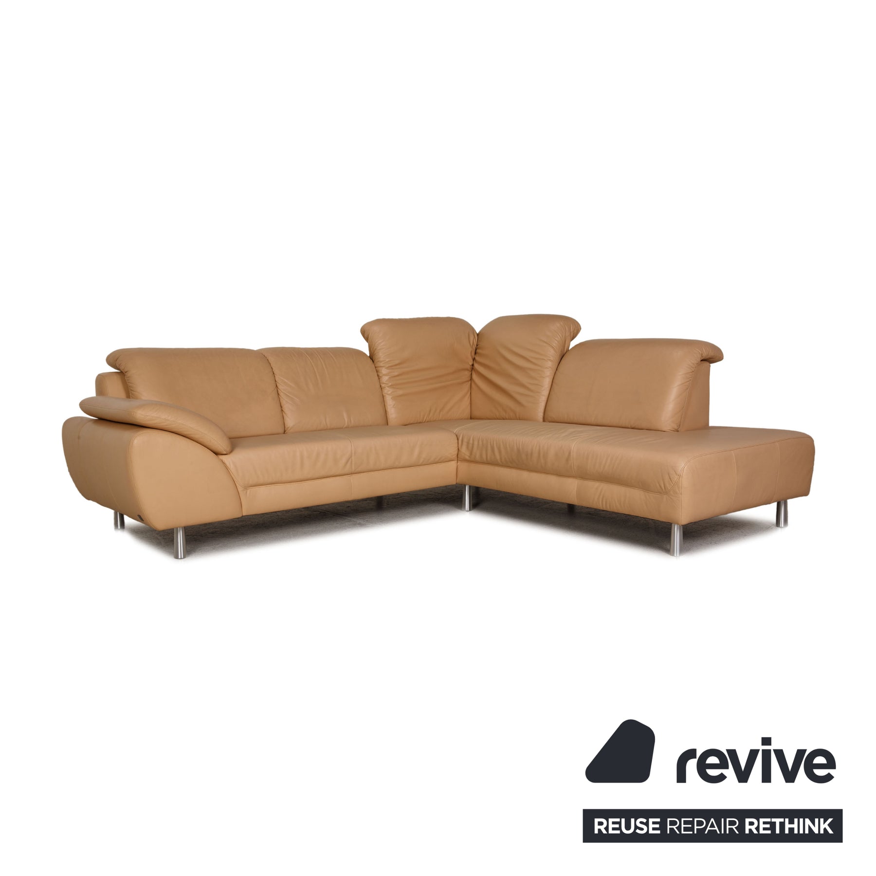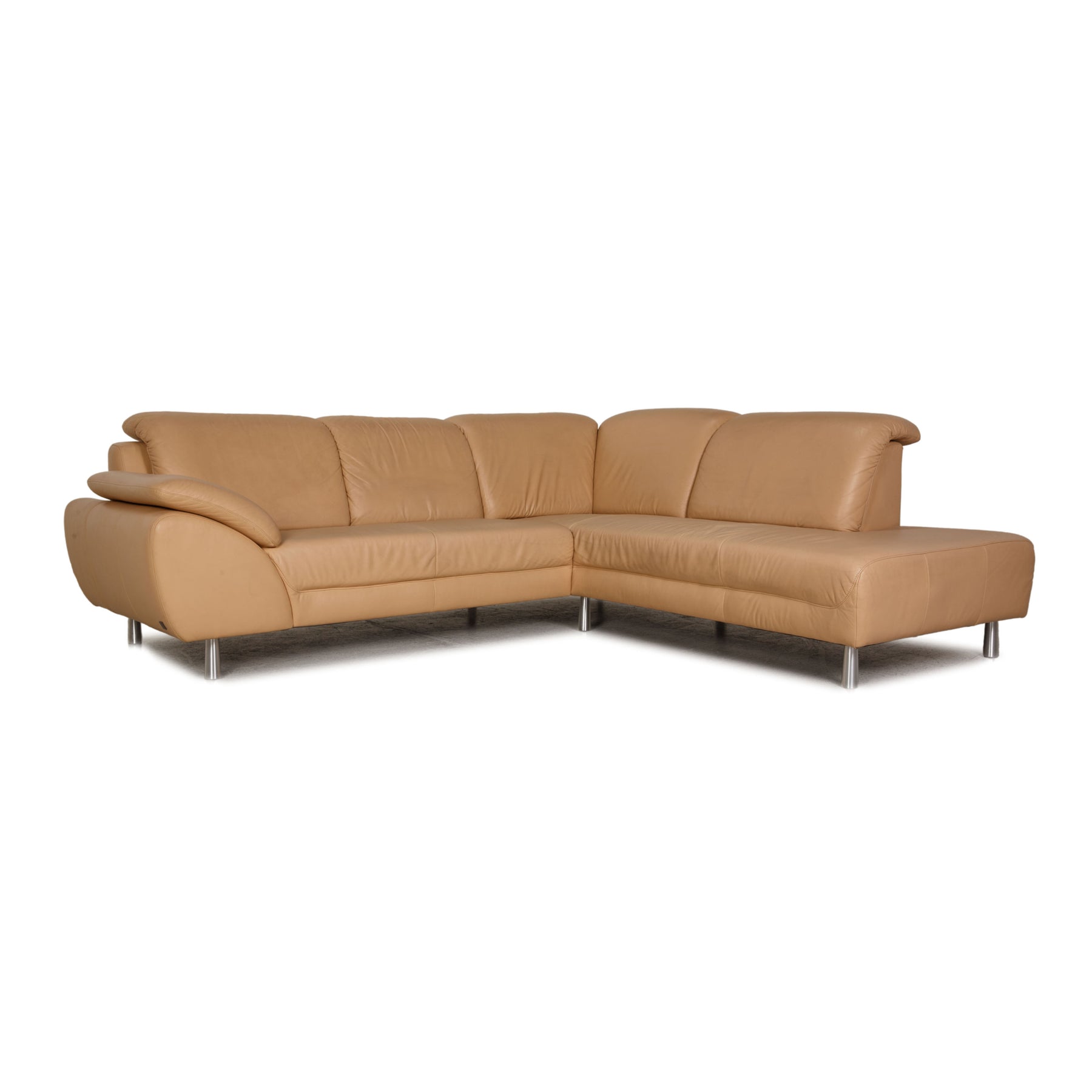 The sofa by Willi Schillig is covered with beige genuine leather and stands on silver metal feet. The classic, timeless design and the comfortable, adjustable headrests characterize the corner sofa.