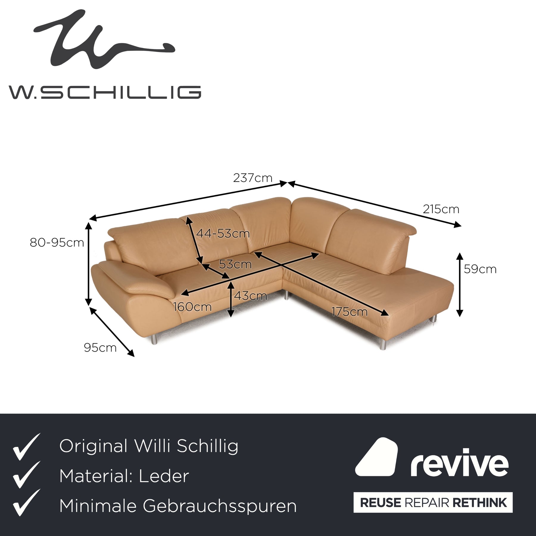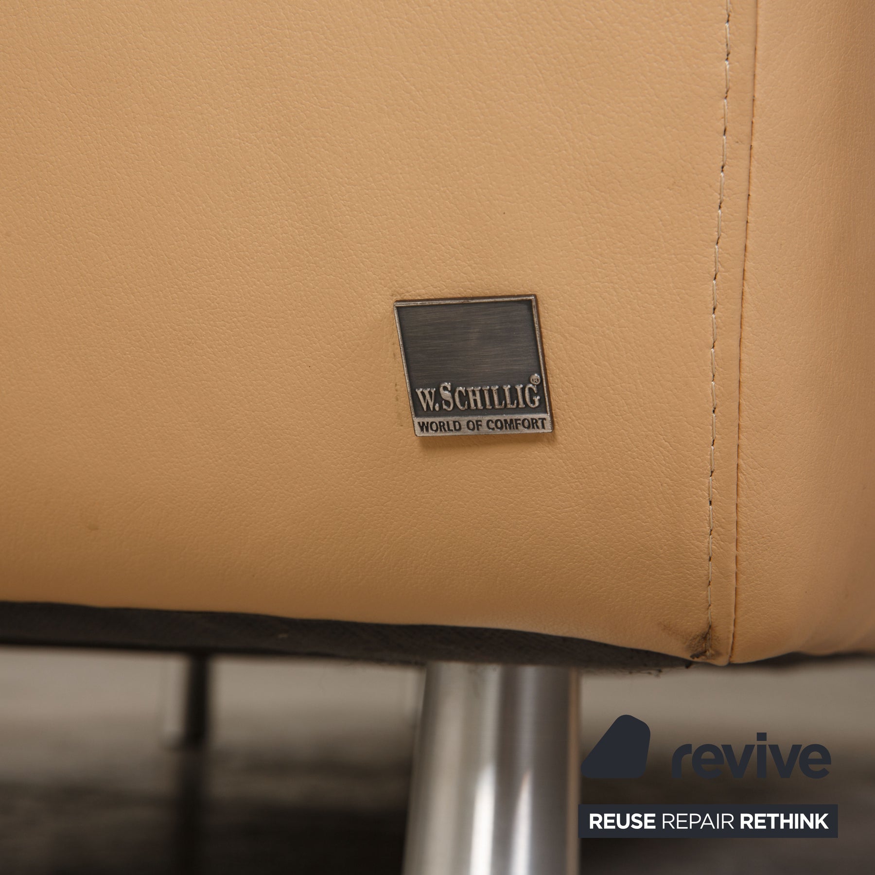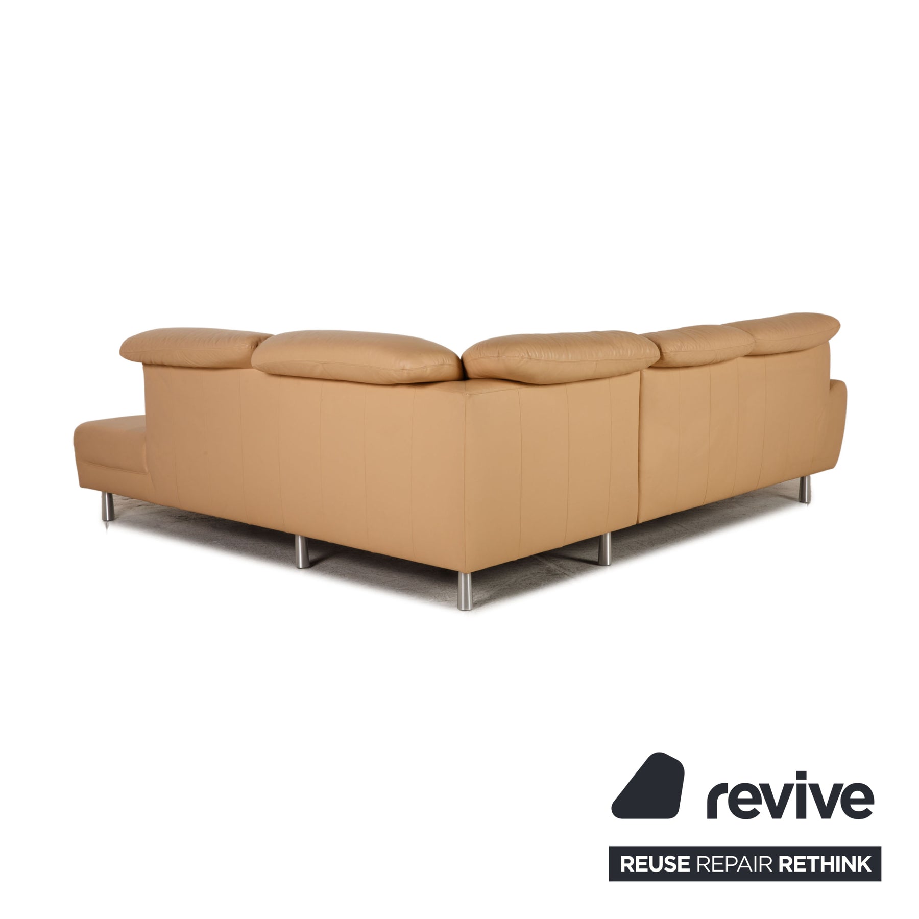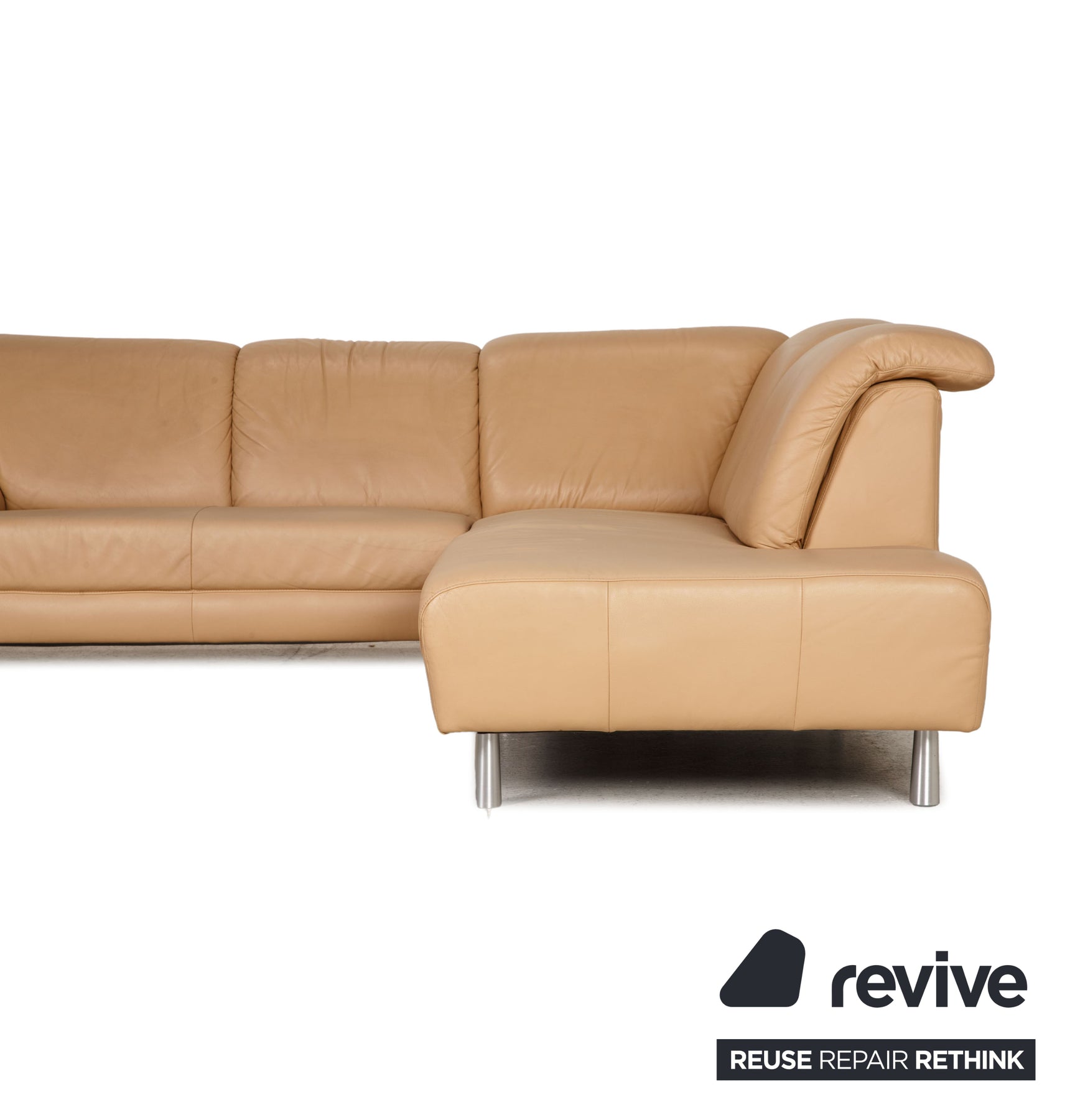 The sofa by Willi Schillig is covered with beige genuine leather and stands on silver metal feet. The classic, timeless design and the comfortable, adjustable headrests characterize the corner sofa.
