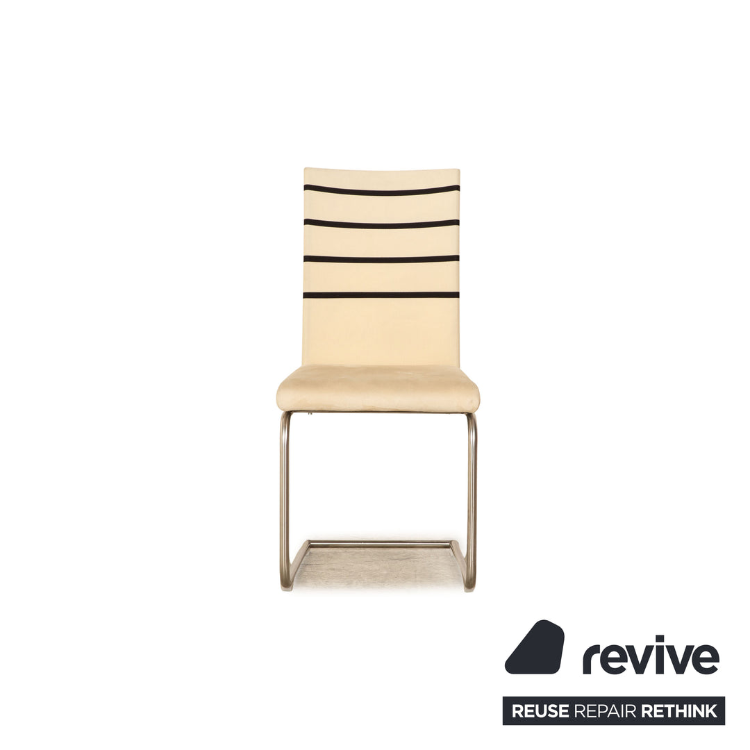 L'ensemble de chaises Valentina de Venjakob est recouvert d'un tissu de couleur crème et repose sur une structure métallique étroite. Il se caractérise par son aspect lumineux et harmonieux et son design minimaliste. L'ensemble se compose de quatre chaises.