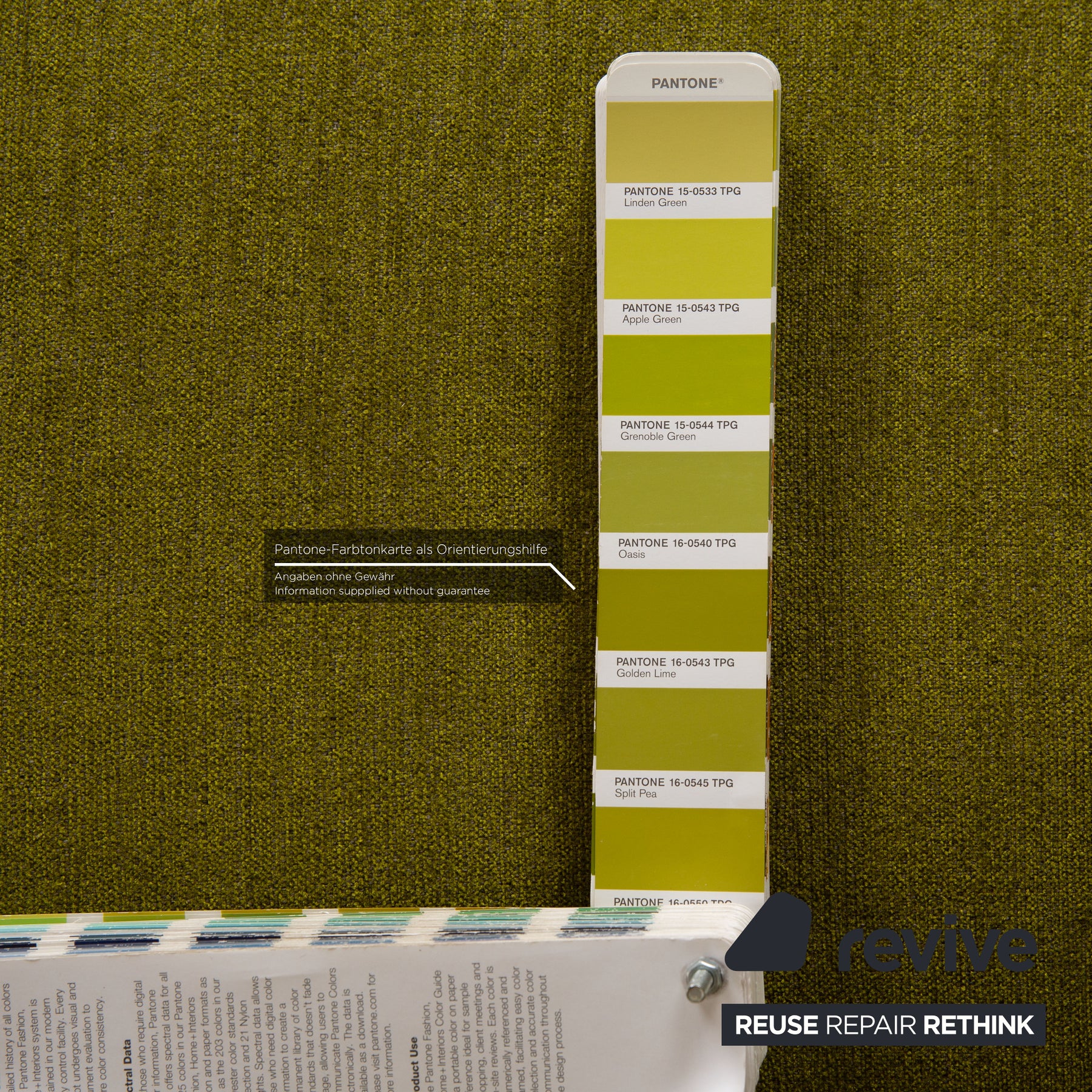 Le canapé Alanda de B&B Italia est recouvert d'un tissu vert et repose sur des pieds étroits. Le fauteuil trois places impressionne par sa tête et ses accoudoirs réglables et son design intemporel.