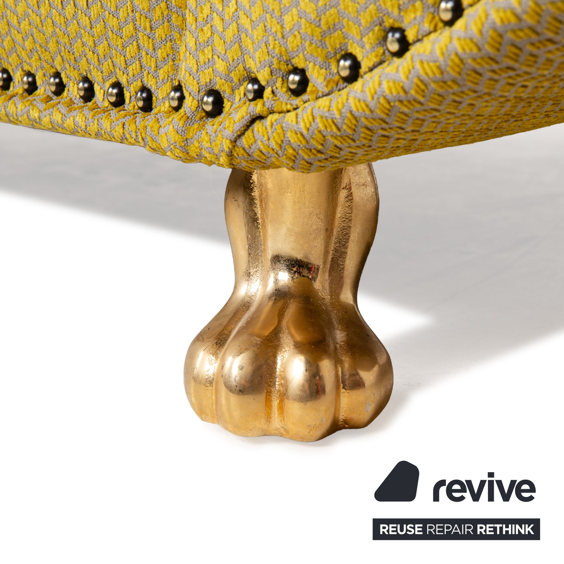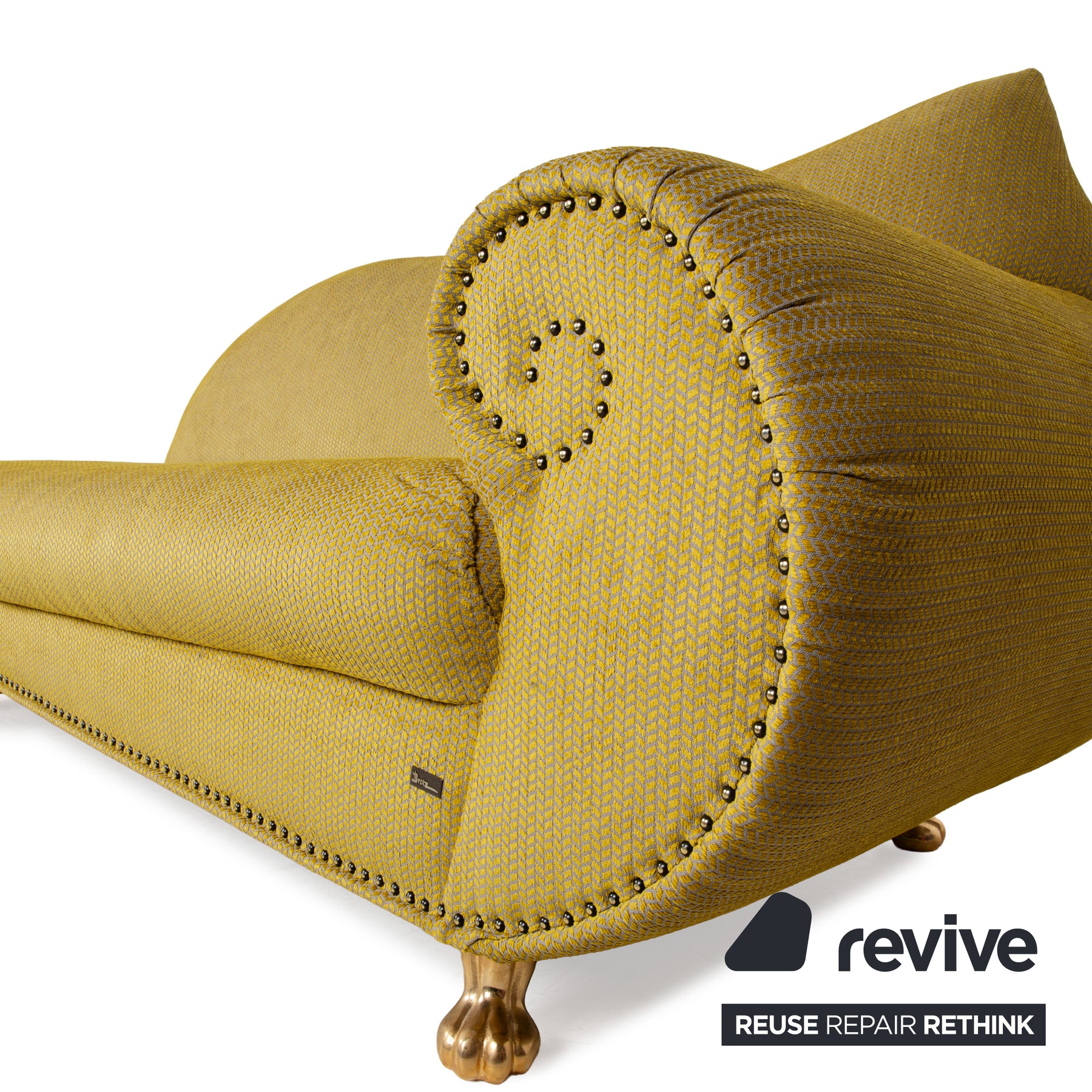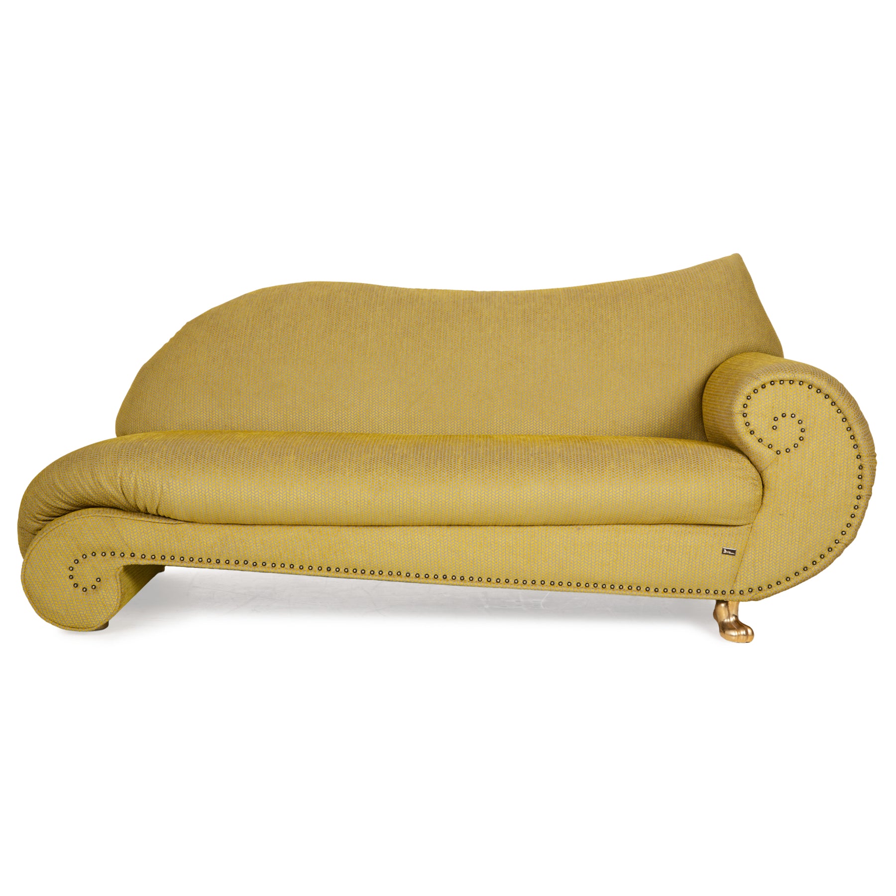 Montrez votre caractère avec le canapé Gaudi de Bretz, nouvellement recouvert de tissu de haute qualité (CALIMERA FR 850 de Höpke) dans un motif jaune-vert. Les courbes et l'extravagance en font un accroche-regard dans n'importe quelle pièce et le rembourrage doux vous invite à vous détendre. Le canapé trois places repose sur une base laquée or en forme de patte de lion et constitue un véritable atout dans le salon moderne.