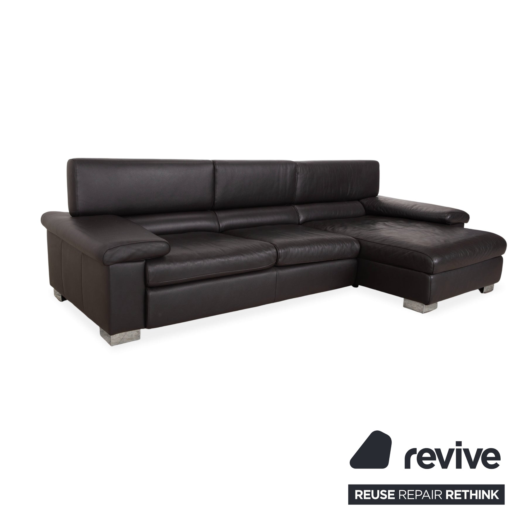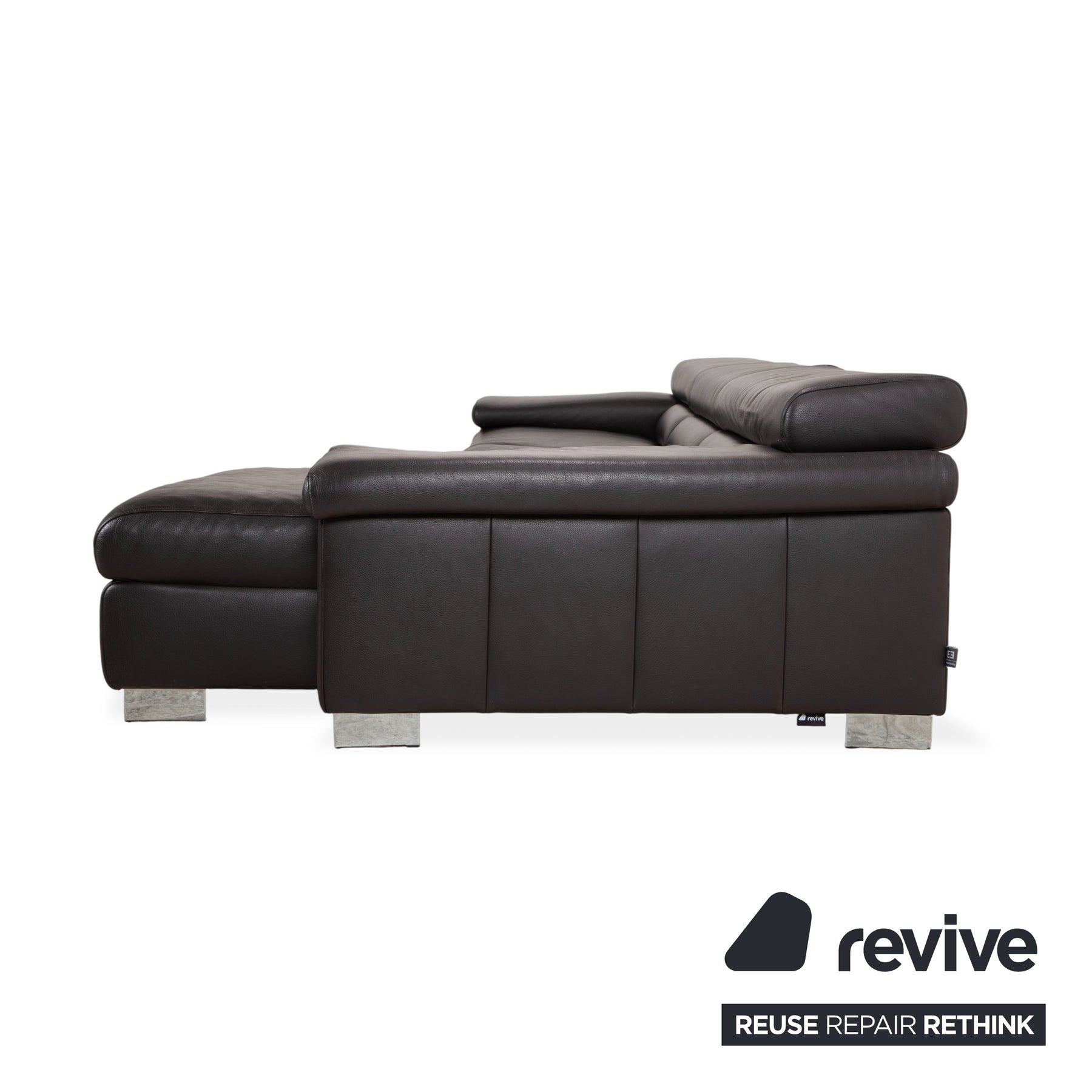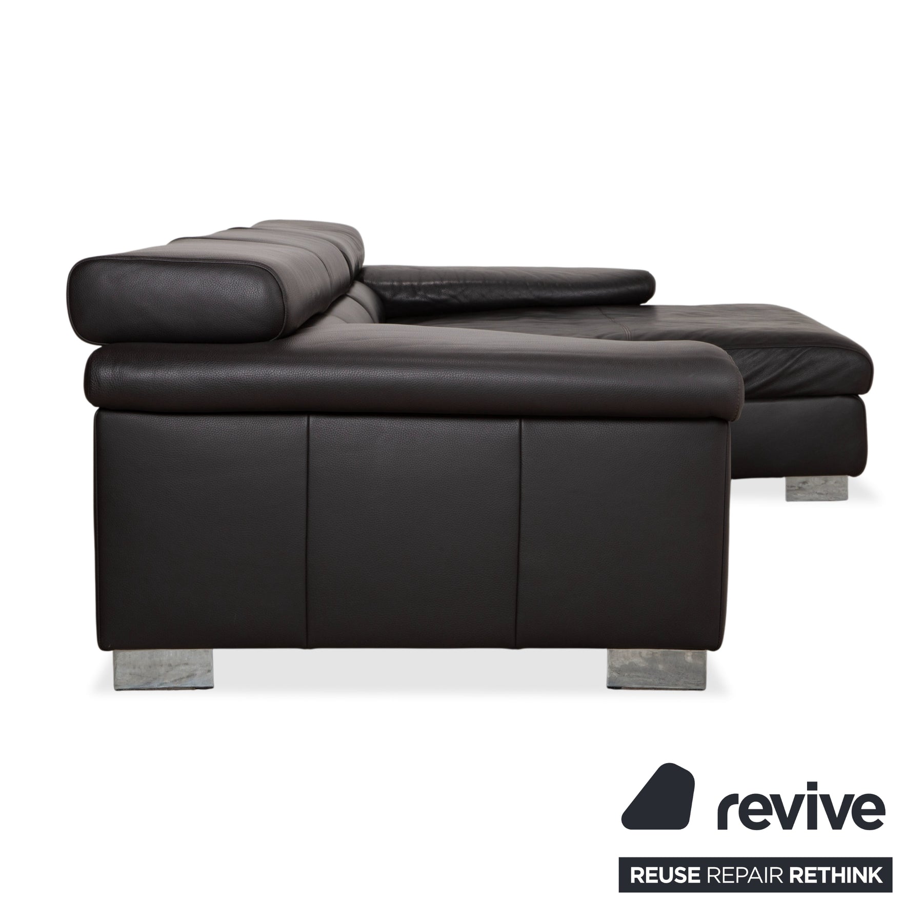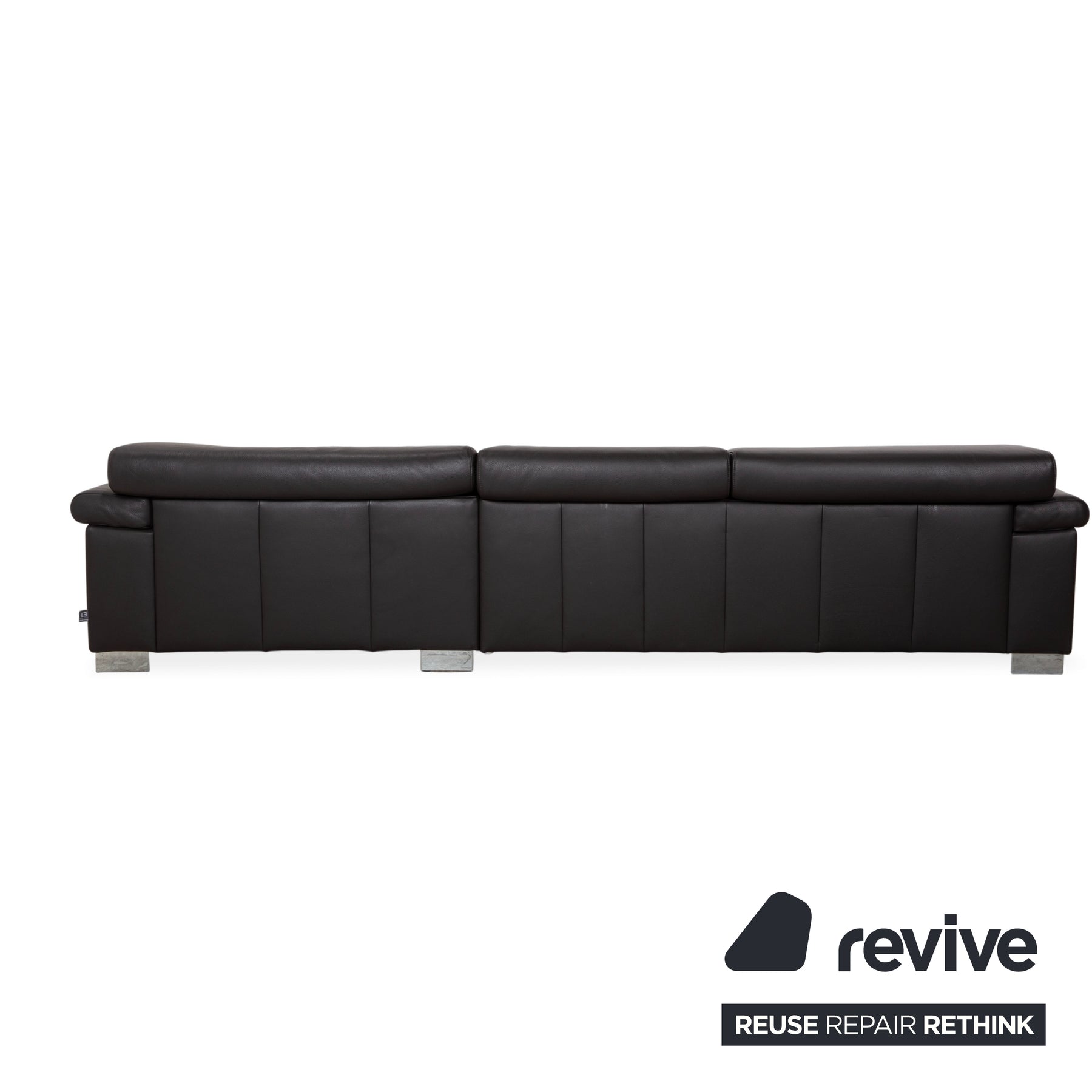 Le canapé est revêtu d'un cuir véritable de haute qualité, d'un brun foncé profond et riche. Cette couleur dégage une chaleur et un confort exceptionnels, et se révèle plus douce et accueillante que le noir austère. Le toucher naturel du cuir garantit sa durabilité et une température agréable en toute saison. Les pieds massifs chromés offrent un contraste moderne et épuré : ils assurent la stabilité du canapé tout en conférant à son design volumineux une allure à la fois élégante et aérienne.