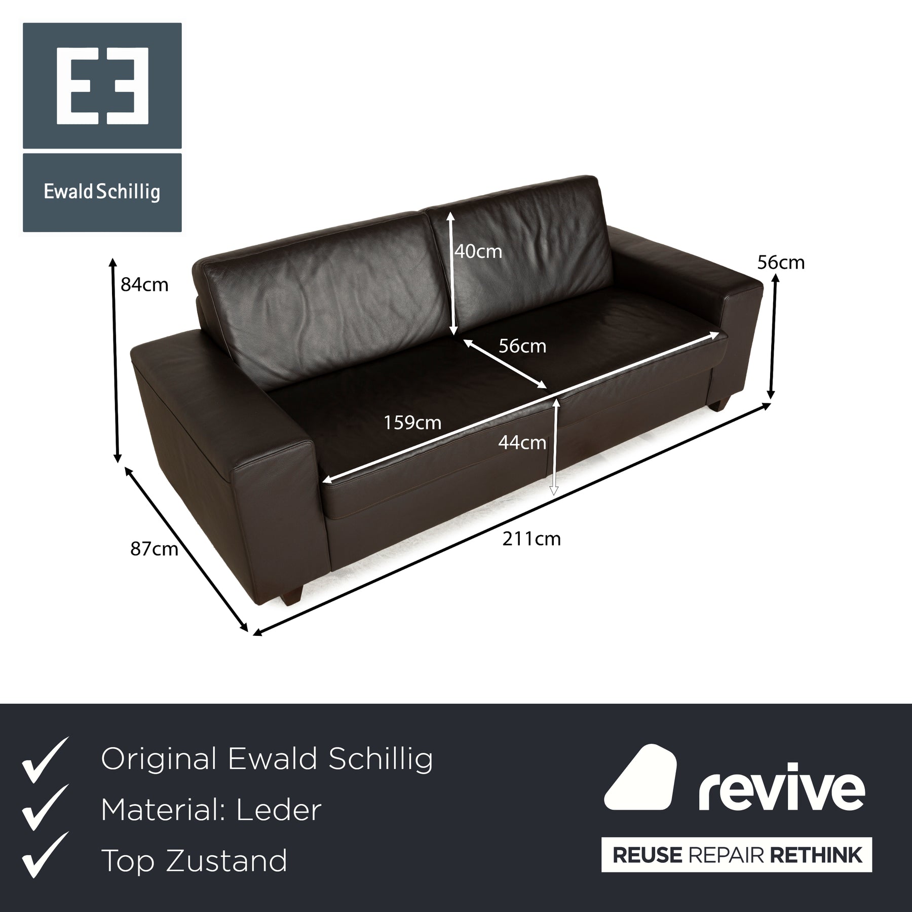 Canapé trois places en cuir marron foncé Ewald Schillig