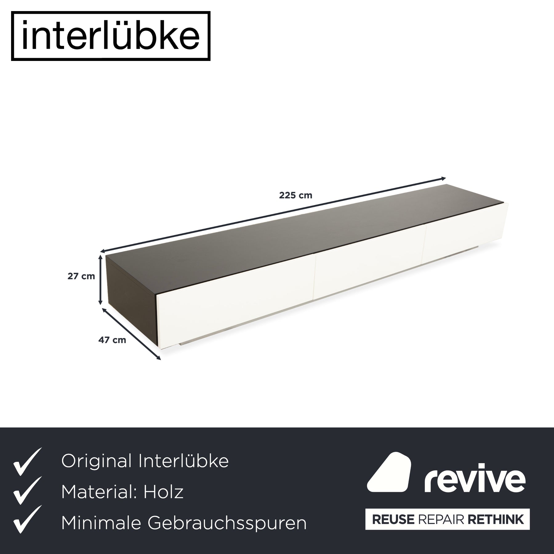 Le buffet bas mesure 225 cm de large, 27 cm de haut et 47 cm de profondeur. Derrière les deux façades sans poignées se trouvent deux tiroirs à gauche et à droite. Au centre se trouve une porte s'ouvrant vers le bas. Son design s'inscrit dans la lignée des codes d'Interlübke : fonctionnalité, clarté et finitions soignées.