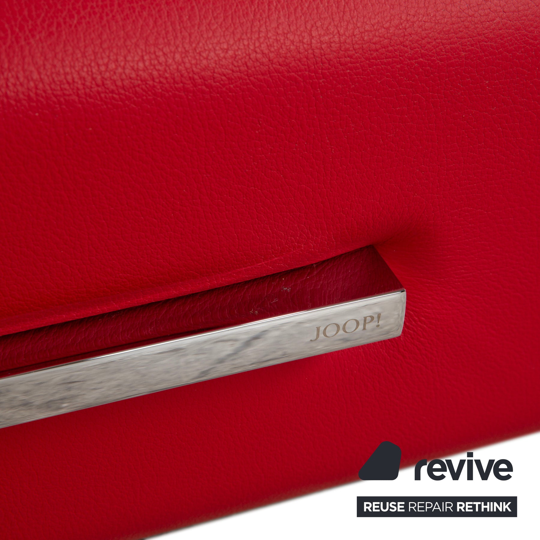 Die weiche, rund ausgeformte Lederfront trifft auf einen chromfarbenen Griff, der dem Stück eine elegante, designerhafte Note gibt. Unten ruht der Tisch auf einem dezenten Metallrahmen, der das rote Leder optisch anhebt.
