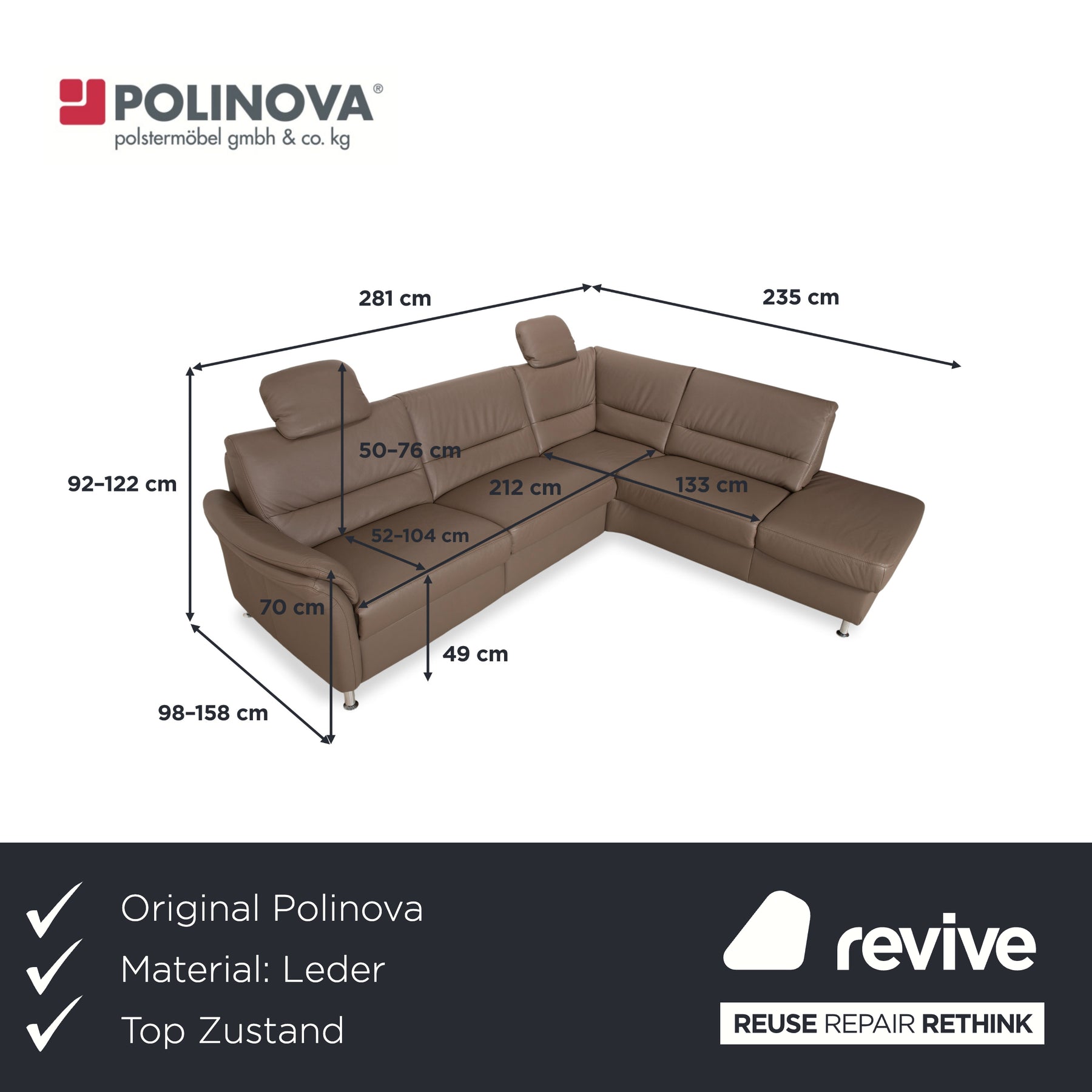 Dieses Polinova Ecksofa ist ein echtes Highlight für dein Wohnzimmer, wenn du auf der Suche nach maximalem Komfort und einer modernen Optik bist. Der Korpus ist in einem schicken Leder in Taupe gehalten, das eigentlich zu jeder Einrichtung gut passt. Durch die großzügige L-Form nutzt du den vorhandenen Platz perfekt aus und schaffst eine strukturierte Wohnlandschaft, die zum Entspannen einlädt.