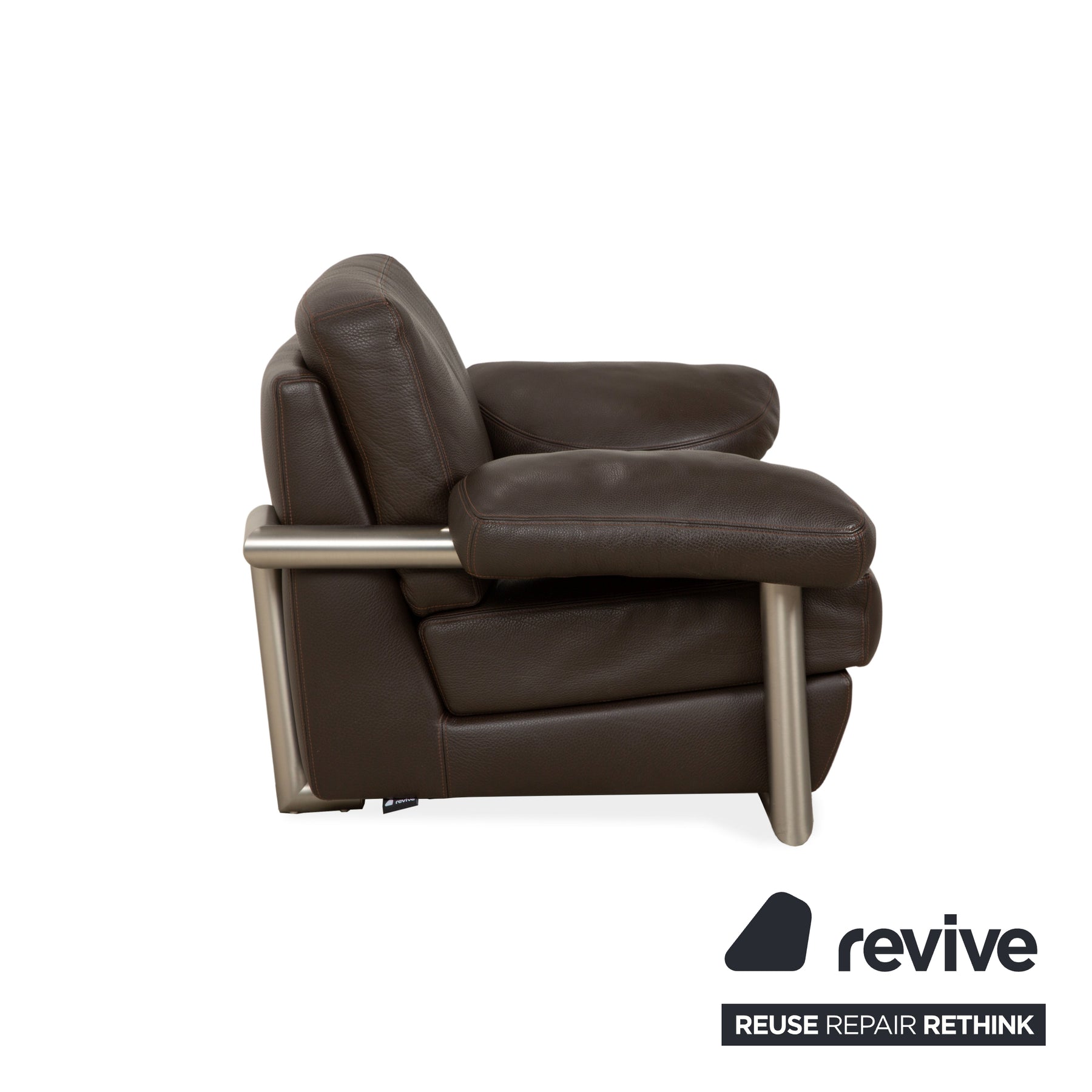 L'ensemble se compose d'un canapé quatre places, d'une méridienne et d'un fauteuil Medea d'Astanova. Revêtus de cuir marron foncé, tous les éléments de l'ensemble affichent un design à la fois classique et moderne. Les éléments métalliques des accoudoirs et des pieds contrastent avec la douceur du revêtement. Le designer Michael C. Brandis s'est inspiré du style Bauhaus pour créer un ensemble aux formes fonctionnelles et intemporelles.
