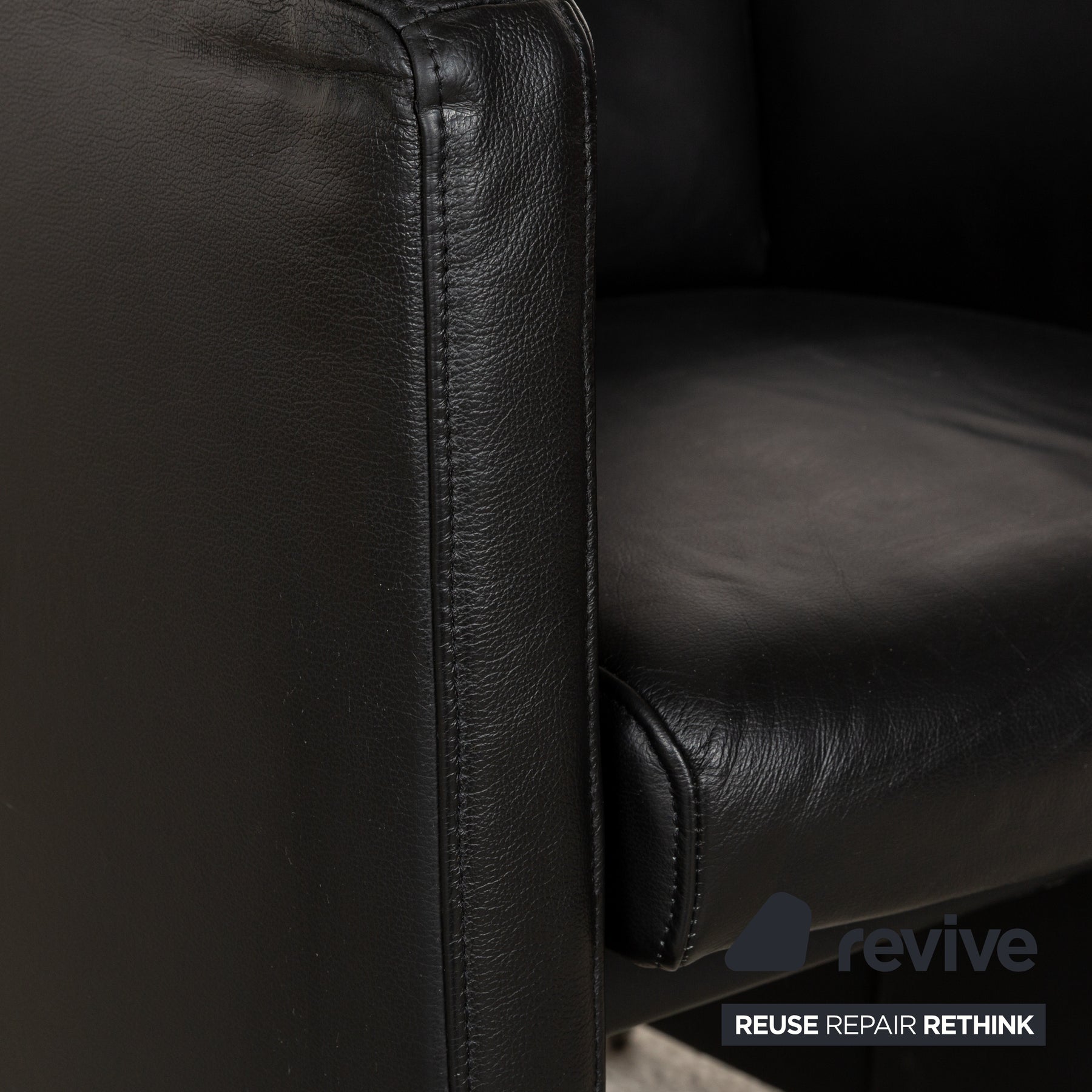 Le fauteuil Himolla est recouvert de cuir véritable noir et repose sur de petites roulettes. Les accoudoirs pratiques et le design intemporel le caractérisent.