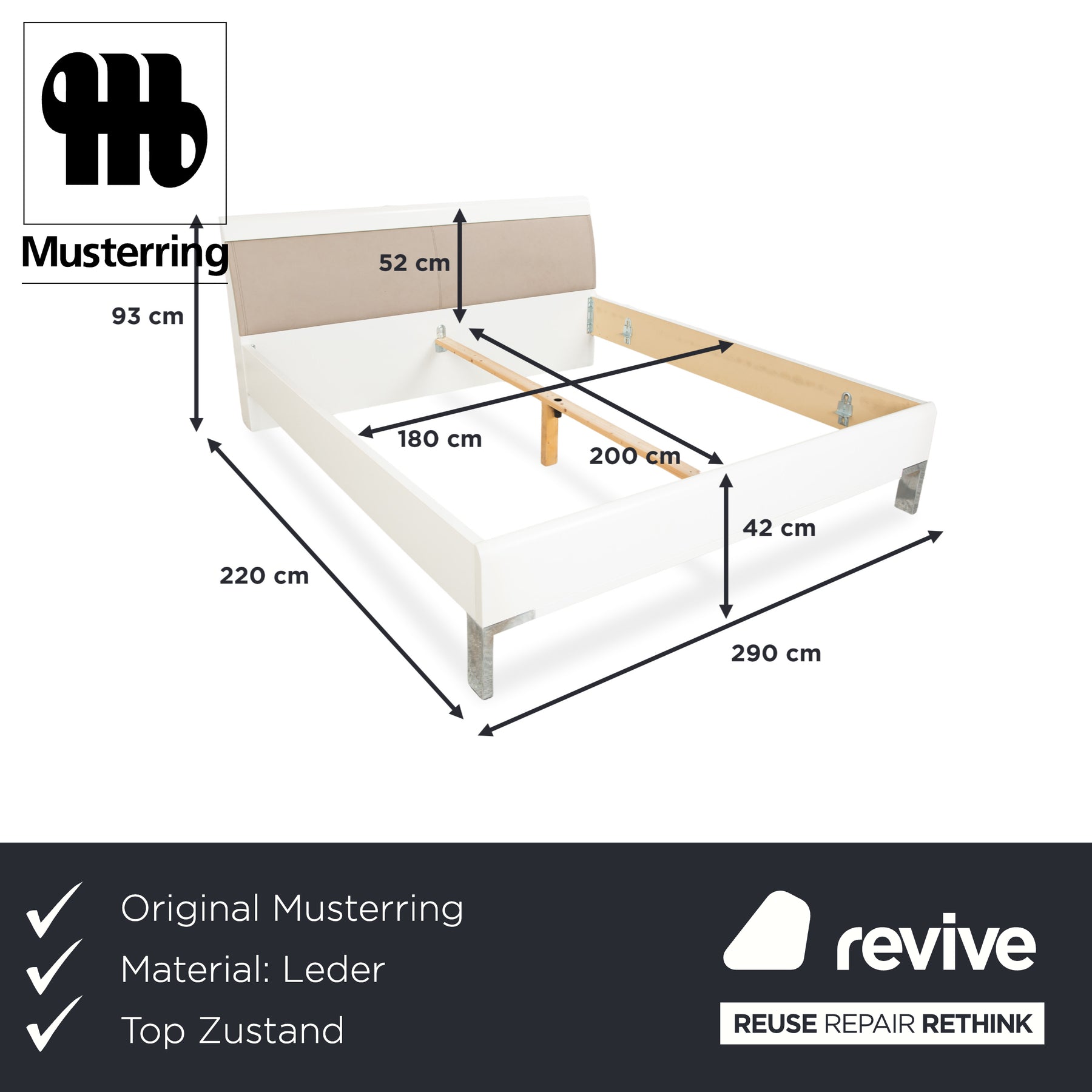 Ce lit Musterring allie un design épuré et moderne à une combinaison de bois et de cuir de haute qualité. La structure, d'une élégante teinte de bois clair, confère au meuble un charme chaleureux et intemporel. La tête de lit, revêtue d'un cuir beige lisse, apporte une touche de douceur et de sophistication tout en assurant un confort optimal. Sa construction robuste et soignée, associée à ses pieds en métal épurés, lui donne une allure moderne et aérienne. En somme, ce lit se présente comme un meuble élégant et discret, d'une grande qualité, qui s'intègre harmonieusement à de nombreuses chambres. Le chant est absent sur un côté de la tête de lit, laissant apparaître le bord brut.