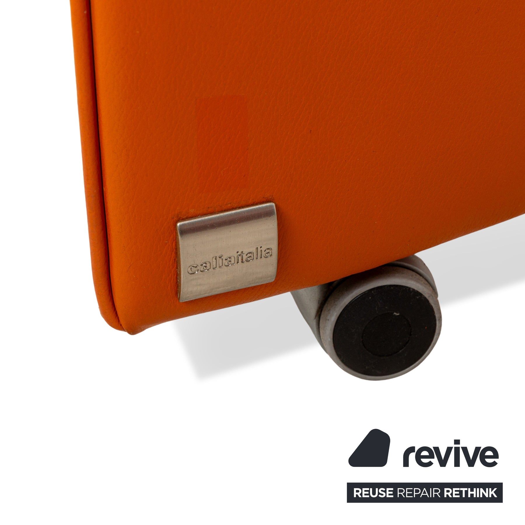 Le fauteuil Calia est recouvert de cuir véritable orange et repose sur des roulettes noires. Il se caractérise par son look aéré et minimaliste et son design aux lignes droites.