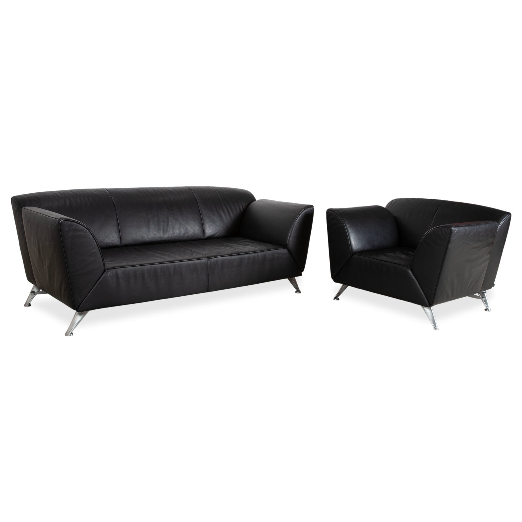 Dieses Set besteht aus dem Jori JR-8100 Zweisitzer und dem passenden Sessel. Hier holst du dir eine erstklassige Sitzgruppe nach Hause, die für belgische Designkunst und kompromisslosen ergonomischen Komfort steht. Die Kombination aus tiefschwarzem Leder und den elegant geschwungenen Metallfüßen bilden bei beiden Möbelstücken einen schönen Kontrast und sorgen für diesen unverwechselbaren, kantigen Look. In dieser Ausführung aus schwarzem Leder wirkt beides auch extrem präsent und souverän im Raum, ohne dabei die einladende Art zu verlieren.