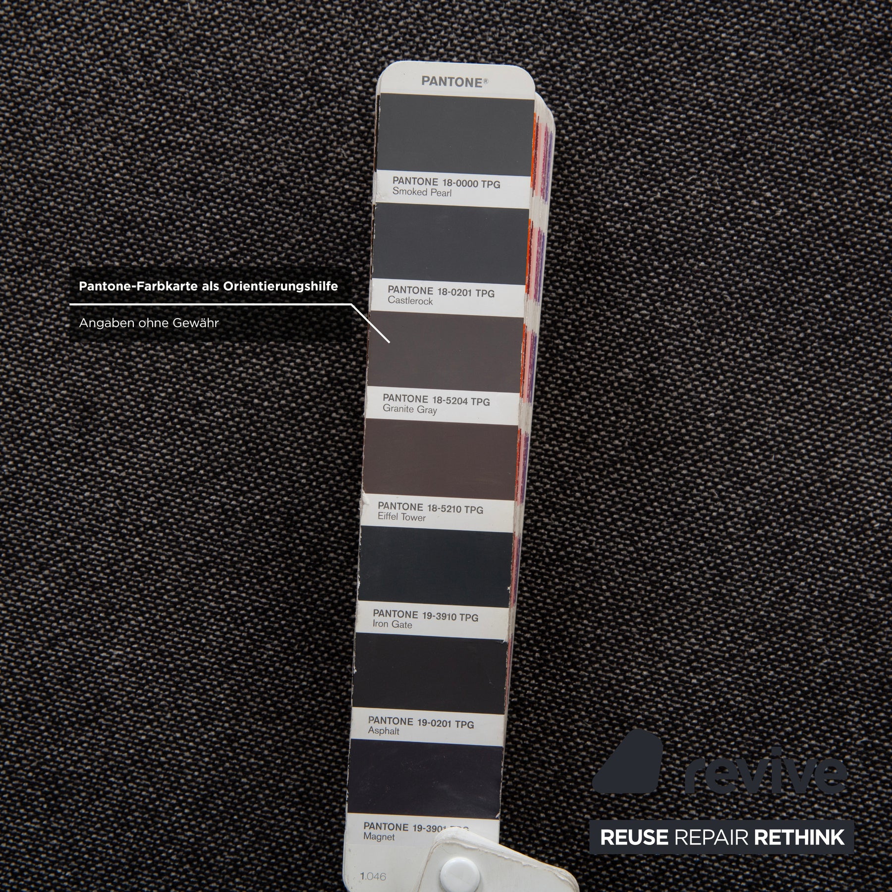 Der dunkelgraue Stoffbezug hat eine feine Struktur, die dem Möbelstück Tiefe und eine hochwertige, unempfindliche Haptik verleiht. Das Design ist typisch Nuvola: Großzügig, weich und bodenständig, aber durch die schwarzen, filigranen Metallfüße optisch leicht und fast schwebend.