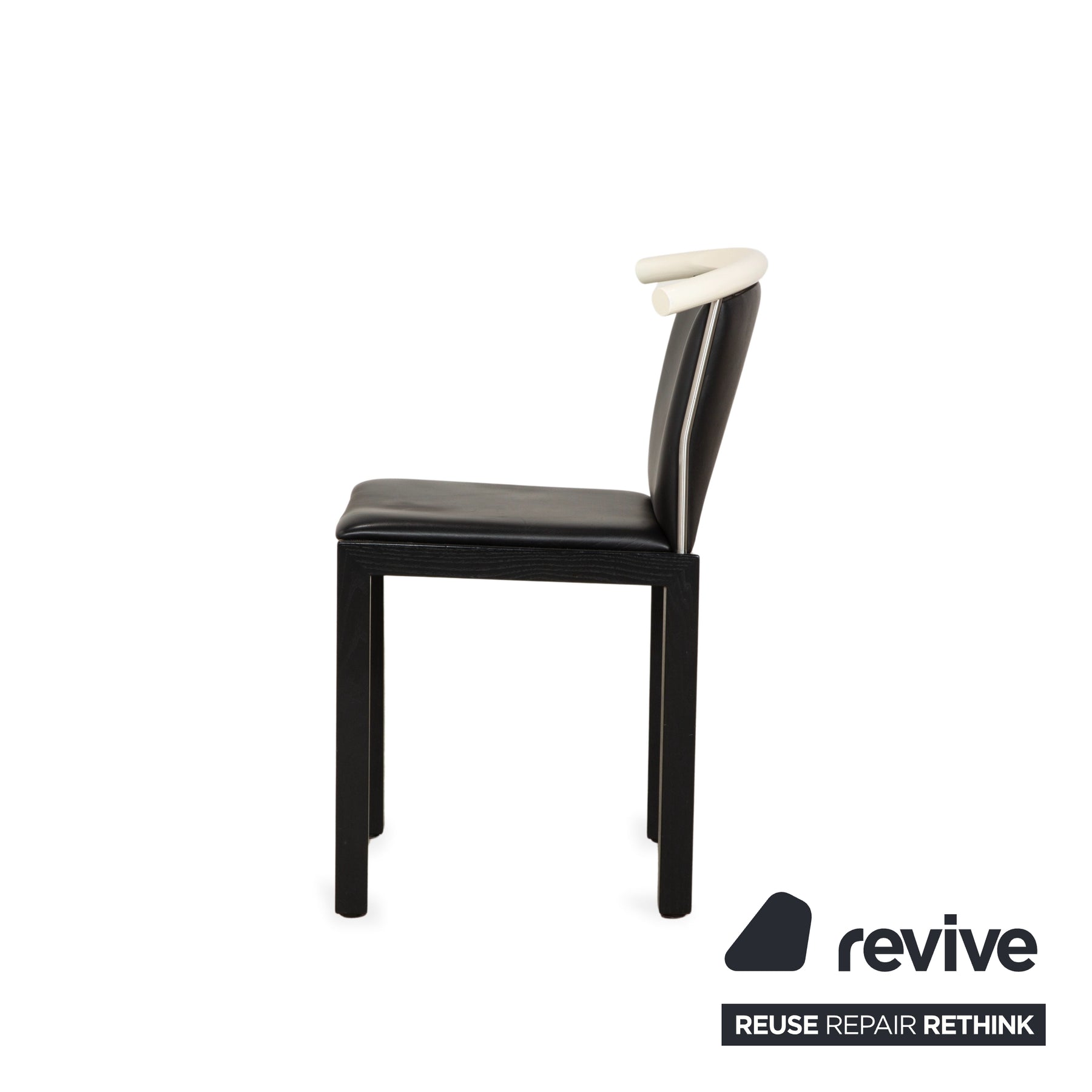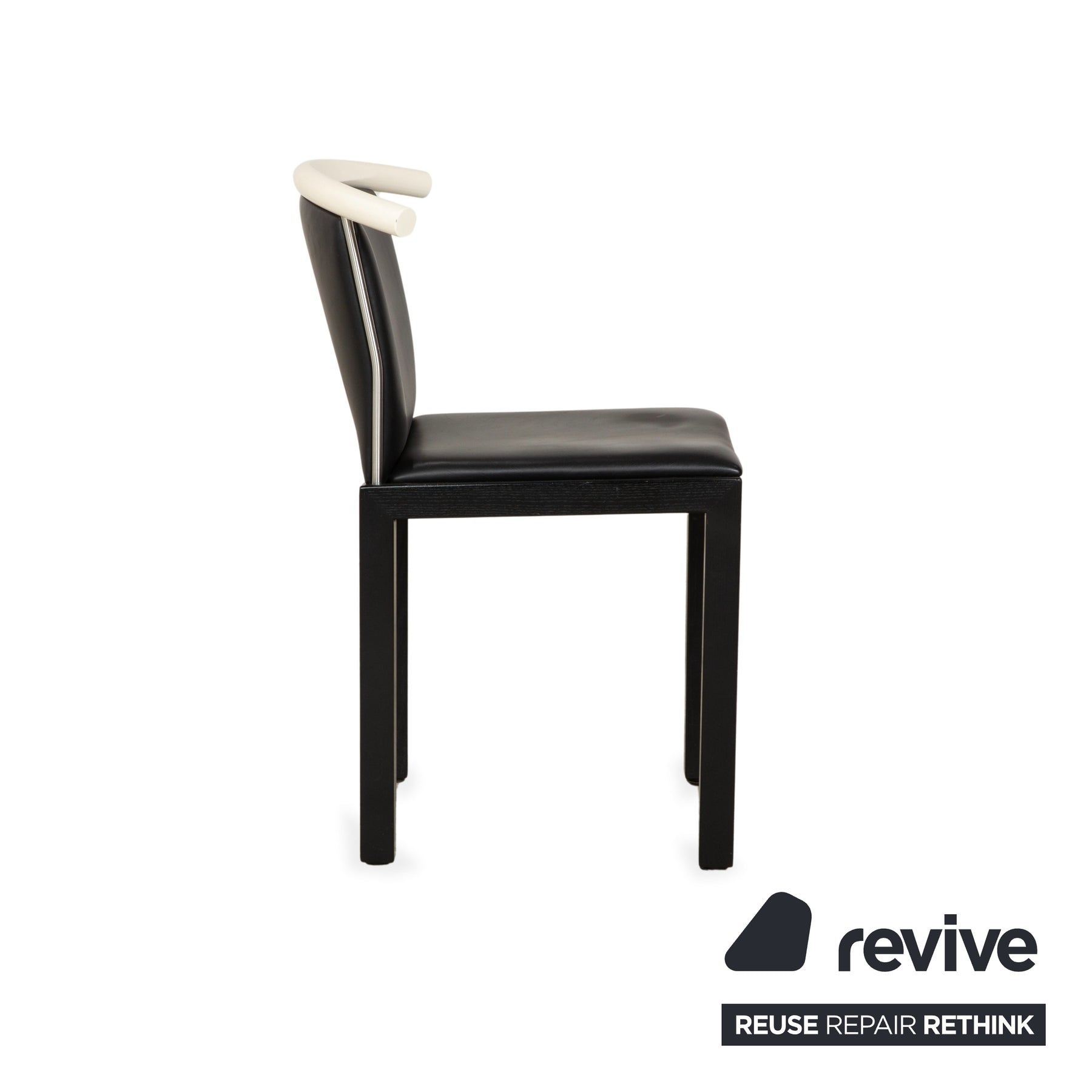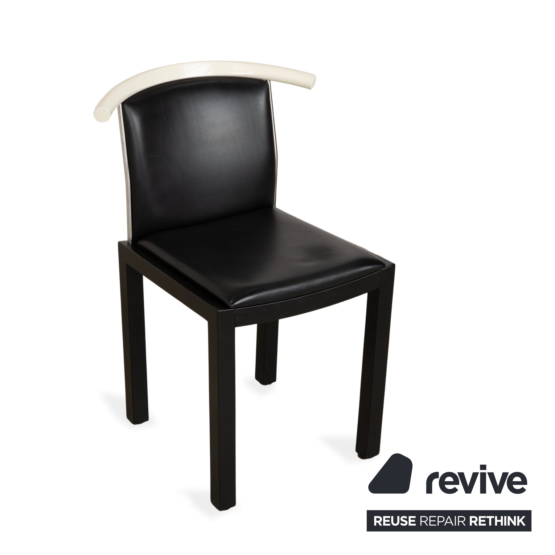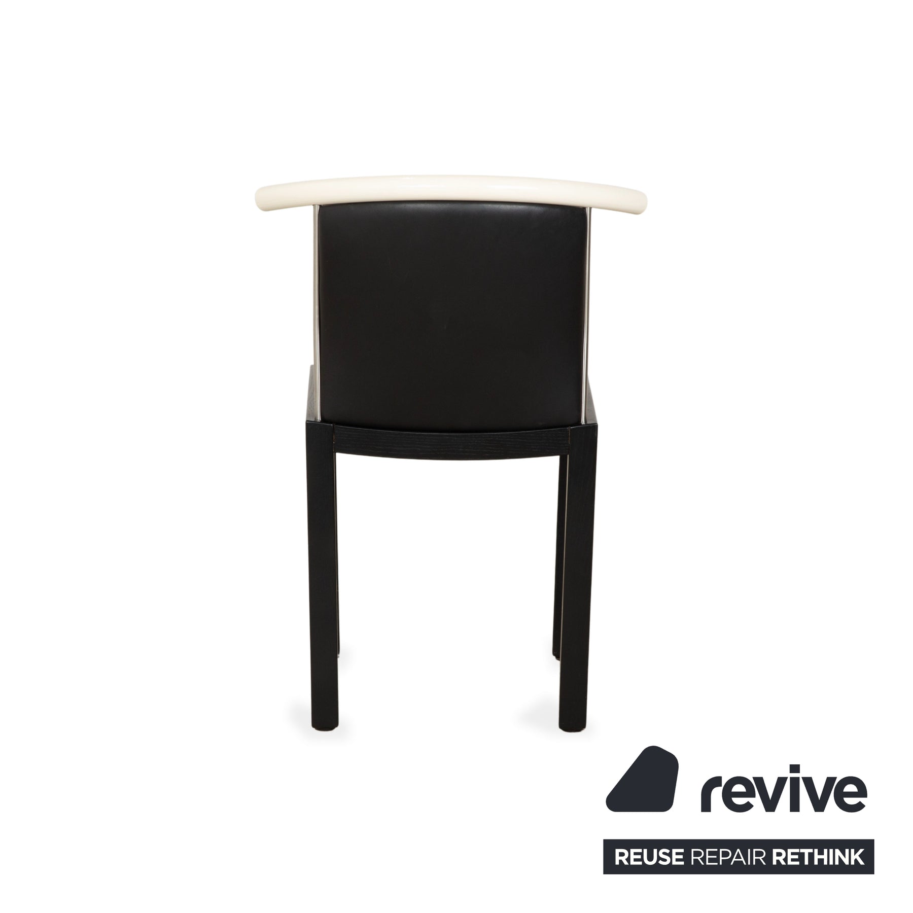 Die Stühle verfügen über ein stabiles Gestell aus schwarzem Holz und passende schwarze Holzbeine. Sitzfläche und Rückenlehne sind mit schwarzem Leder bezogen. Die klare Linienführung, die kontrastreiche Kombination aus Schwarz und Weiß sowie die hochwertigen Materialien machen die Garnitur zu einem modernen Klassiker für Ess- oder Wohnbereiche.