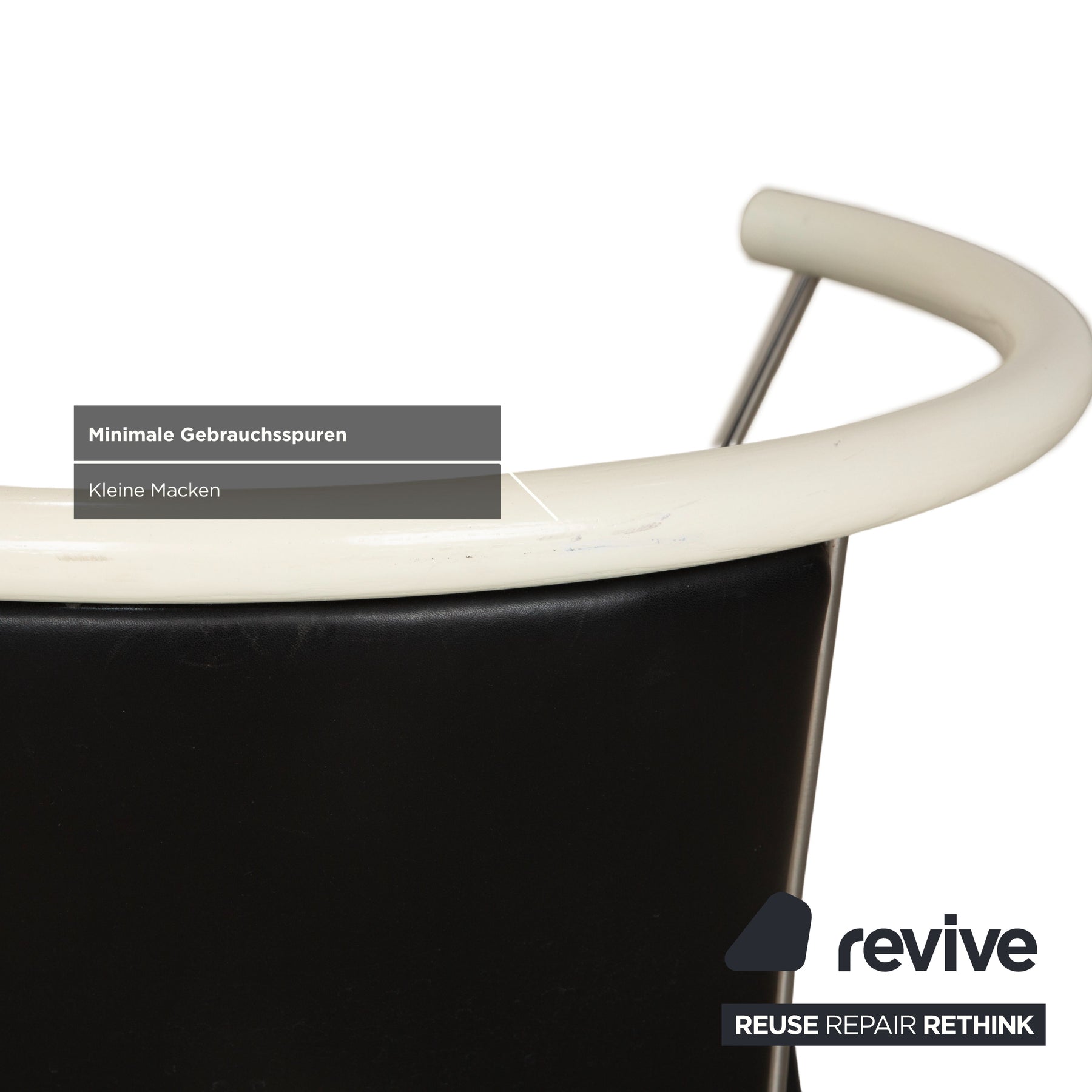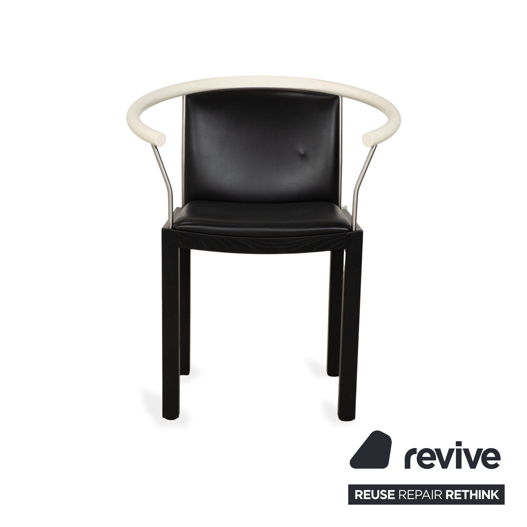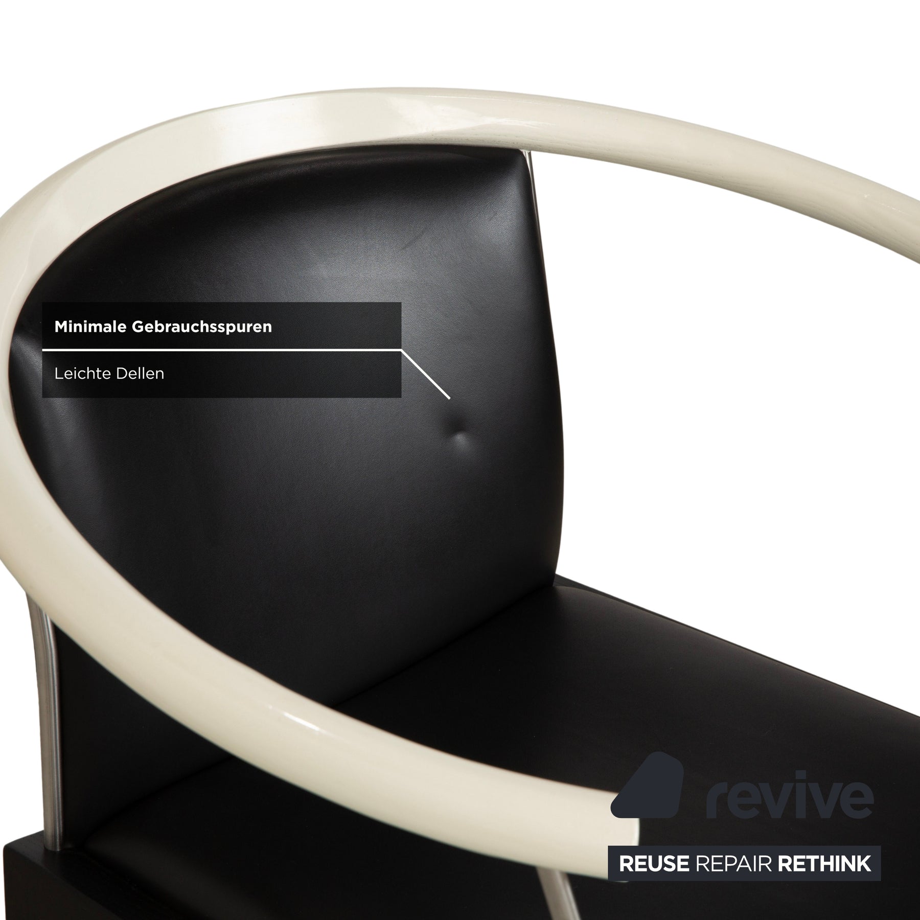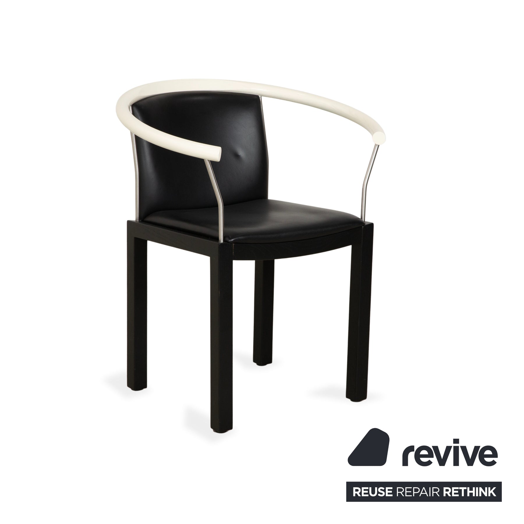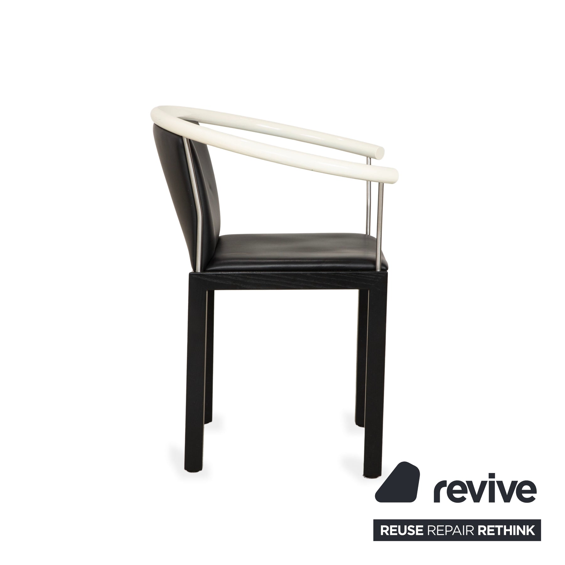 Die Stühle verfügen über ein stabiles Gestell aus schwarzem Holz und passende schwarze Holzbeine. Sitzfläche und Rückenlehne sind mit schwarzem Leder bezogen. Die klare Linienführung, die kontrastreiche Kombination aus Schwarz und Weiß sowie die hochwertigen Materialien machen die Garnitur zu einem modernen Klassiker für Ess- oder Wohnbereiche.